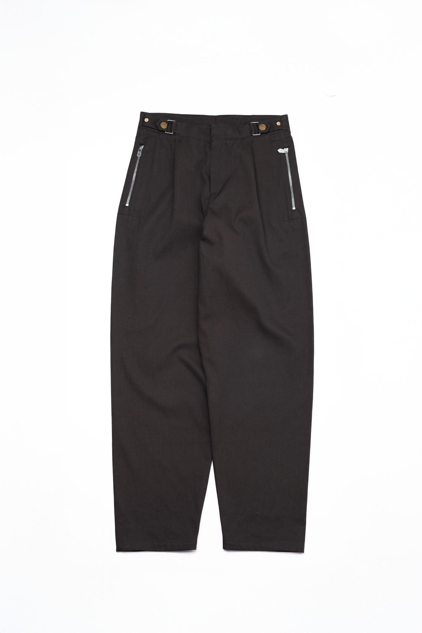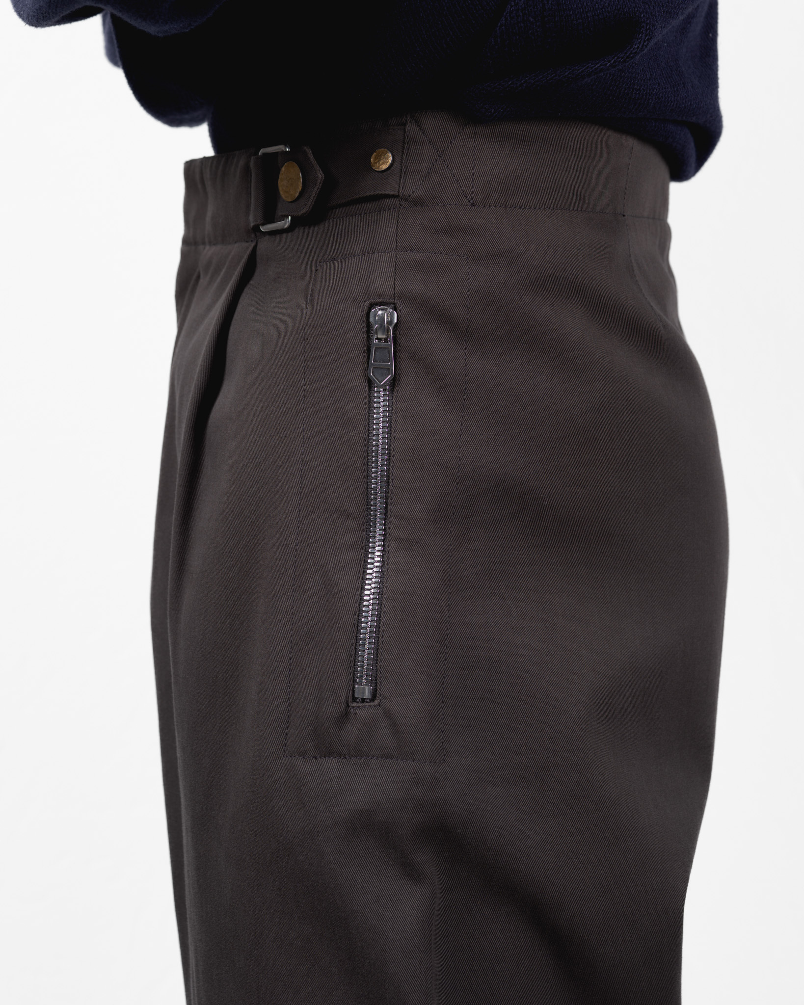 腰回りに立体的な余白を生み、そこから裾へ向けてシャープにテーパードします。