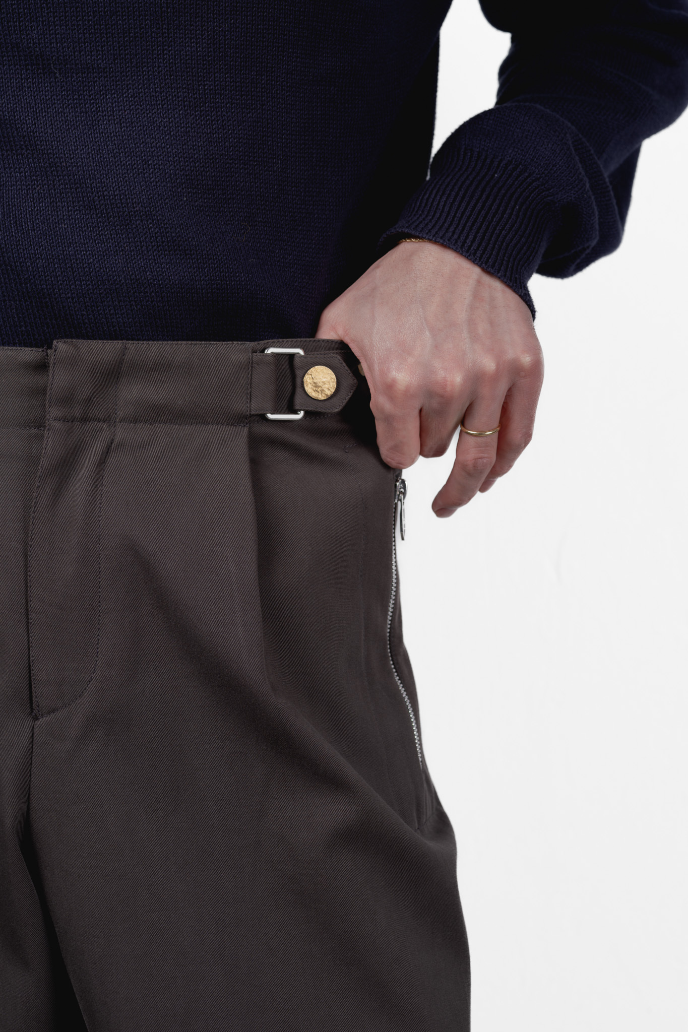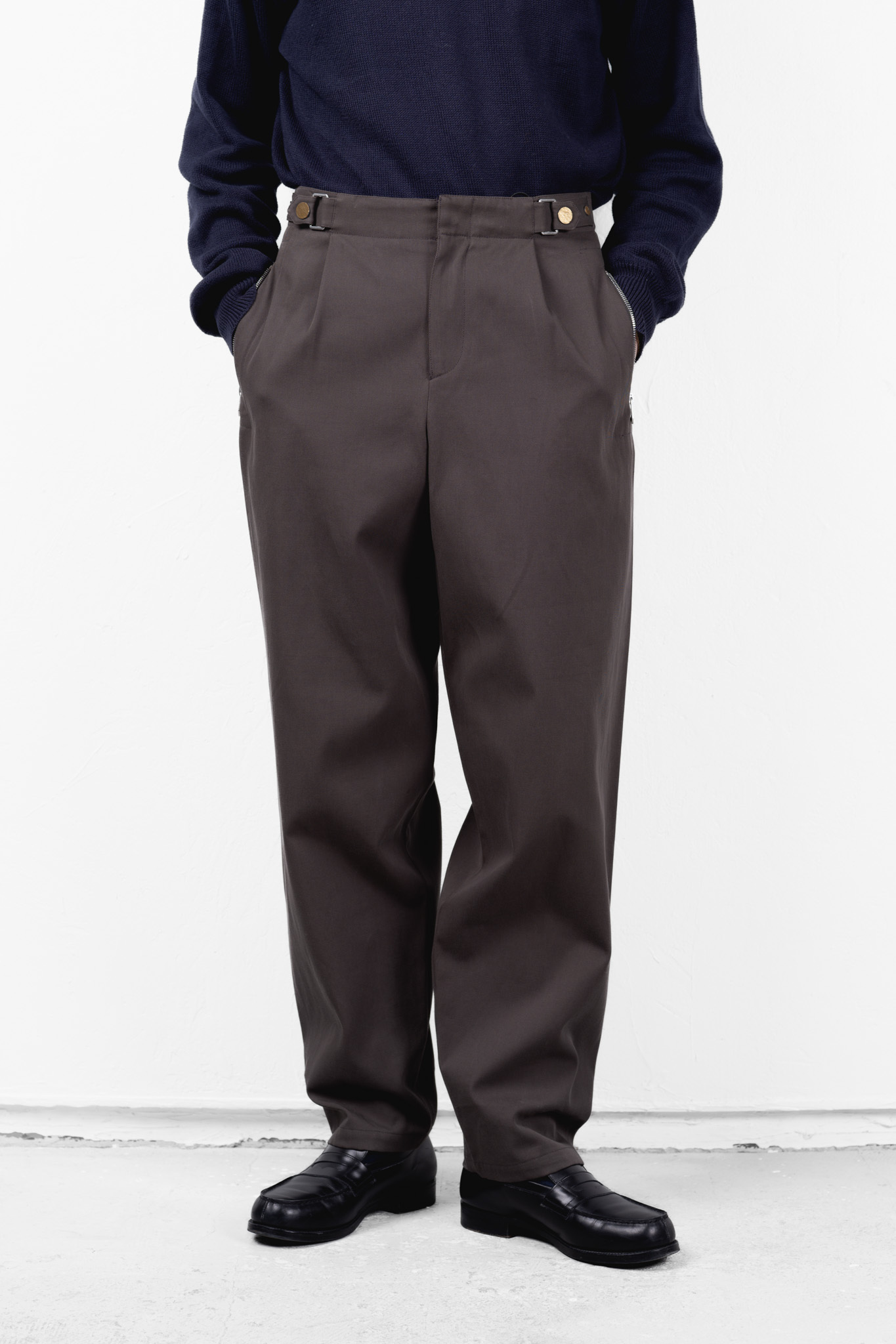 デザイン上の大きな特徴は、両サイドのジップポケットとベルトループを排したサイドアジャスターです。