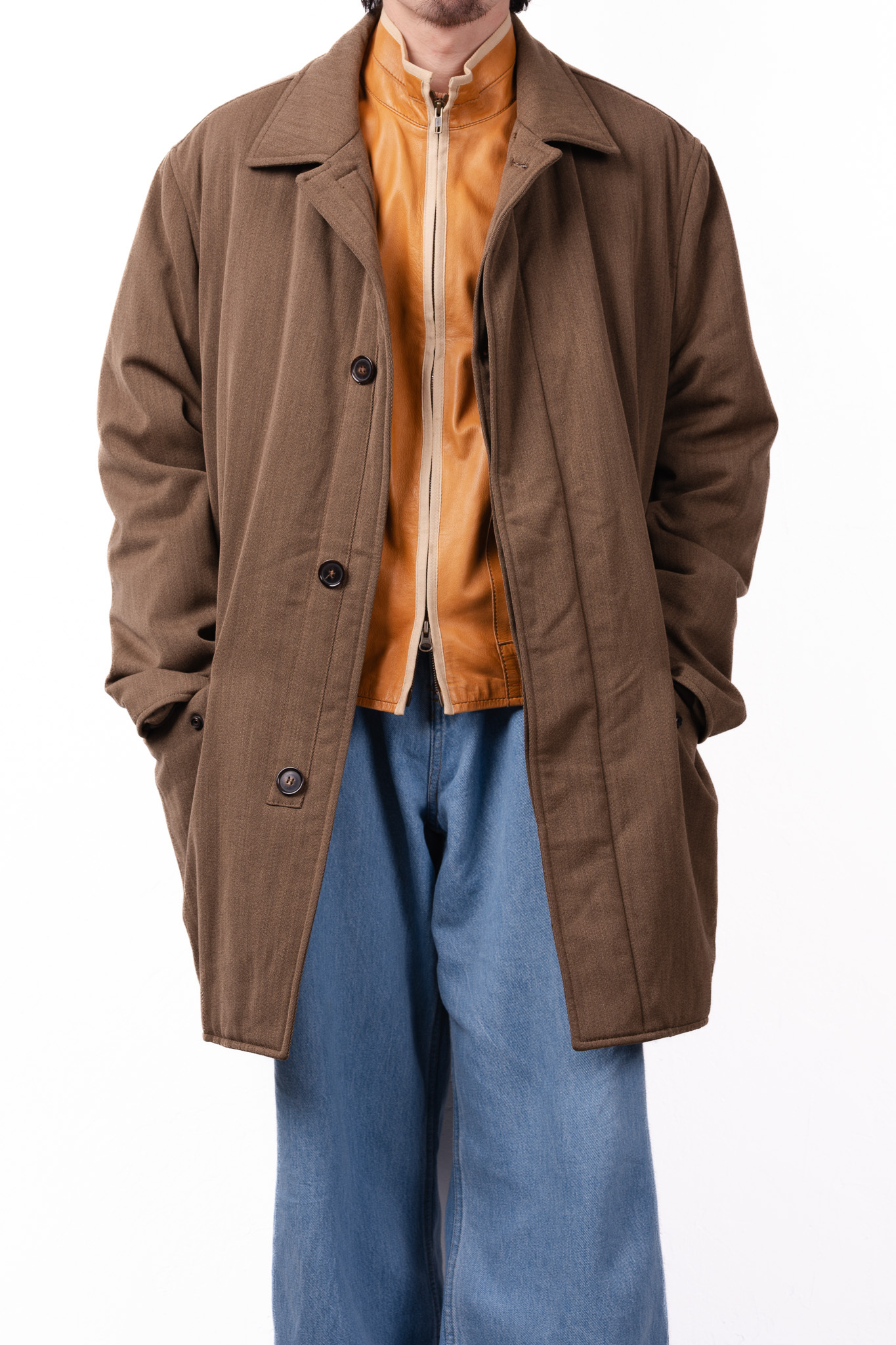 ルックスは端正な表情を湛えたクラシックな一着ですが、その真価は目に見えるデザインのさらに奥、素材の層に深く刻み込まれています。