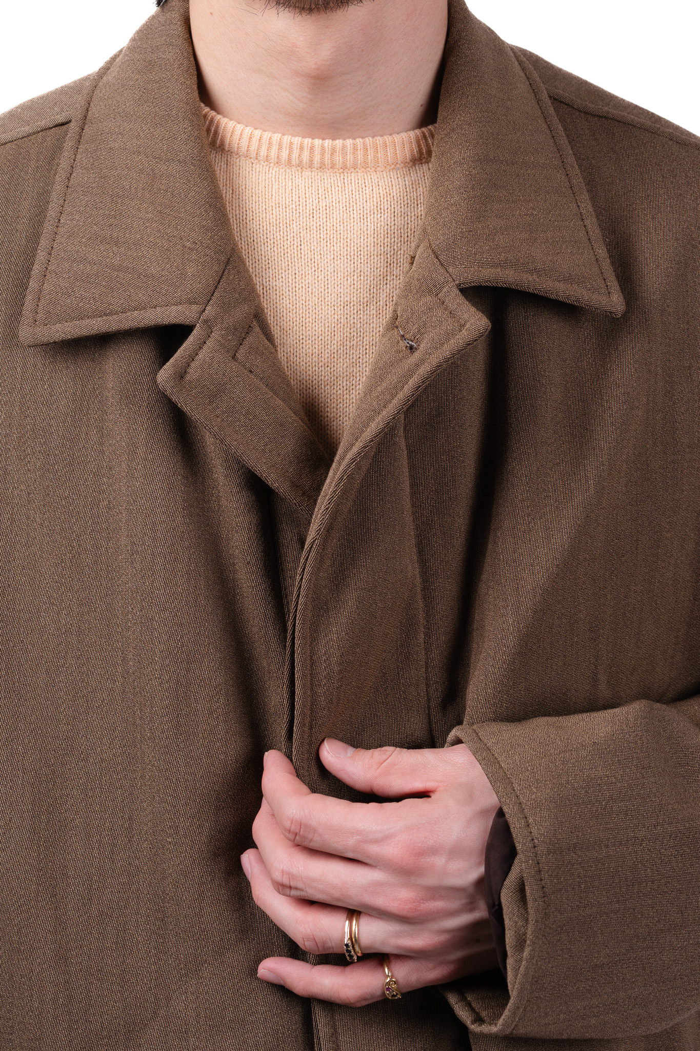 襟元の立ち上がりや、比翼の幅、ステッチのピッチに至るまで、熟練のパターンメイキングが冴え渡り、着用した際に美しいAラインのシルエットを描き出します。
