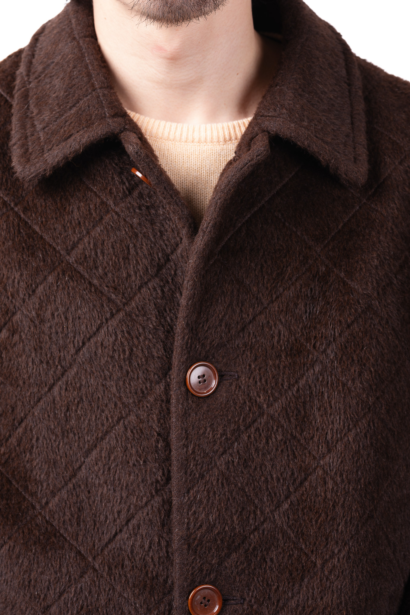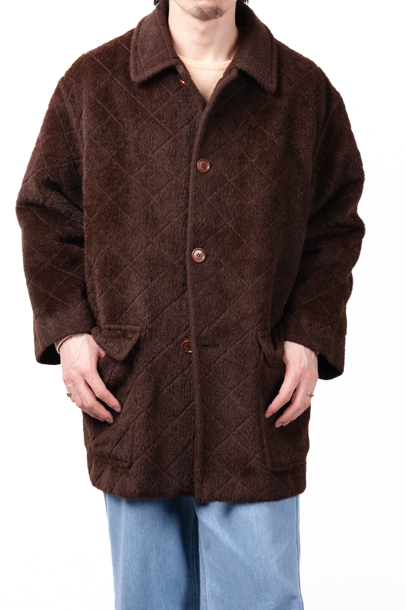 袖を通した瞬間に全身を包み込むのは、空気をたっぷりと孕んだアルパカ層の圧倒的な温もりである。