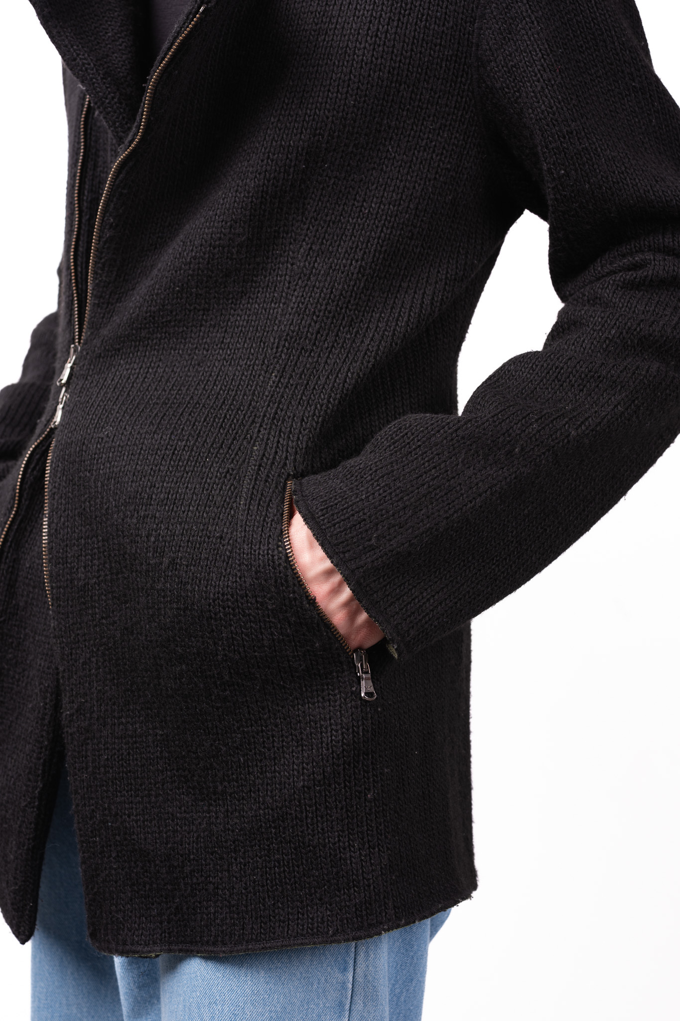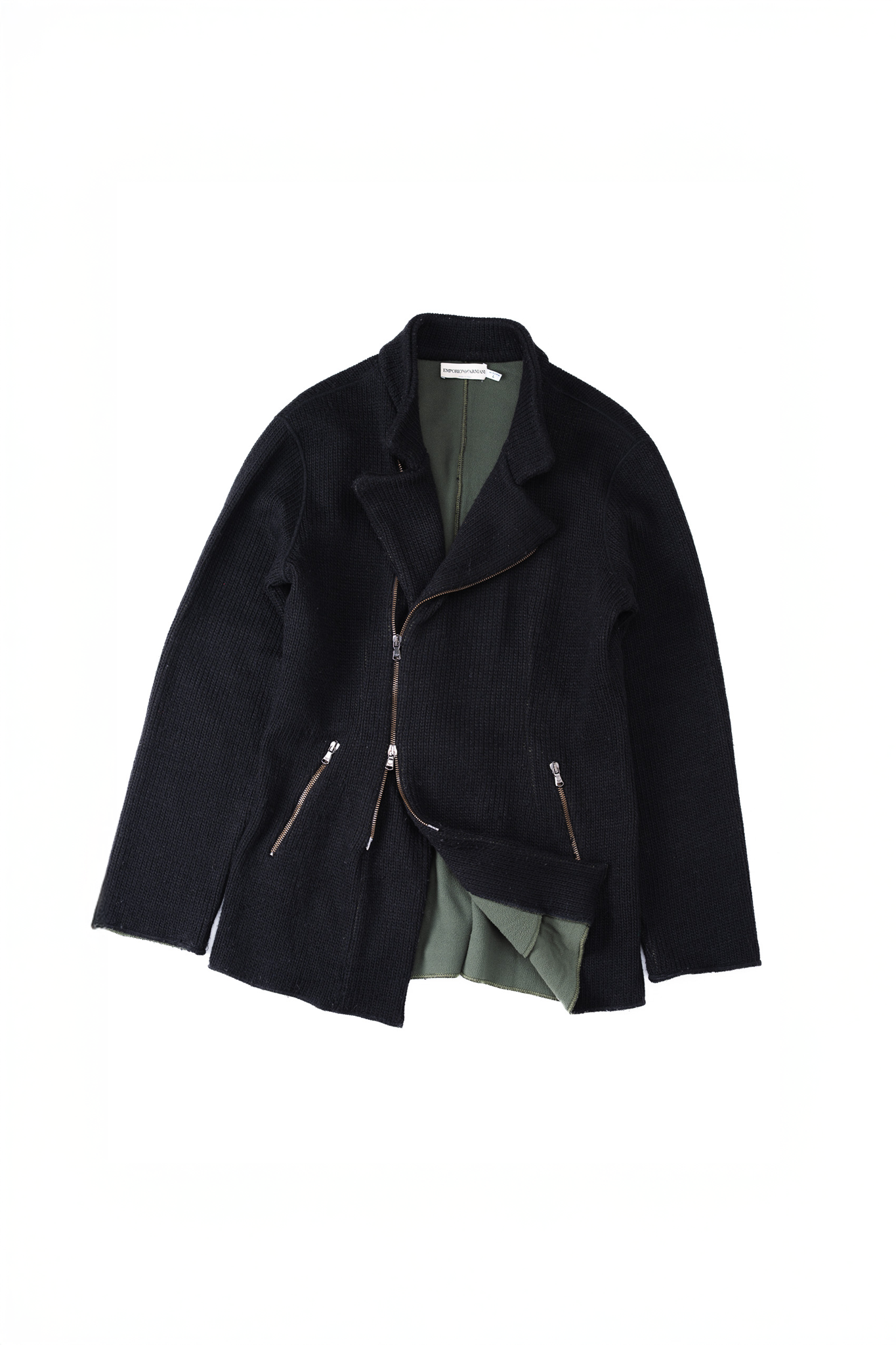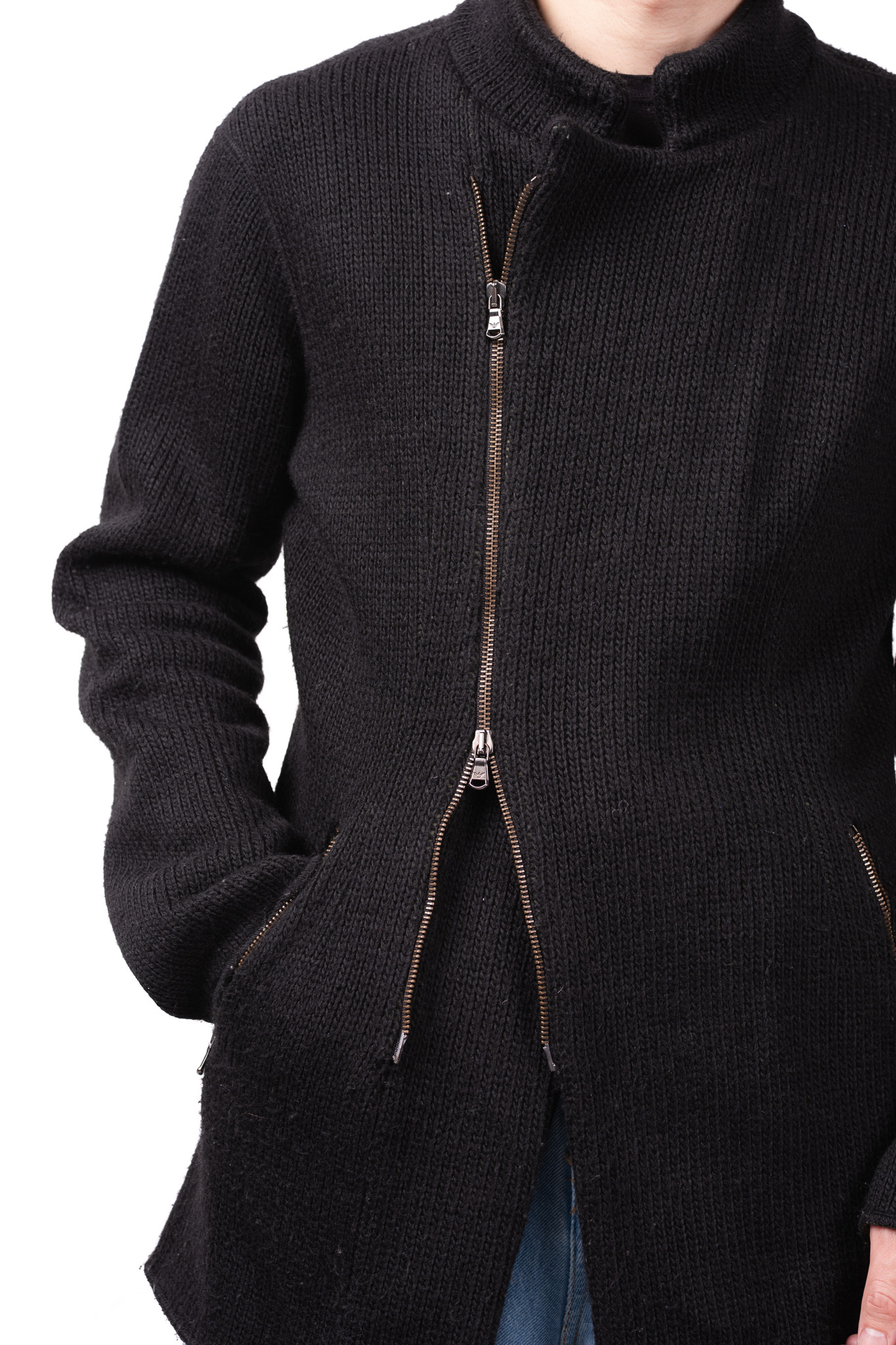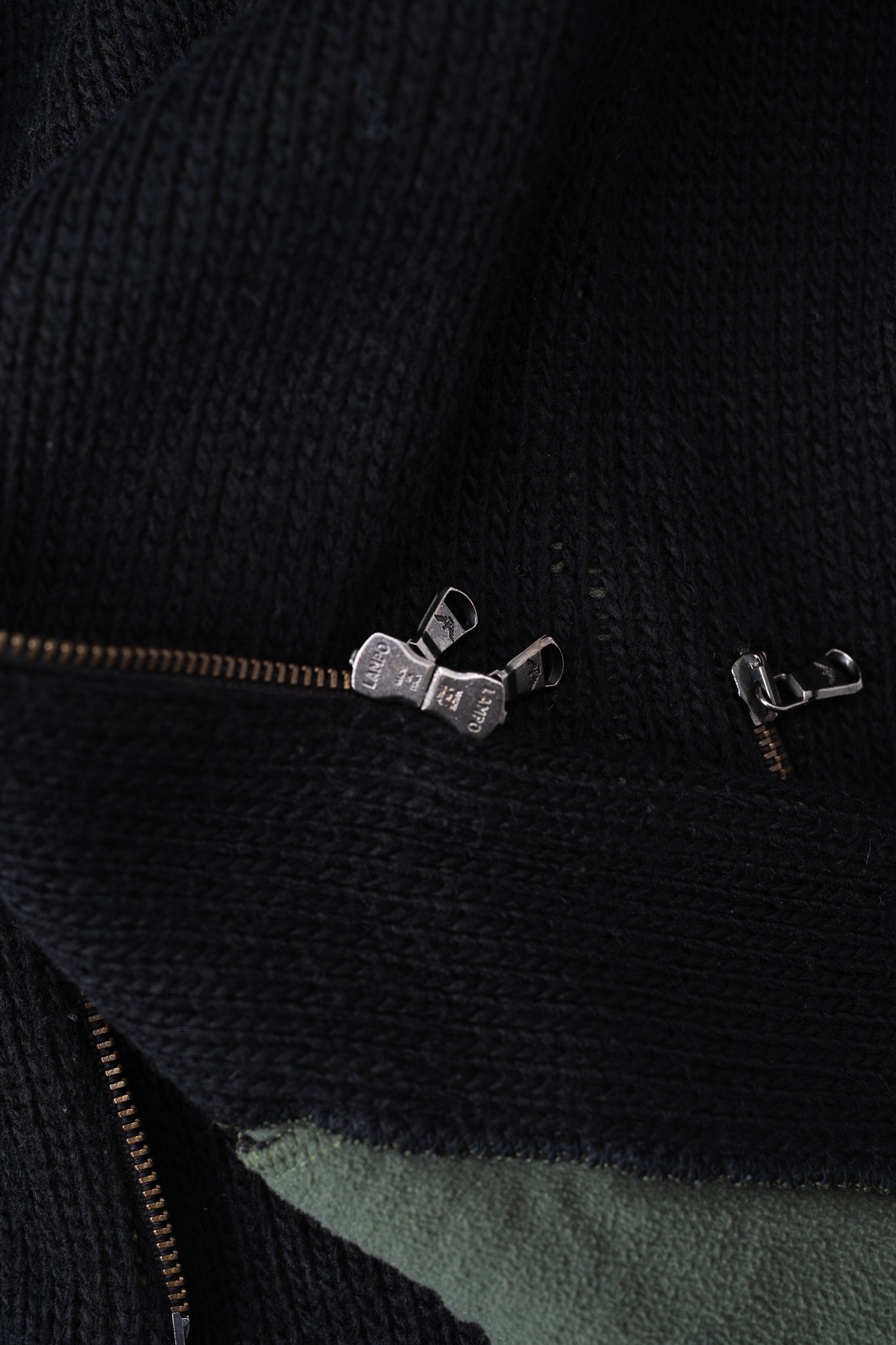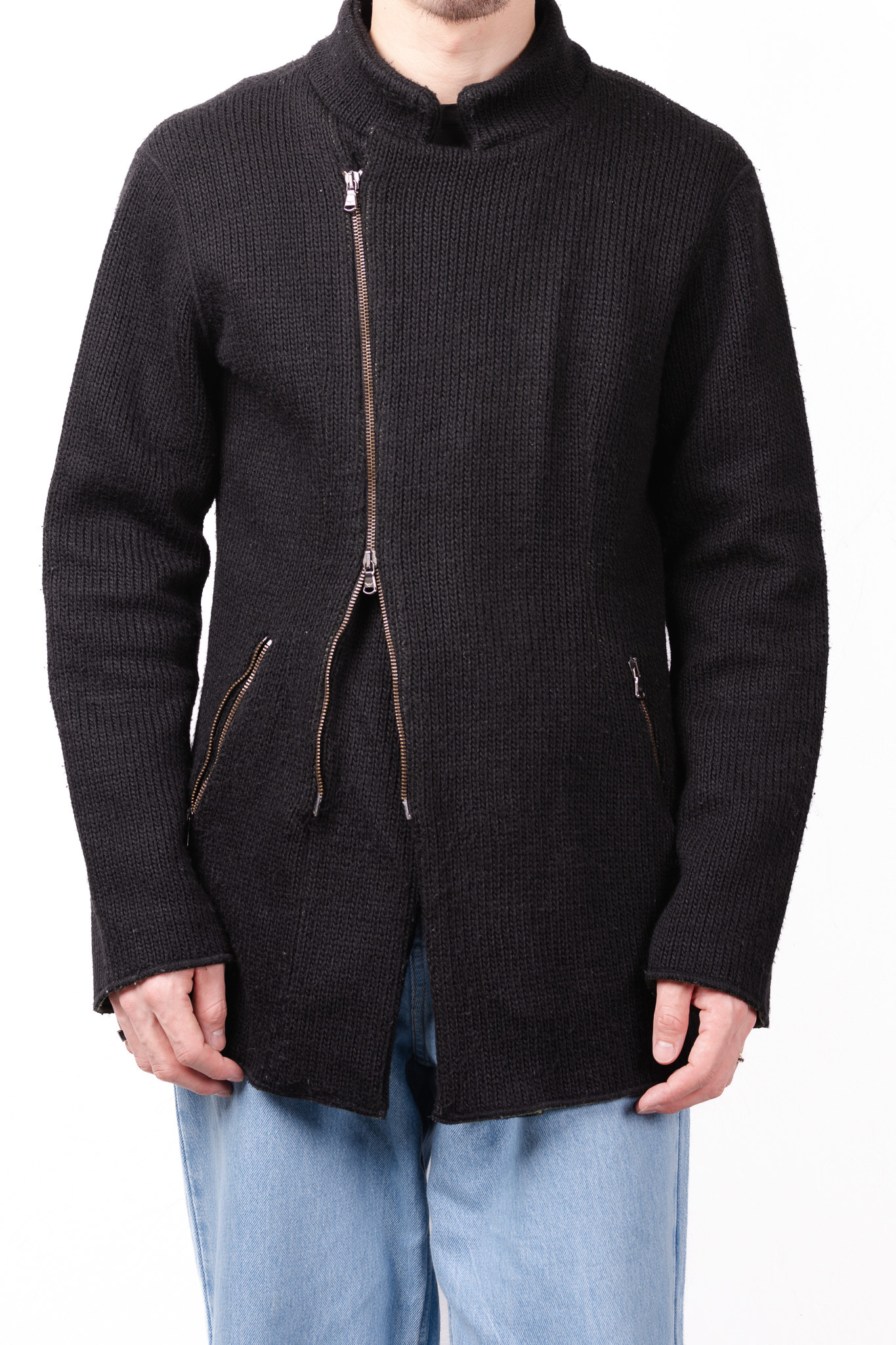 ジッパーの引き手にはブランドのアイコンであるイーグルの刻印が入ったオリジナルのメタルパーツが使用されており、無骨なニットに対してジュエリーのような輝きを添えています。