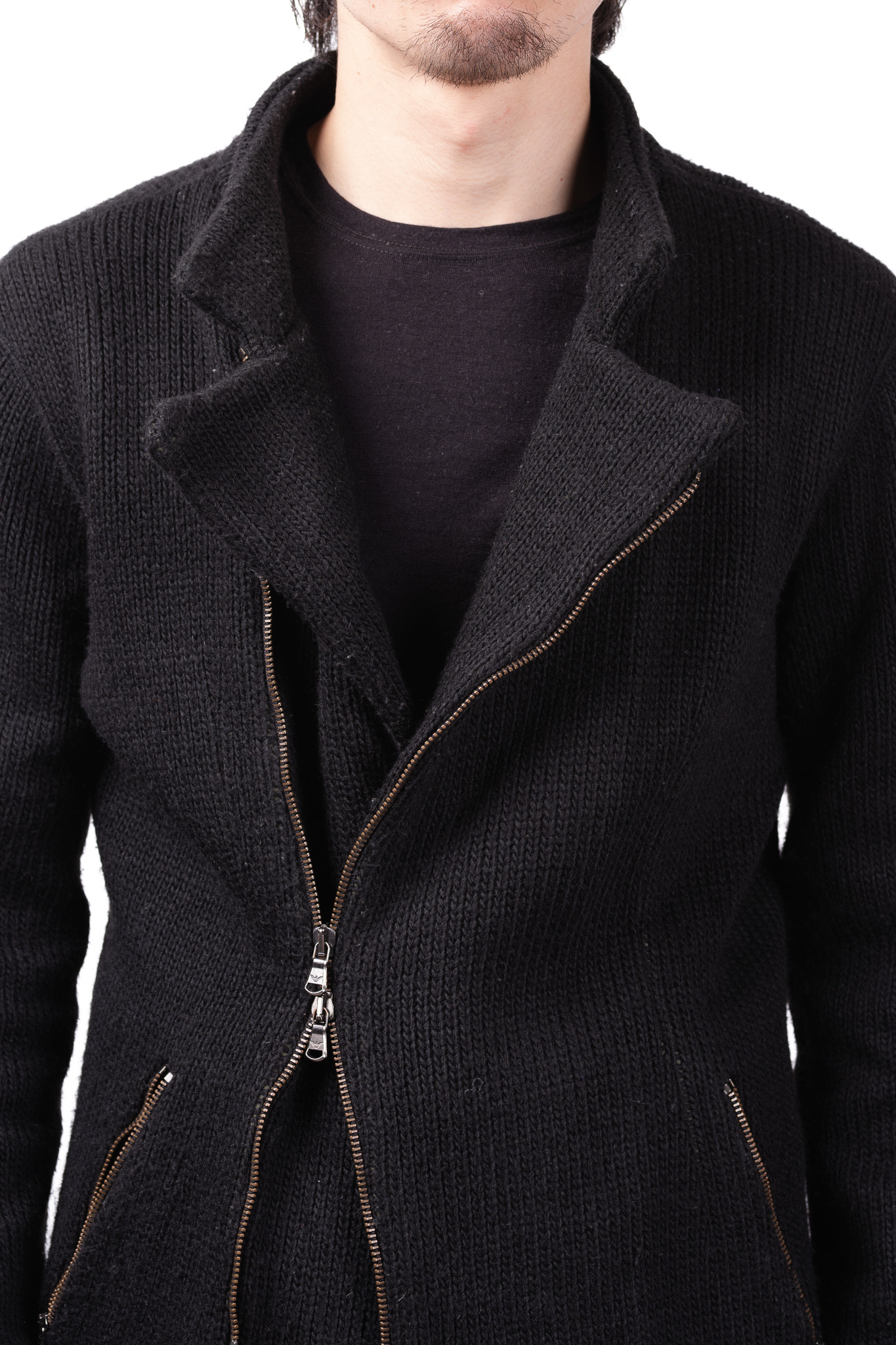 通常、ニットでライダースを作ろうとすると、素材の自重で垂れ下がってしまい、あのシャープで力強いフォルムを維持することは困難です。