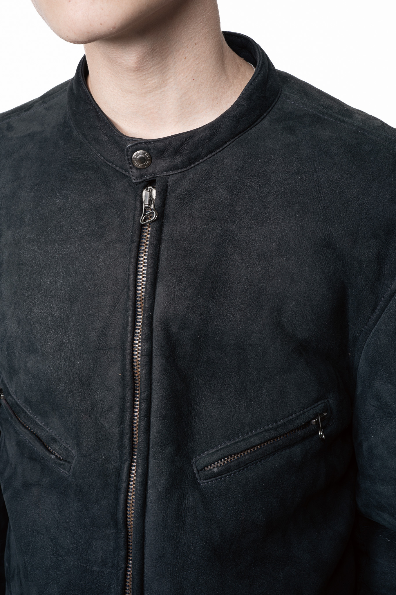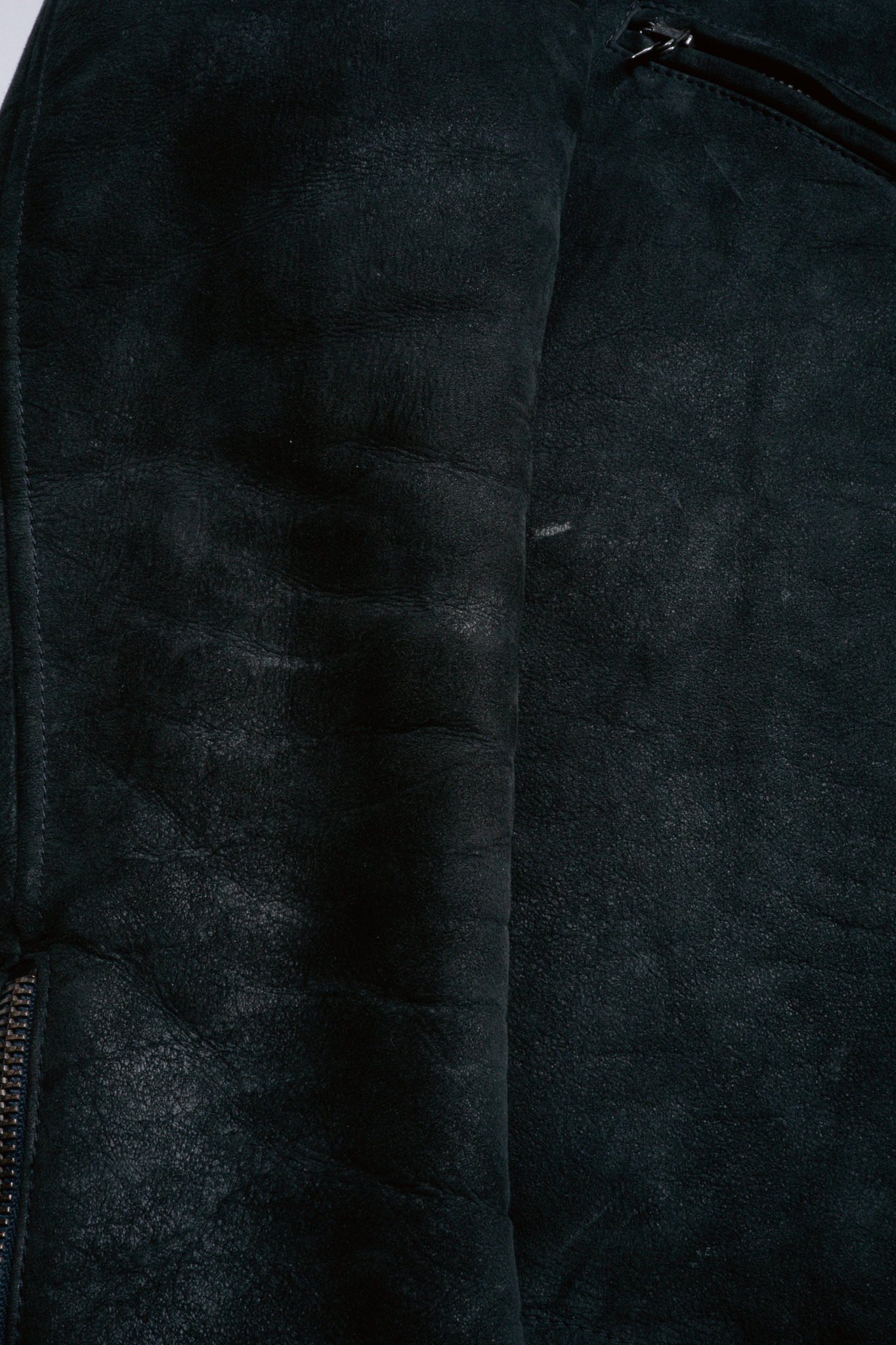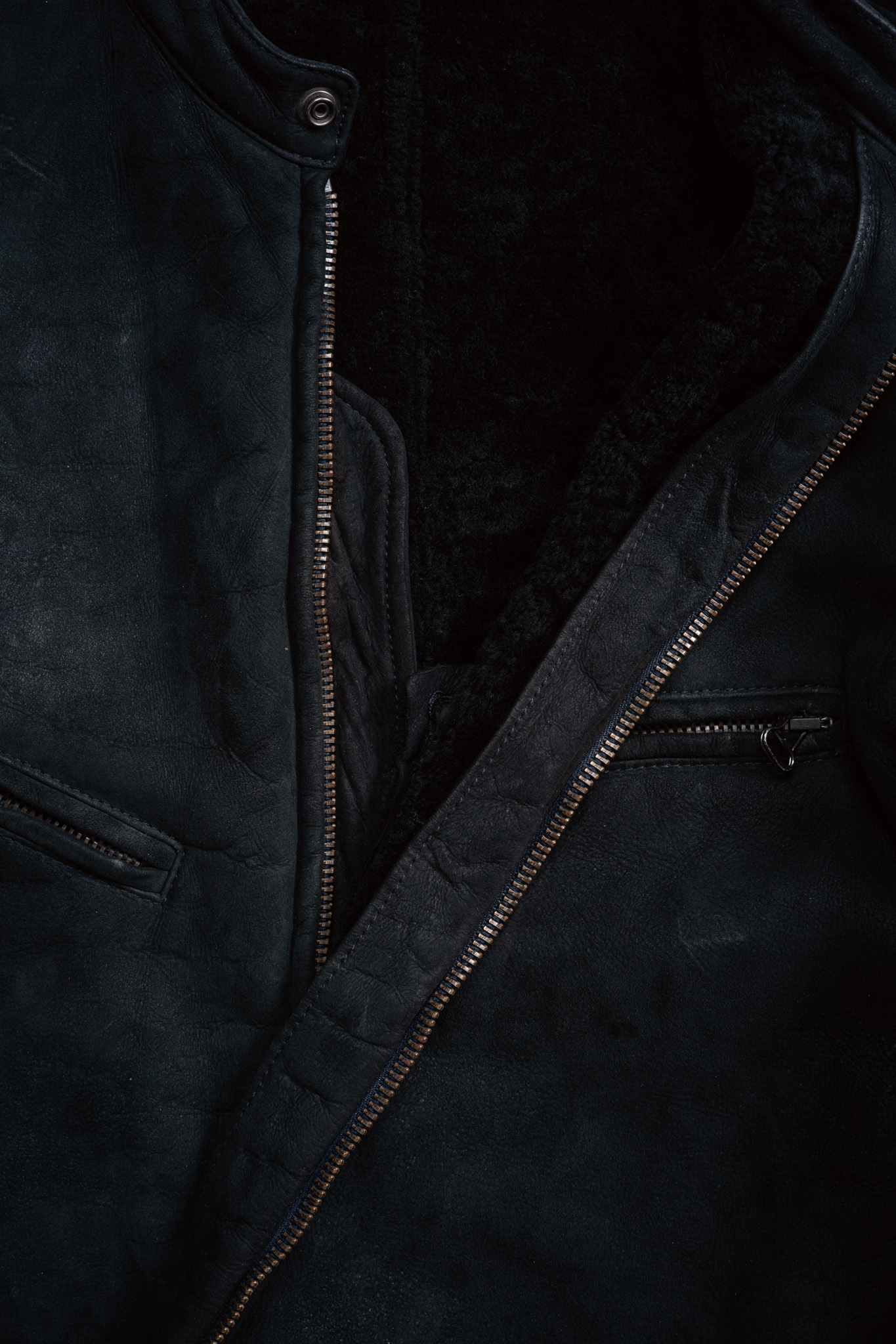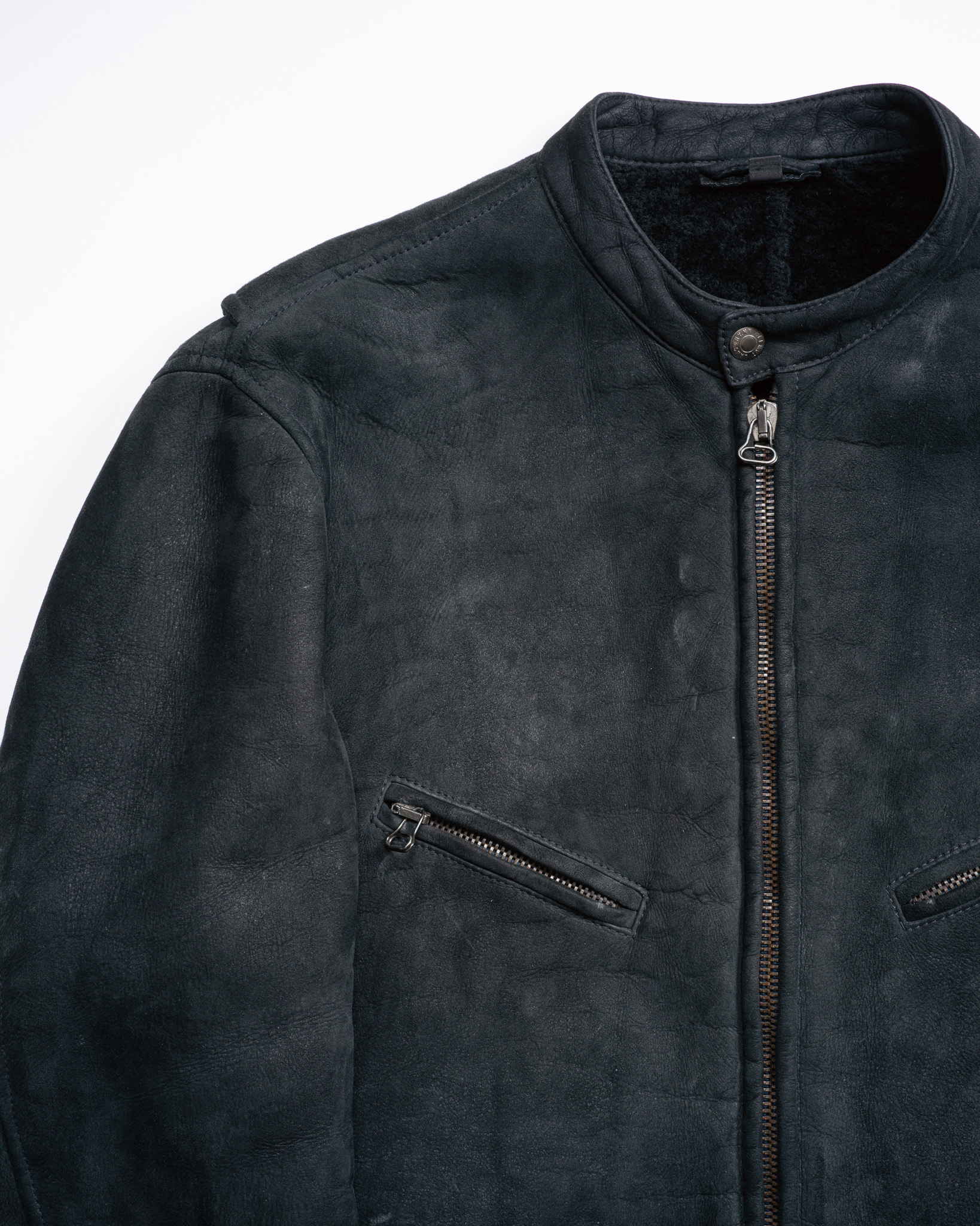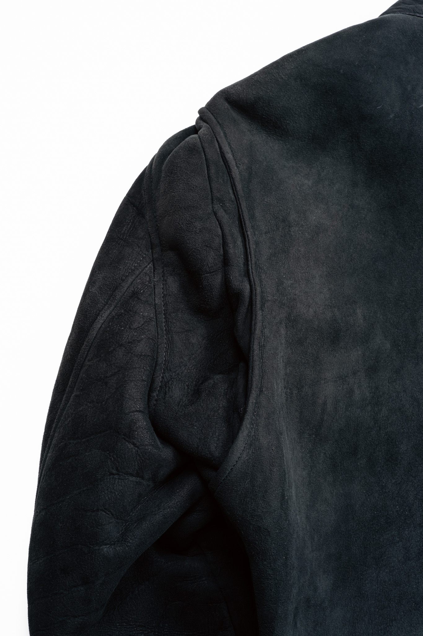皮革の表面を精密に整え、滑らかなスエードのような手触りの生地は通常のシェアリングとは異なるマットな光沢を備えた引き締まった顔つき。