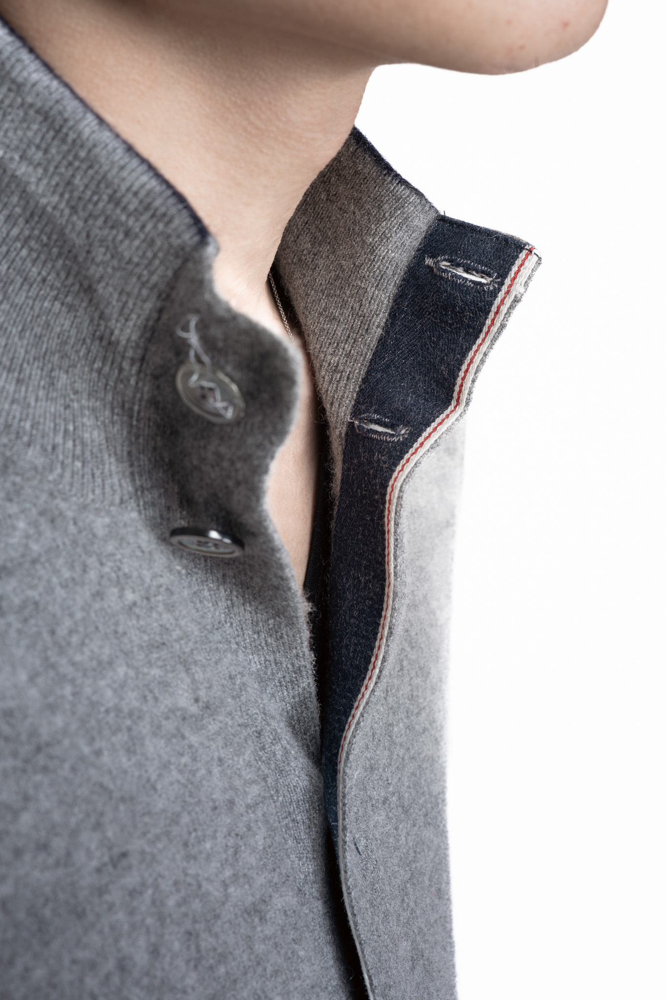 ボタンを閉じればハイネックのセーターとして冬の暖かみを内側から表現し、