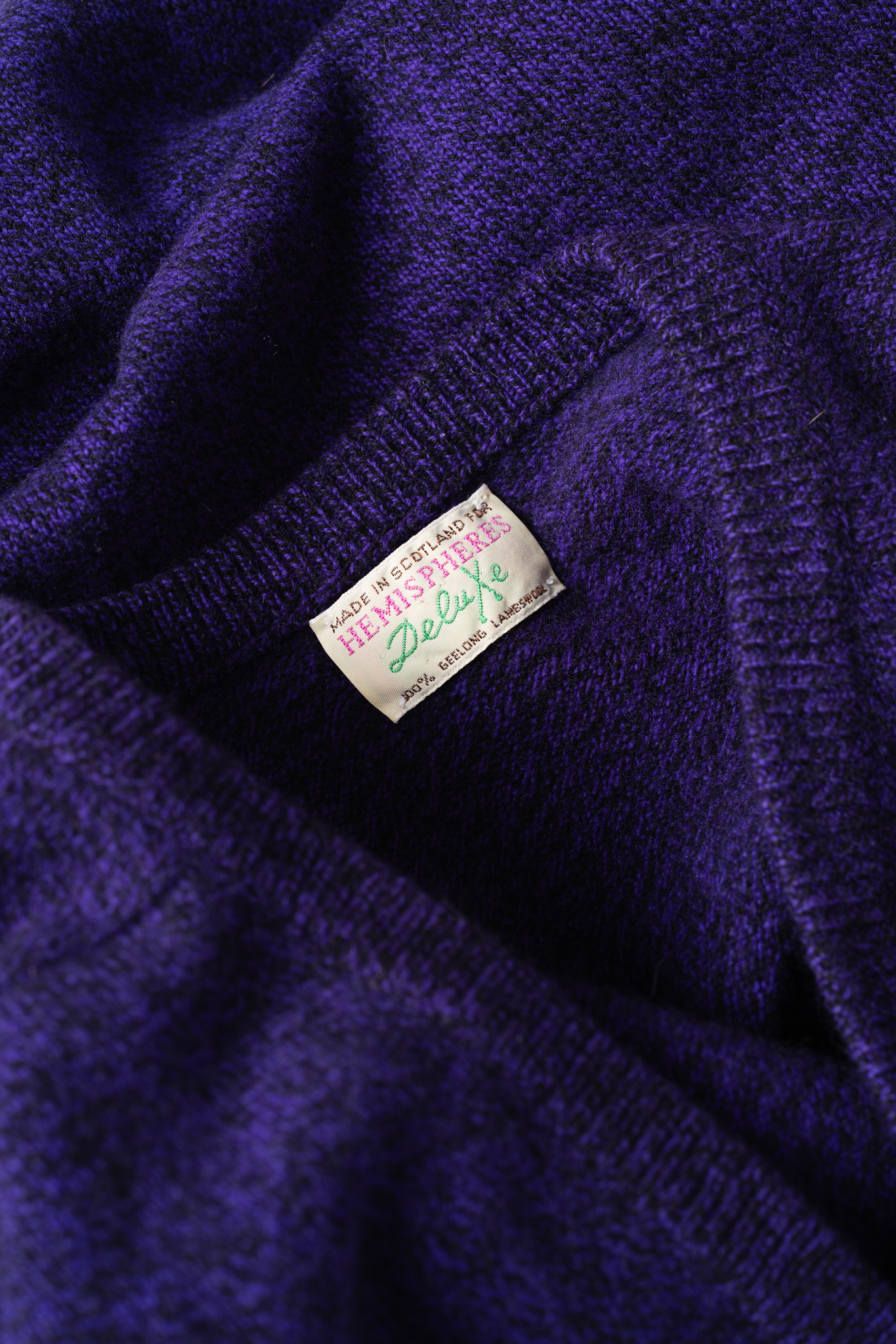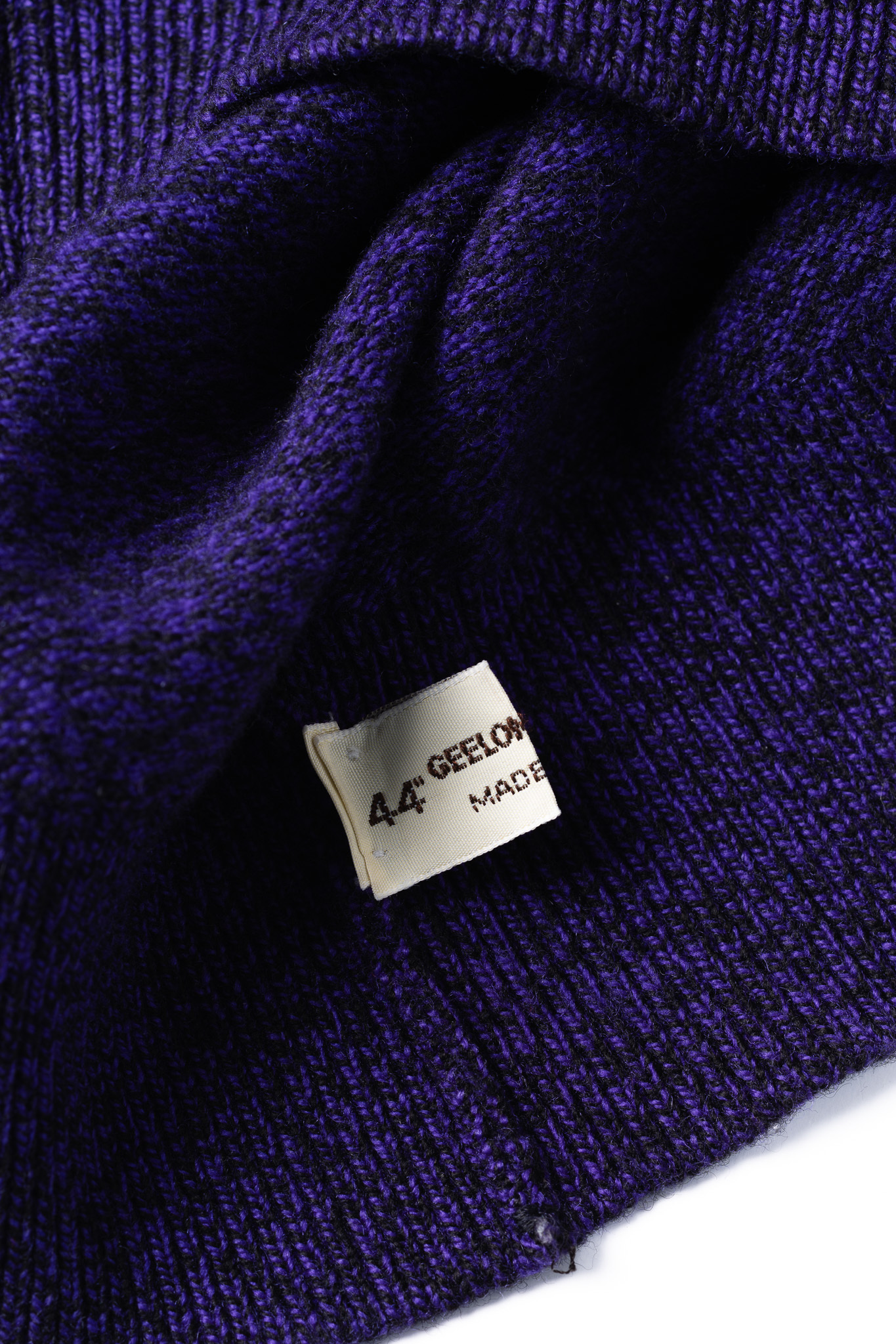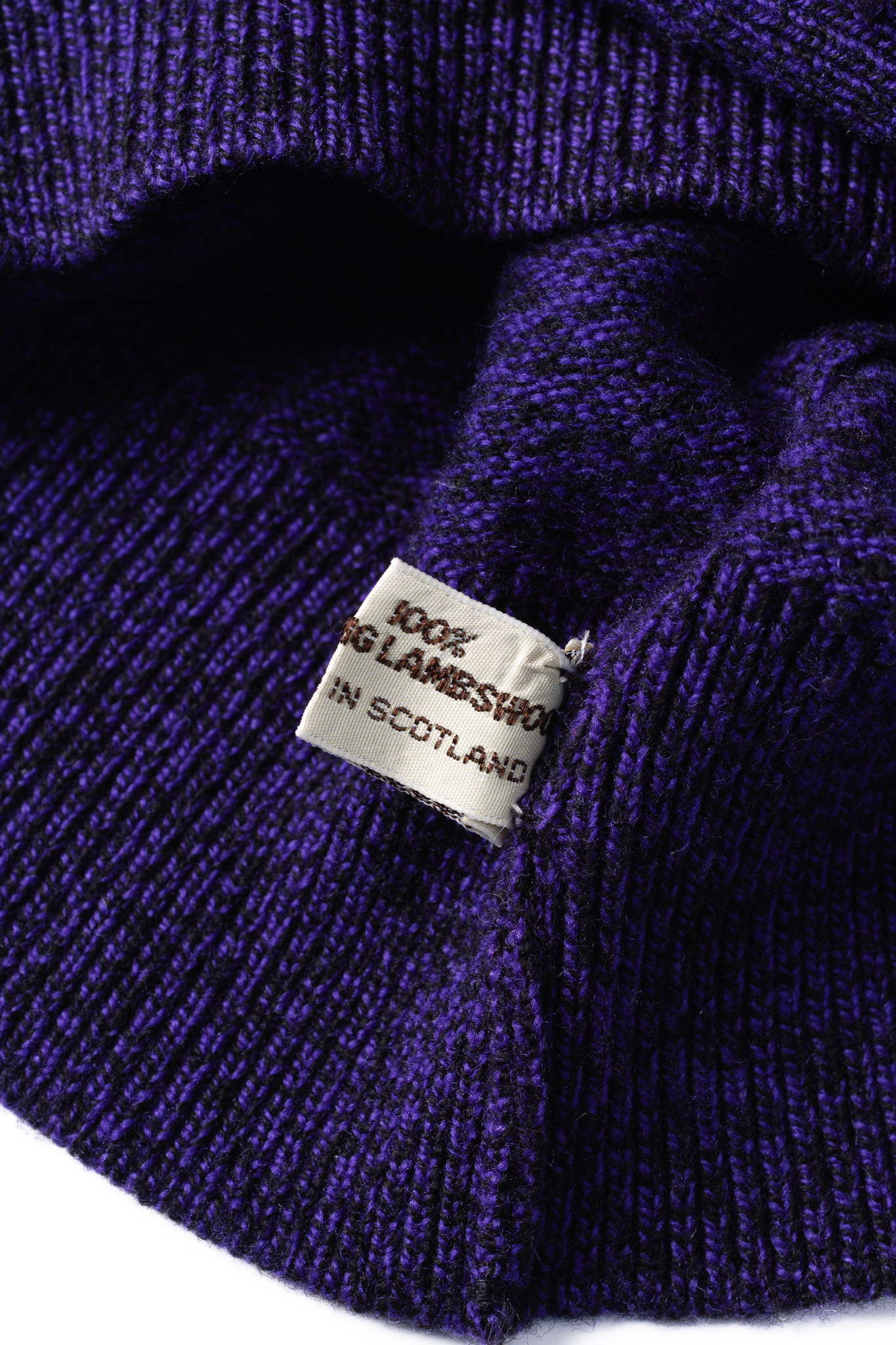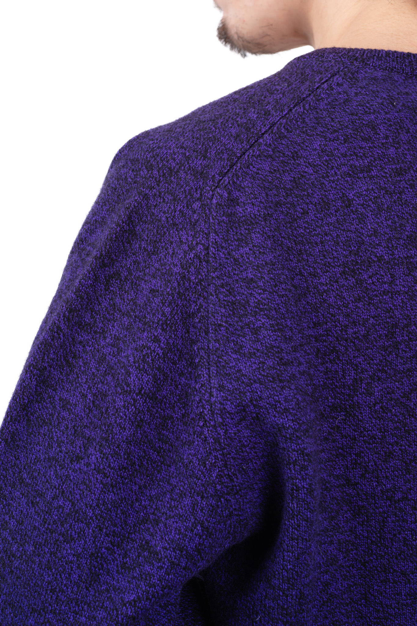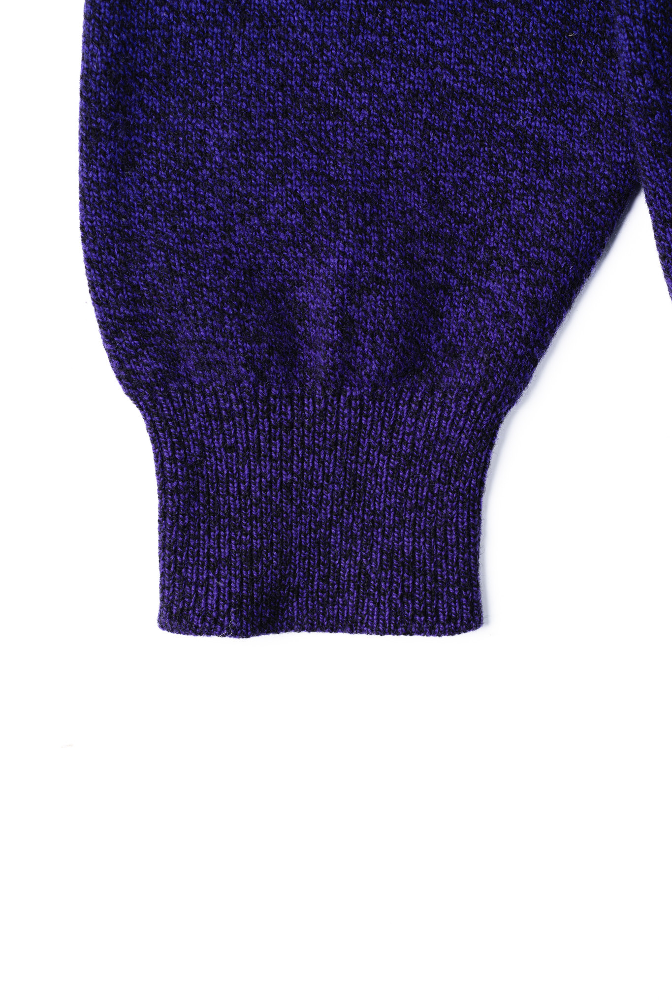 表面の編み地を凝視すると、単一の紫色の糸で編まれているのではなく、ブラックやダークネイビーといった深みのある暗色の繊維が複雑に絡み合ったメランジで構成されていることがわかります。