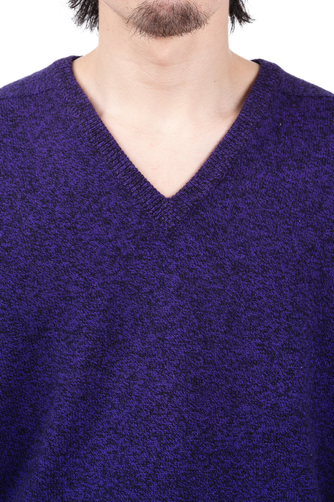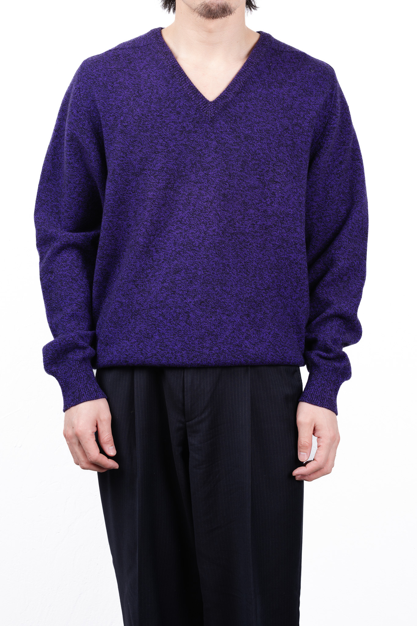 鮮やかながらも深みのあるパープルの色彩は、一枚で着用した際の主役としての存在感はもちろんのこと、ジャケットやコートのインナーに差し込んだ際にも、Vゾーンから覗く美しいアクセントとして機能します。