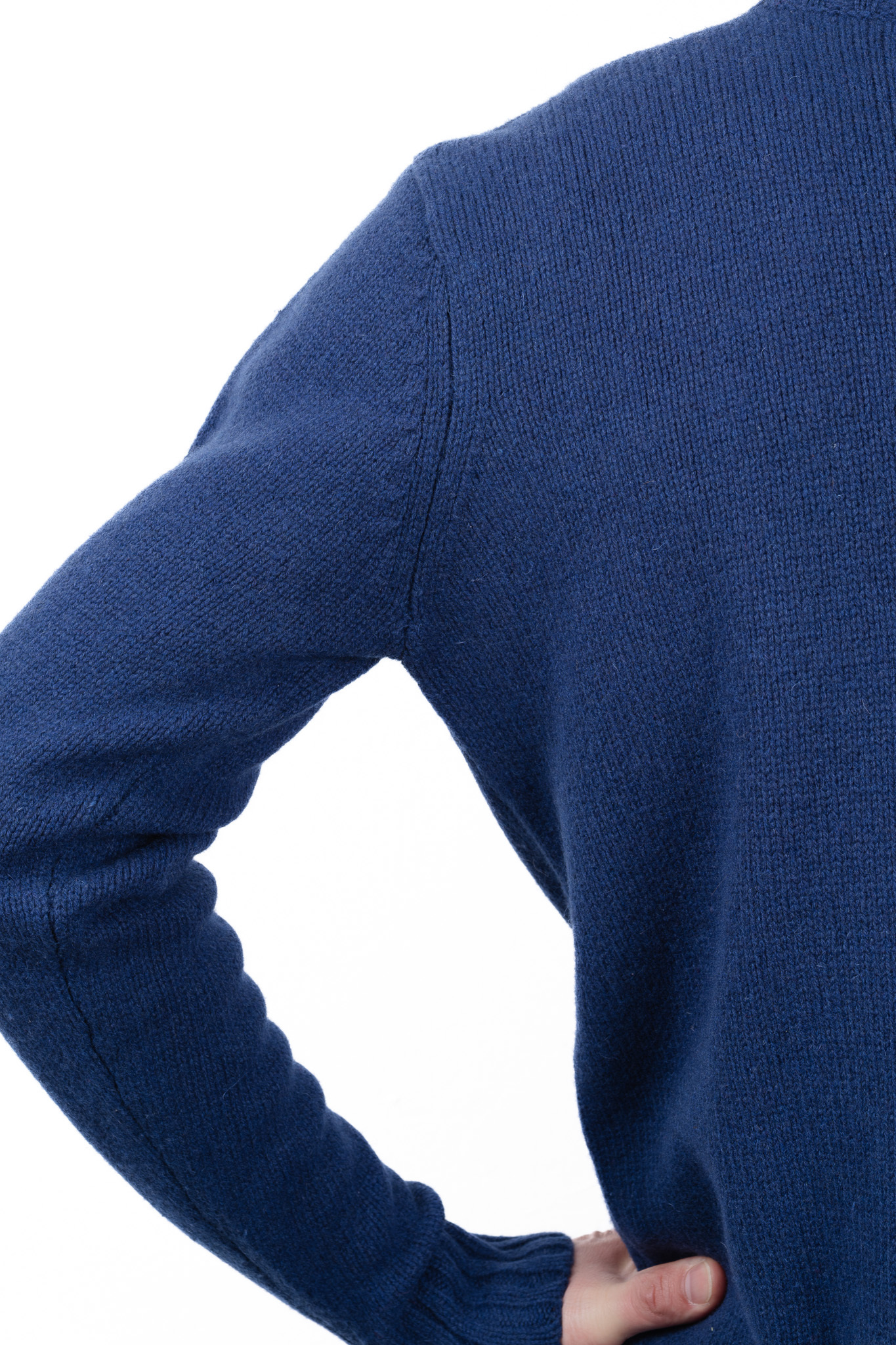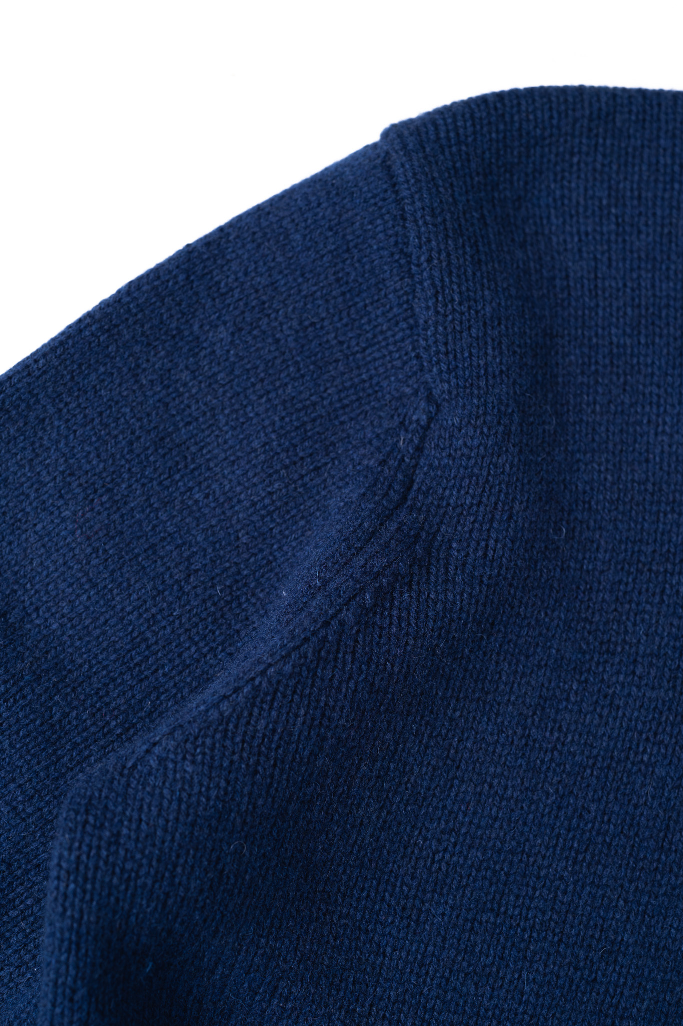 これは大きな生地を裁断して縫い合わせるのではなく、身頃や袖といった各パーツを編み上げる段階で、完成形のシルエットに合わせて最初から編み目の数を増減させながら形作っていく成型編みの証である美しい減らし目です。