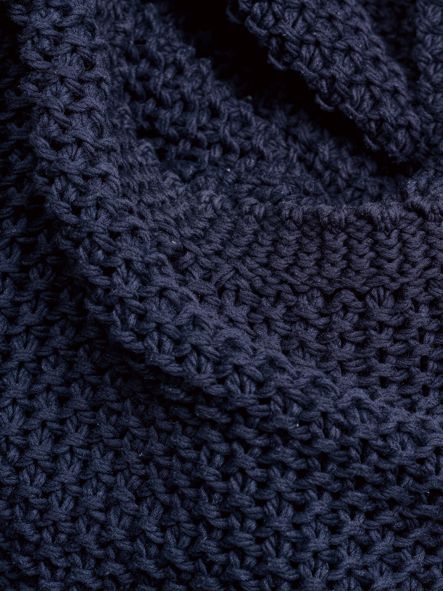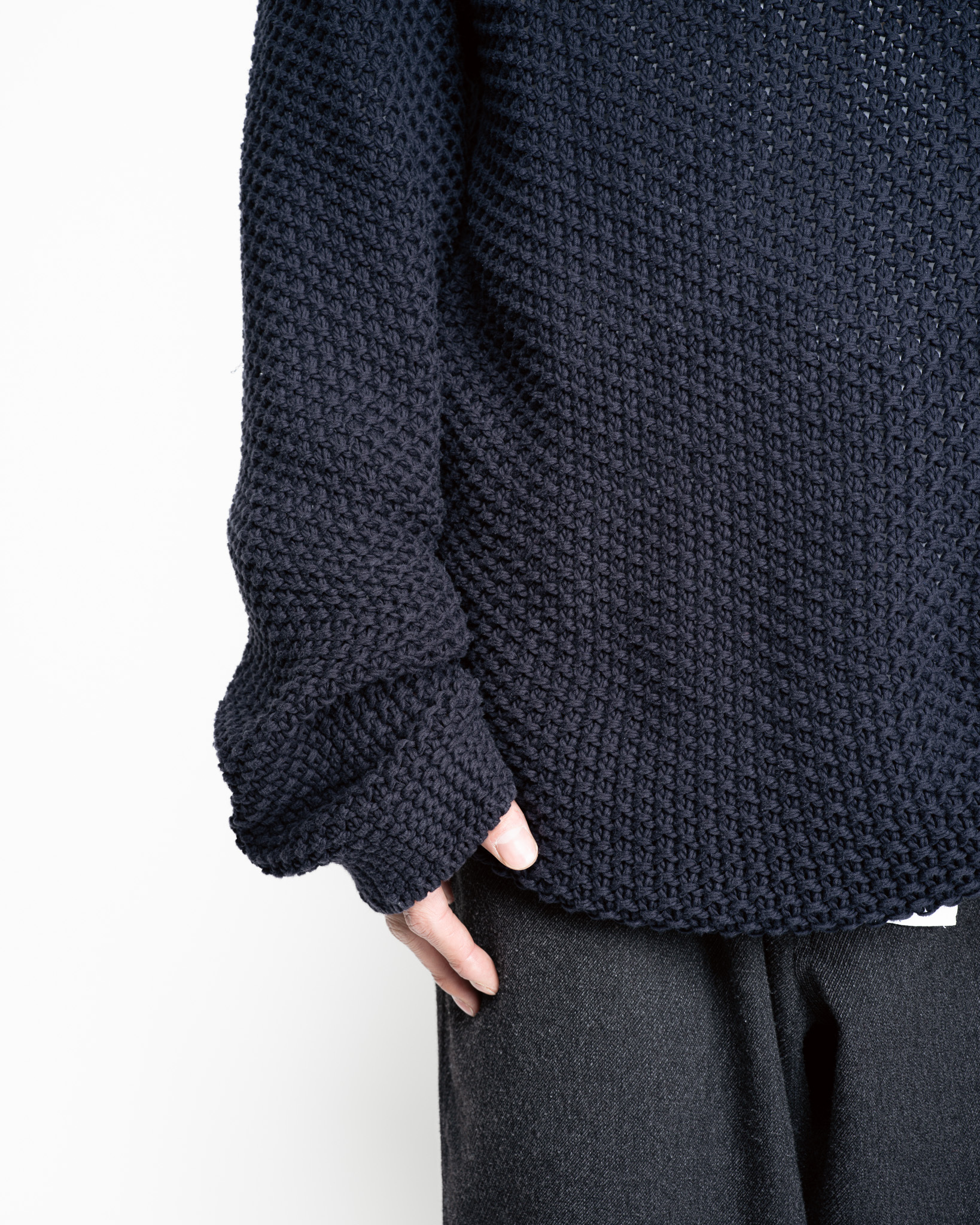 空気を織り成す様に緩く編まれた編み地は、幾何学柄を演出するようにポコポコと表面で遊び、隙間から光を通す。
