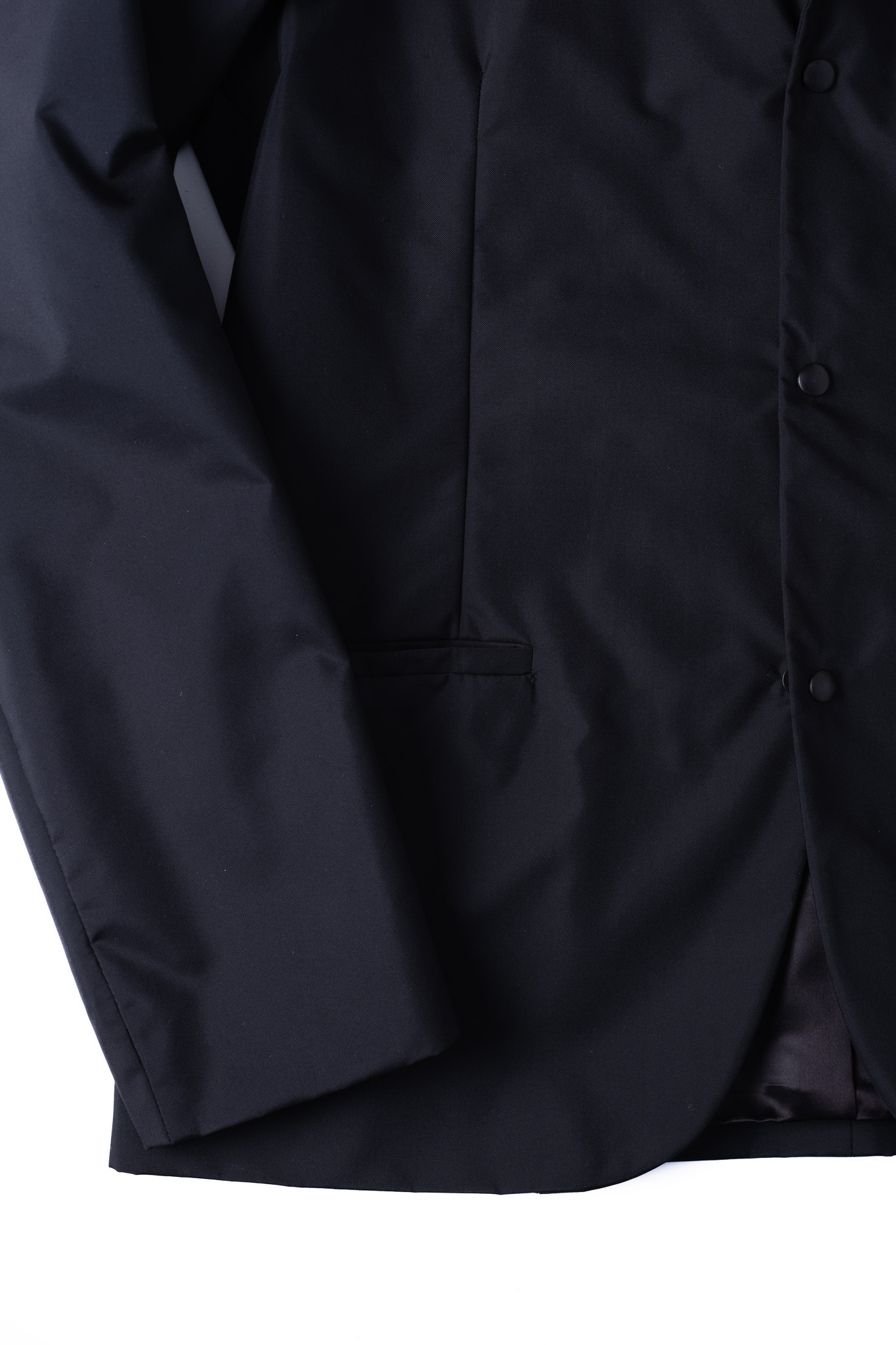 袖口に関してはあえてボタンを排したミニマルな筒袖仕様にすることで、フロントのスナップボタンの存在感をより際立たせる計算もなされています。