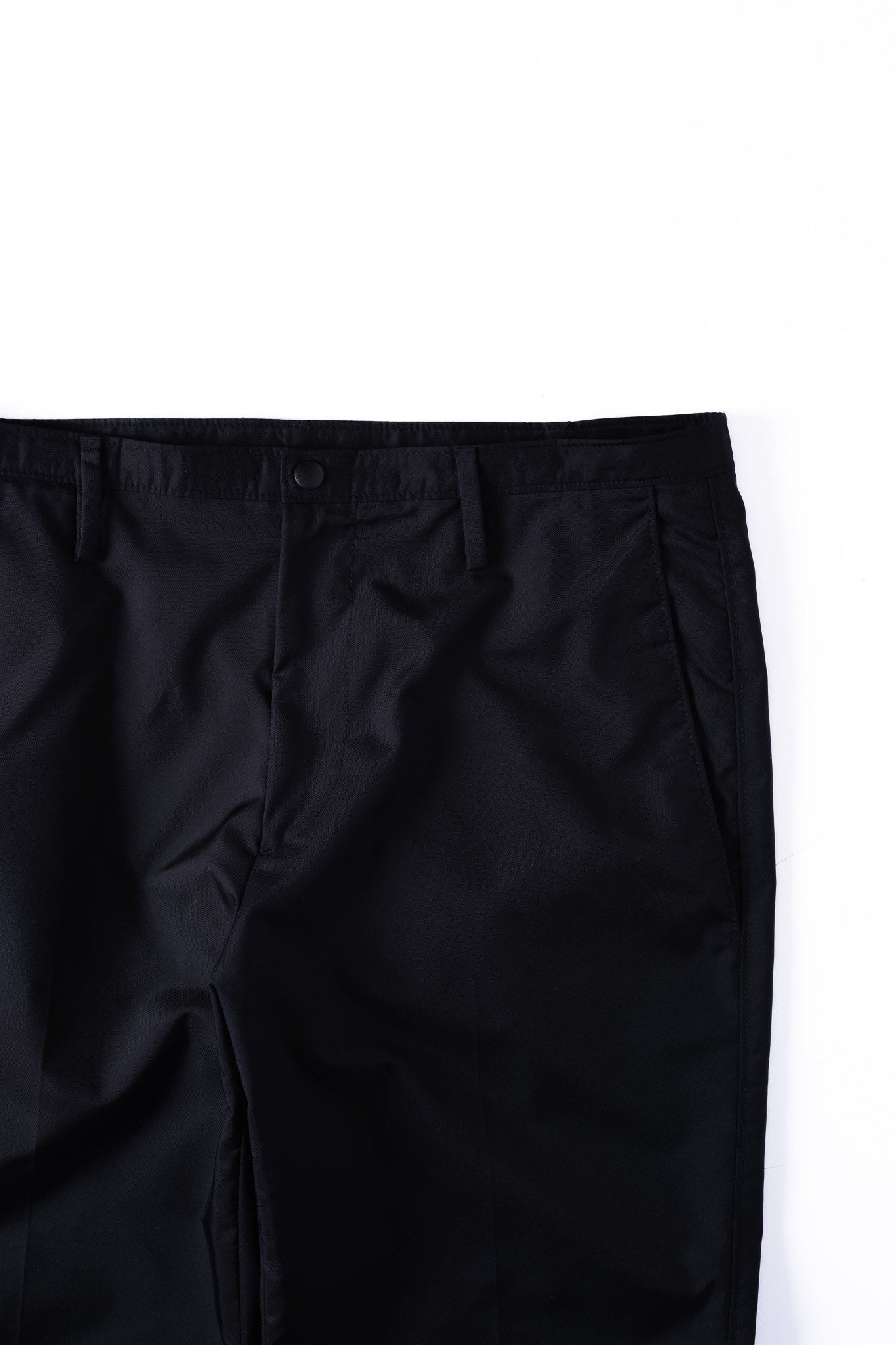 天然素材特有の温かみは排除され、ナイロンならではの鈍い光沢感と冷たく理知的なテクスチャーが、セットアップ全体に無機質なオーラを与えています。