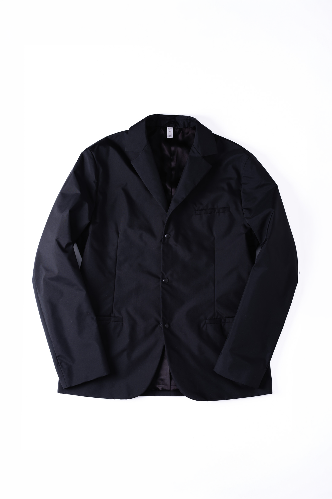テーラードジャケットであれば当然備わっているべき重厚なボタンをあえて使わず、指先一つで開閉できる金属製パーツを採用する。