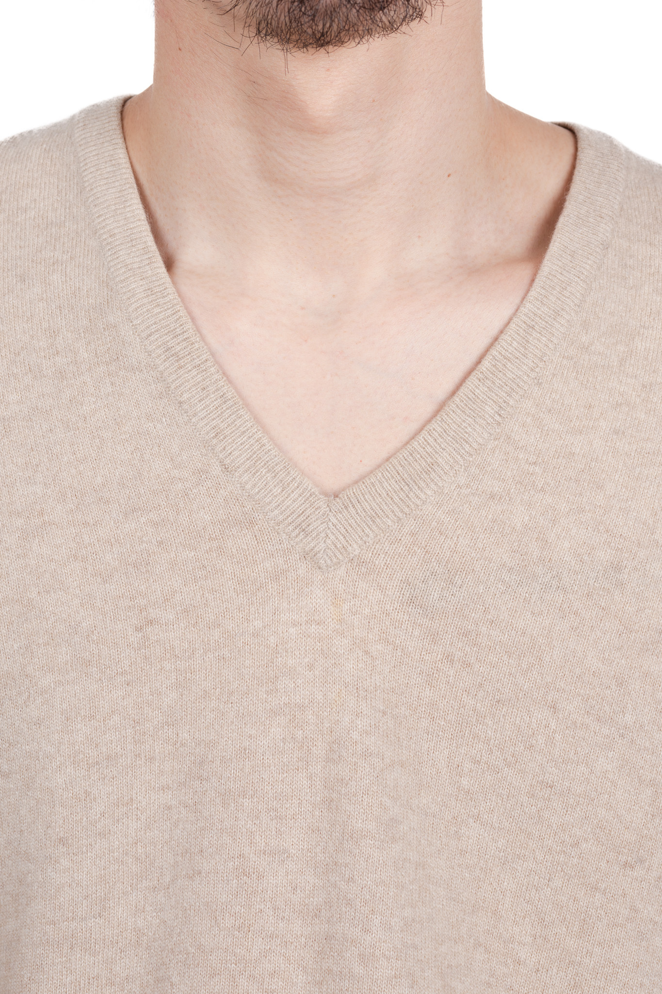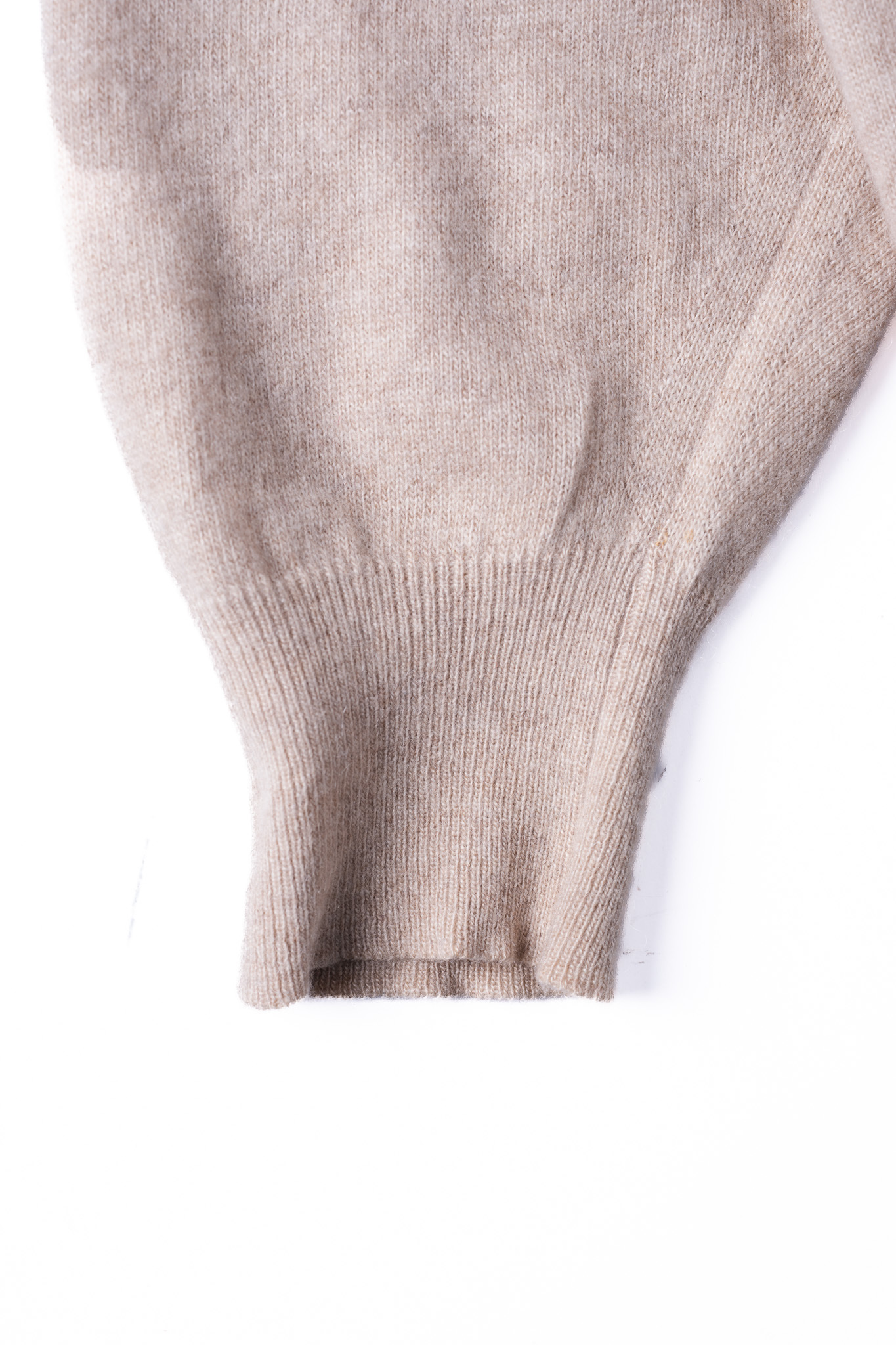 イタリアのメゾンが柔らかさを前面に出すのとは対照的に、特級カシミヤ糸をあえて強く撚り、度目を詰めて高密度に編み上げる手法を採用。