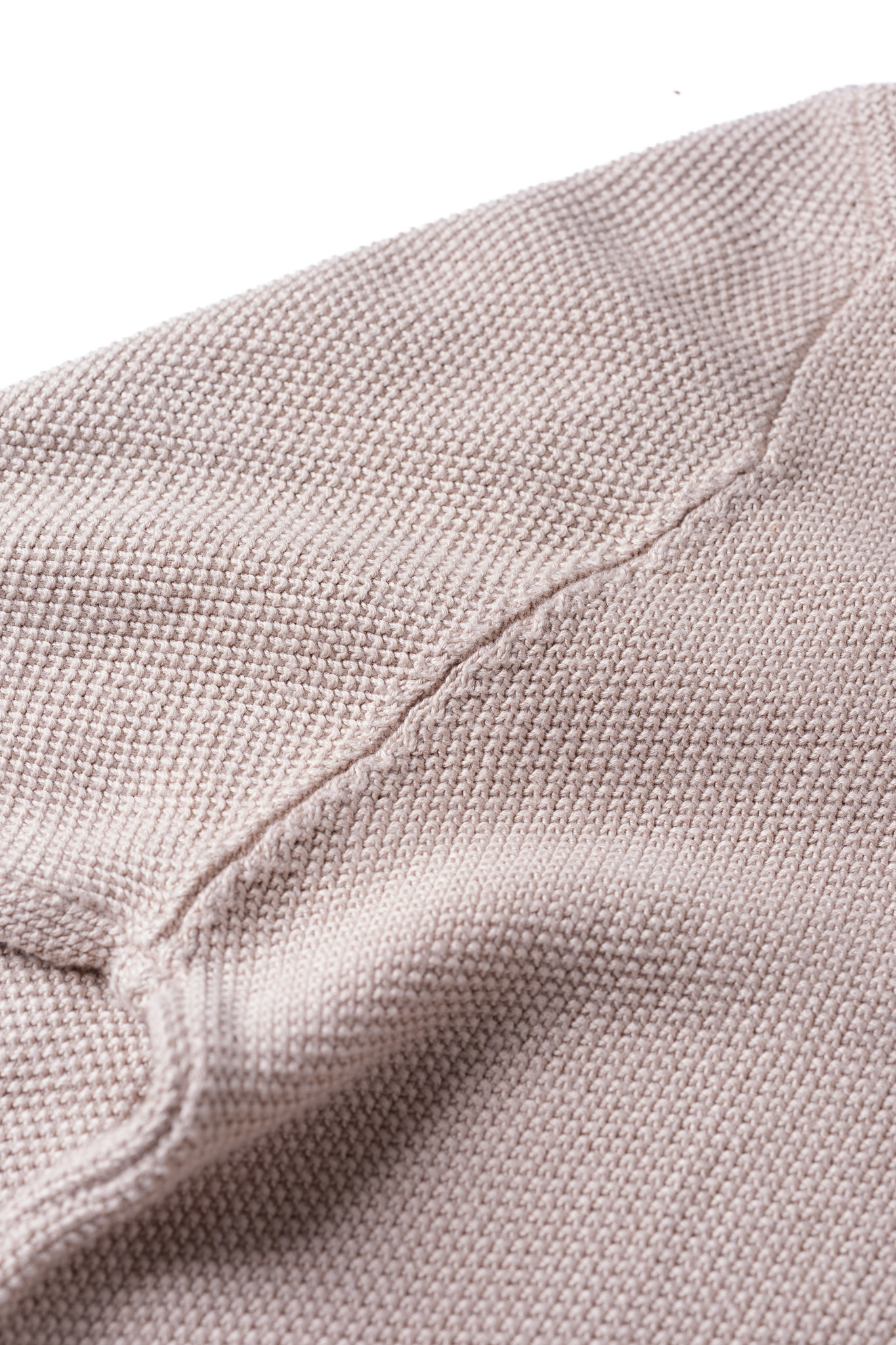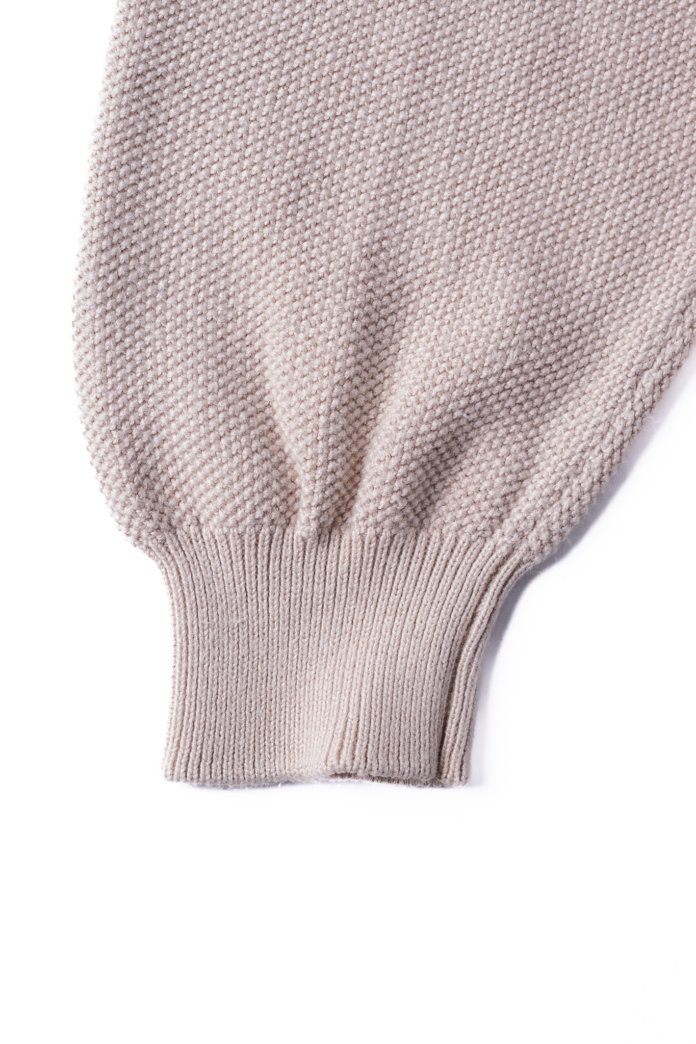 身頃から袖口、そして裾のリブへと向かう境界線に現れるこの目減らしの跡は、高度な技術の証明であると同時に、ニットそのものの構造的な美しさを際立たせる意匠としても機能しています。