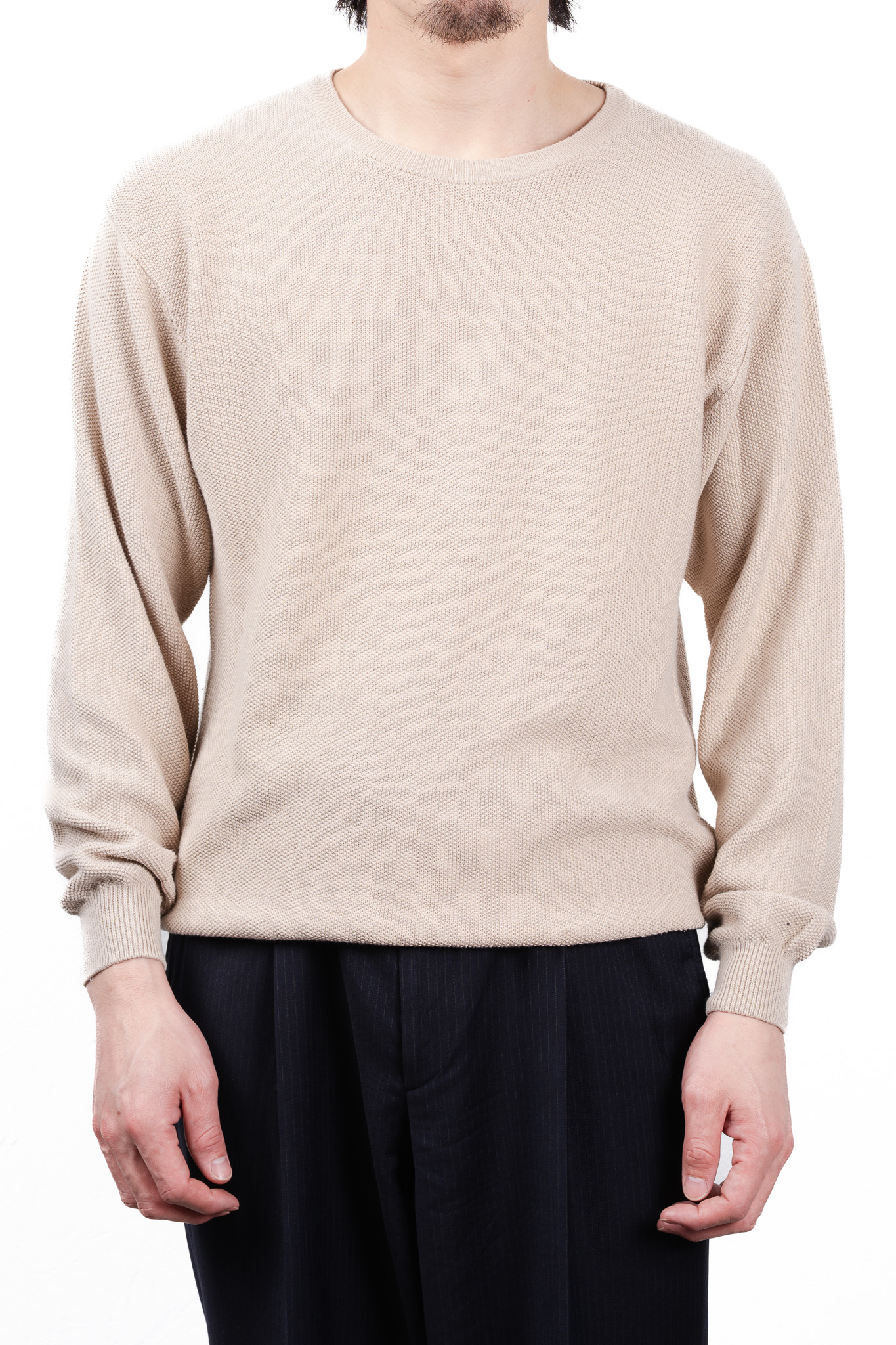 裾のリブを腰回りで留めて身頃をふんわりとブラウジングさせることで、オートミールカラーの鹿の子編みが持つ柔らかな表情がより一層引き立ちます。