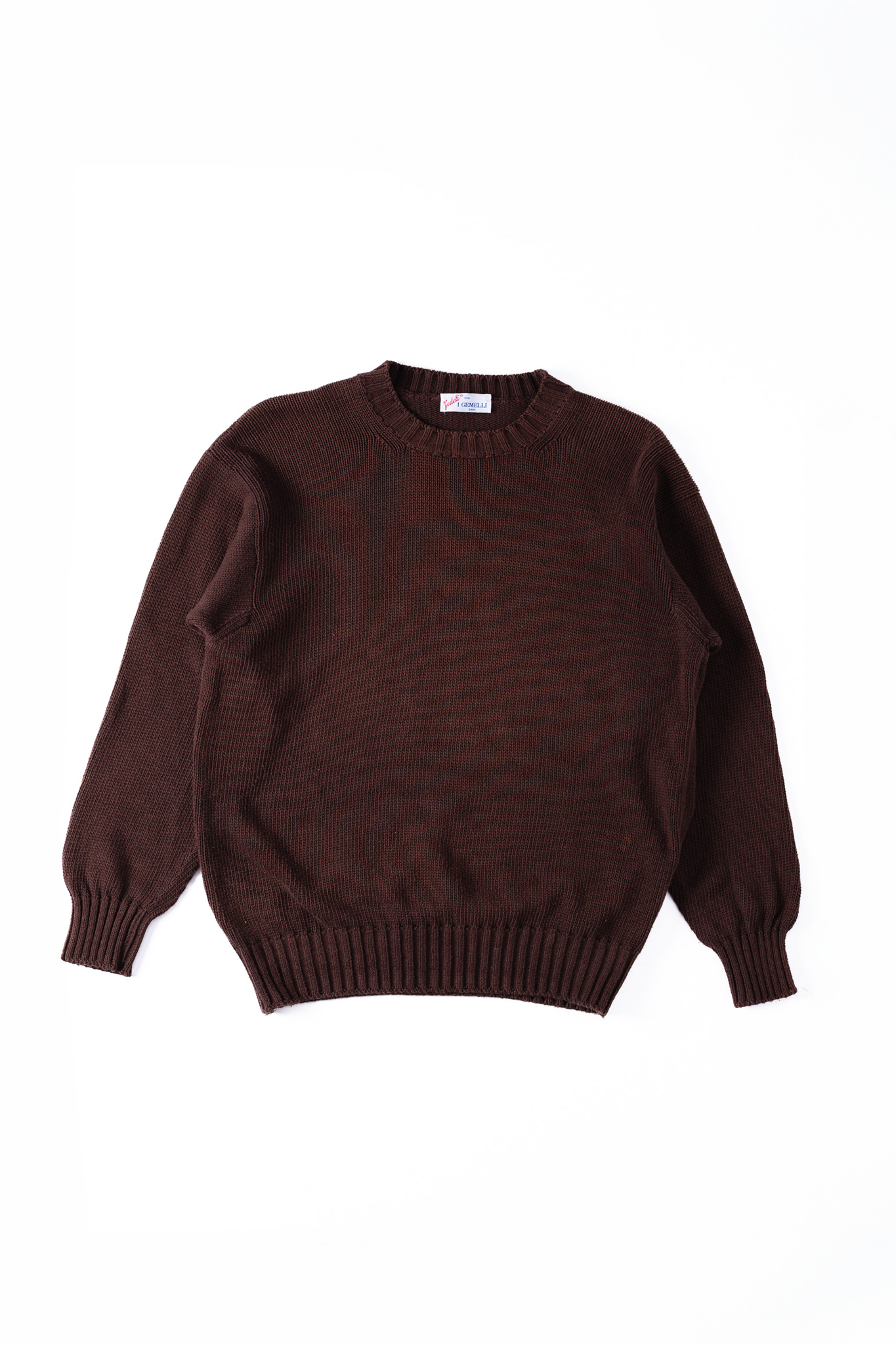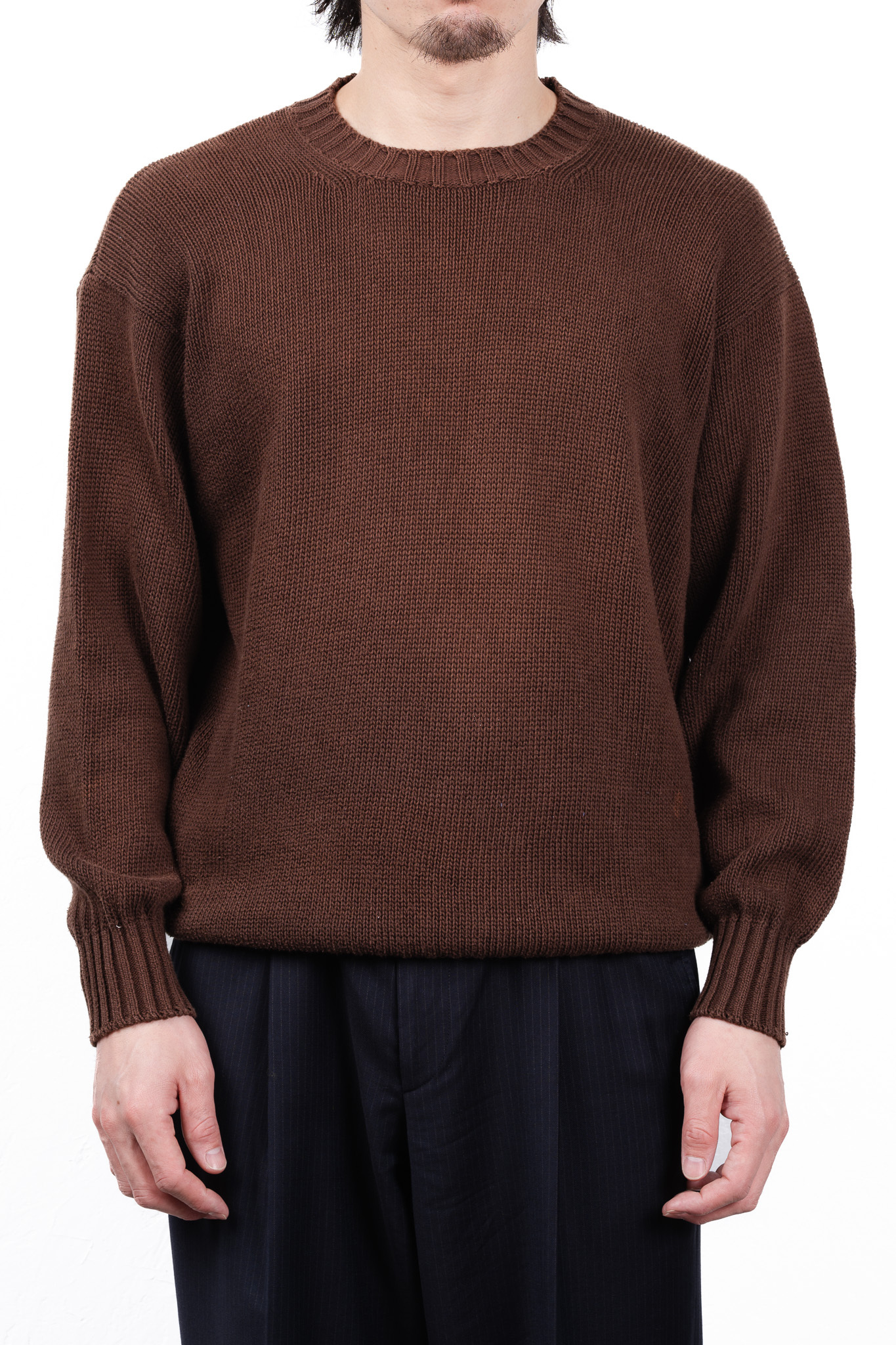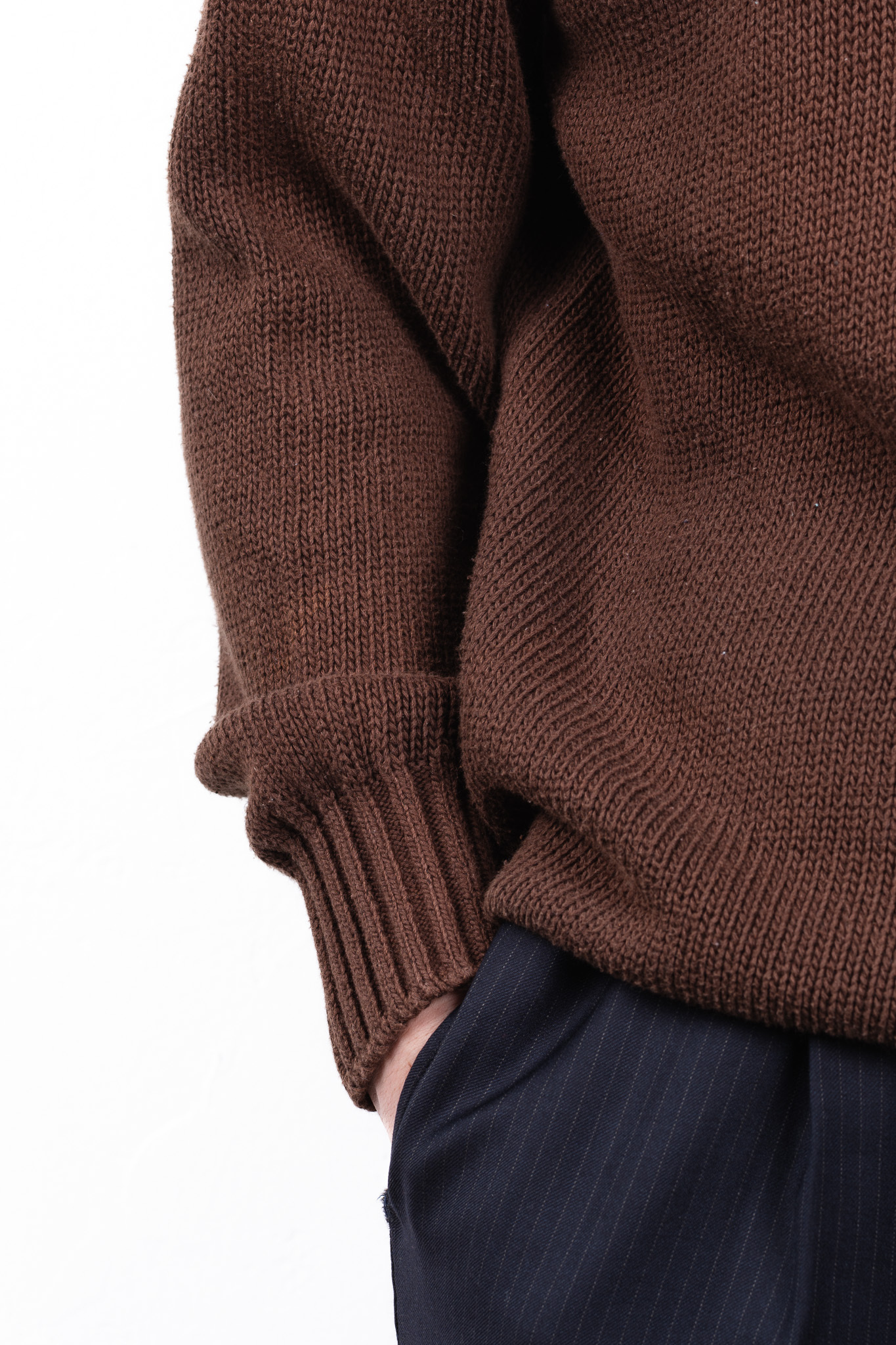 本作は、そんなFedeliの揺るぎない美学とクラフツマンシップが最も純粋な形で立ち現れた、極めてソリッドで完成されたダークブラウンのコットンニットセーターです。