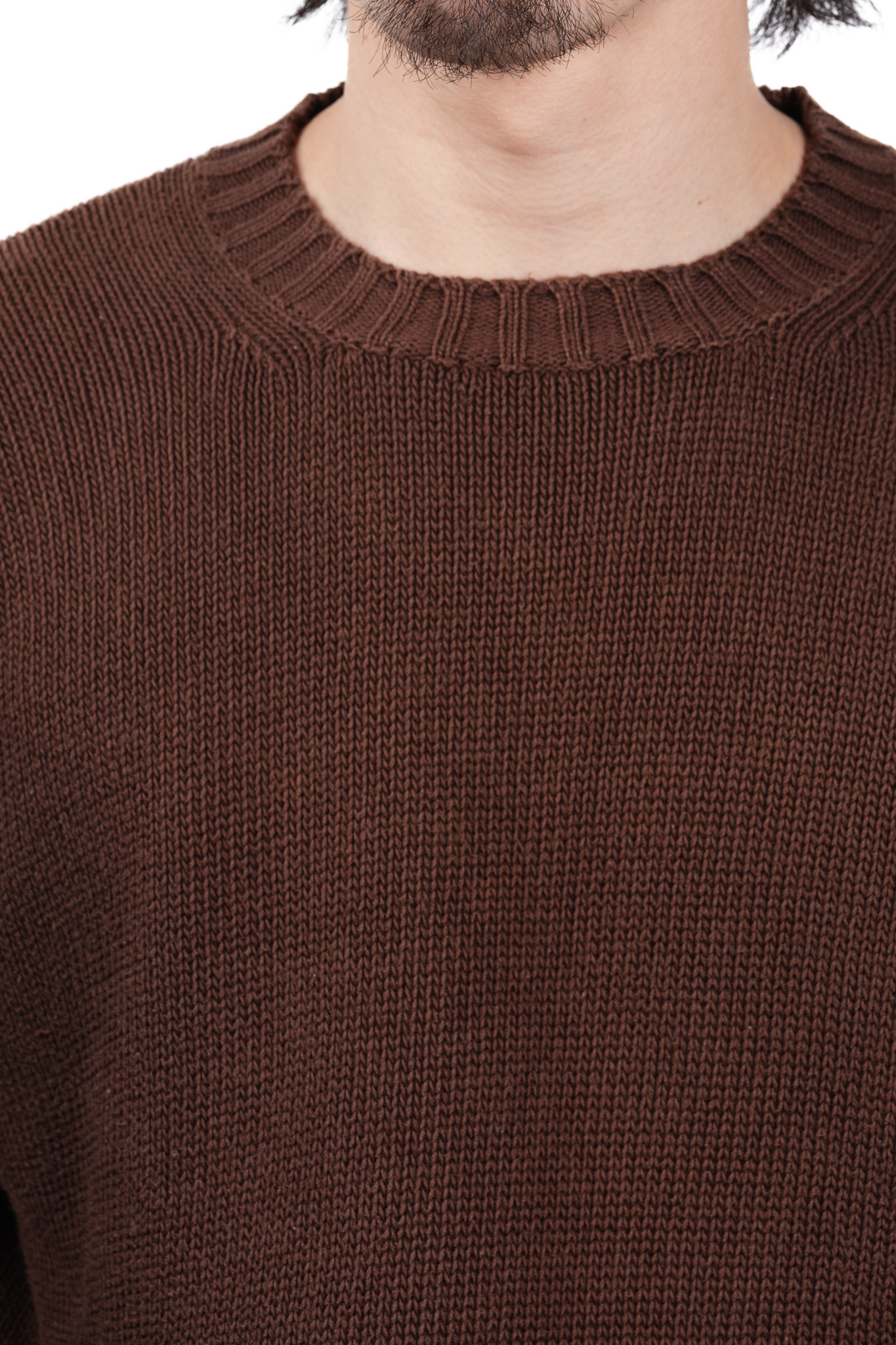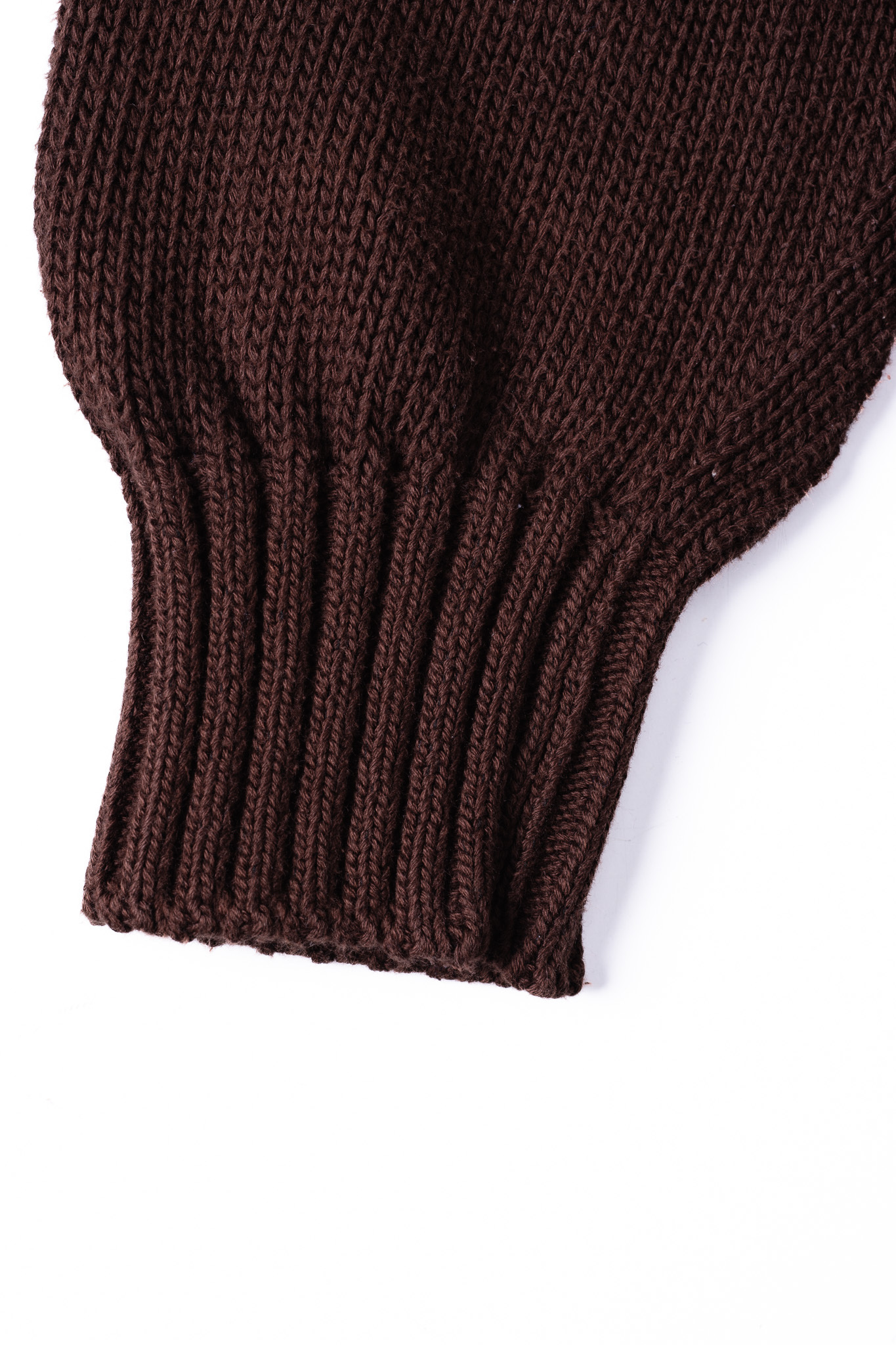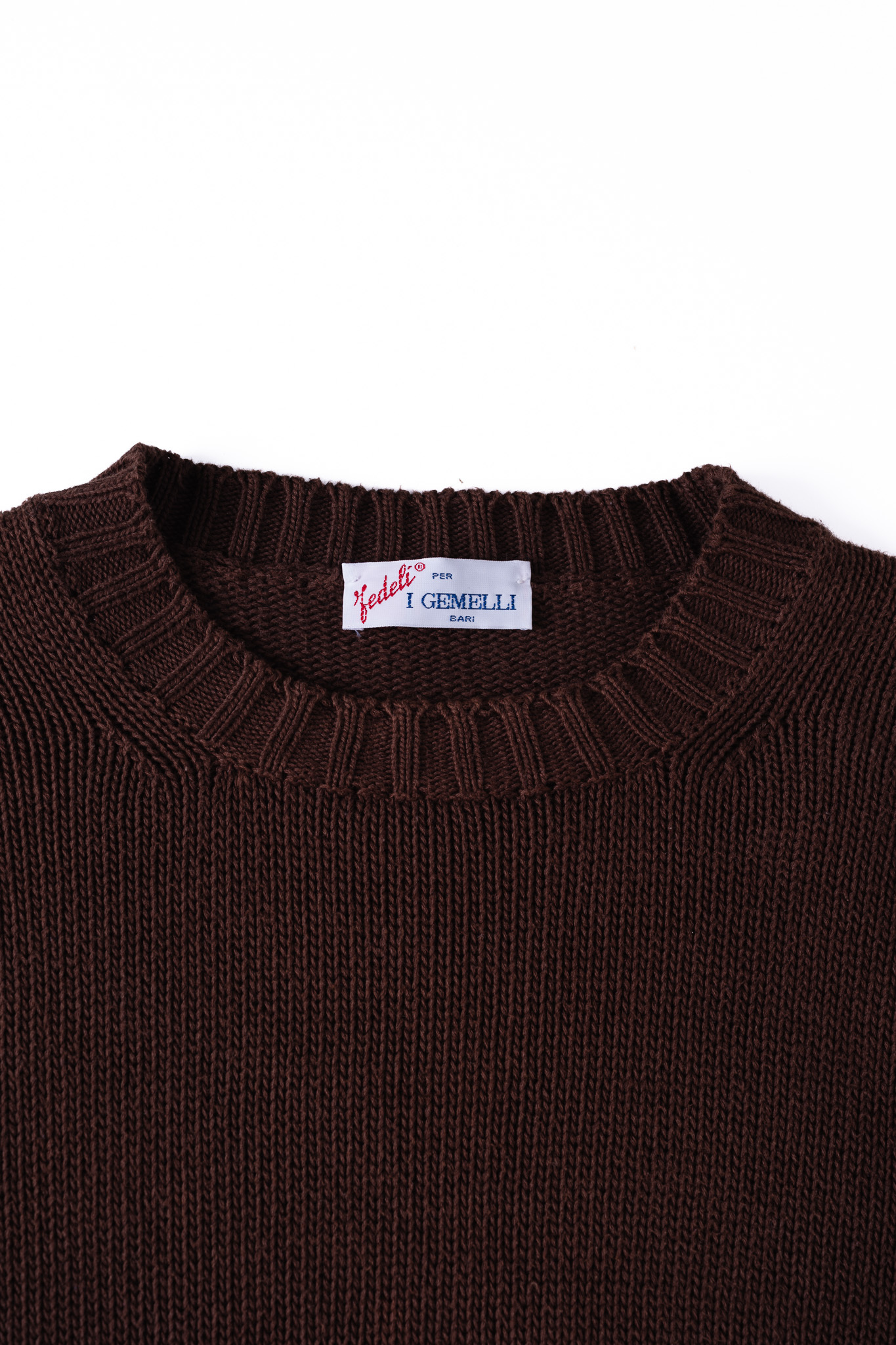 本作は、そんなFedeliの揺るぎない美学とクラフツマンシップが最も純粋な形で立ち現れた、極めてソリッドで完成されたダークブラウンのコットンニットセーターです。