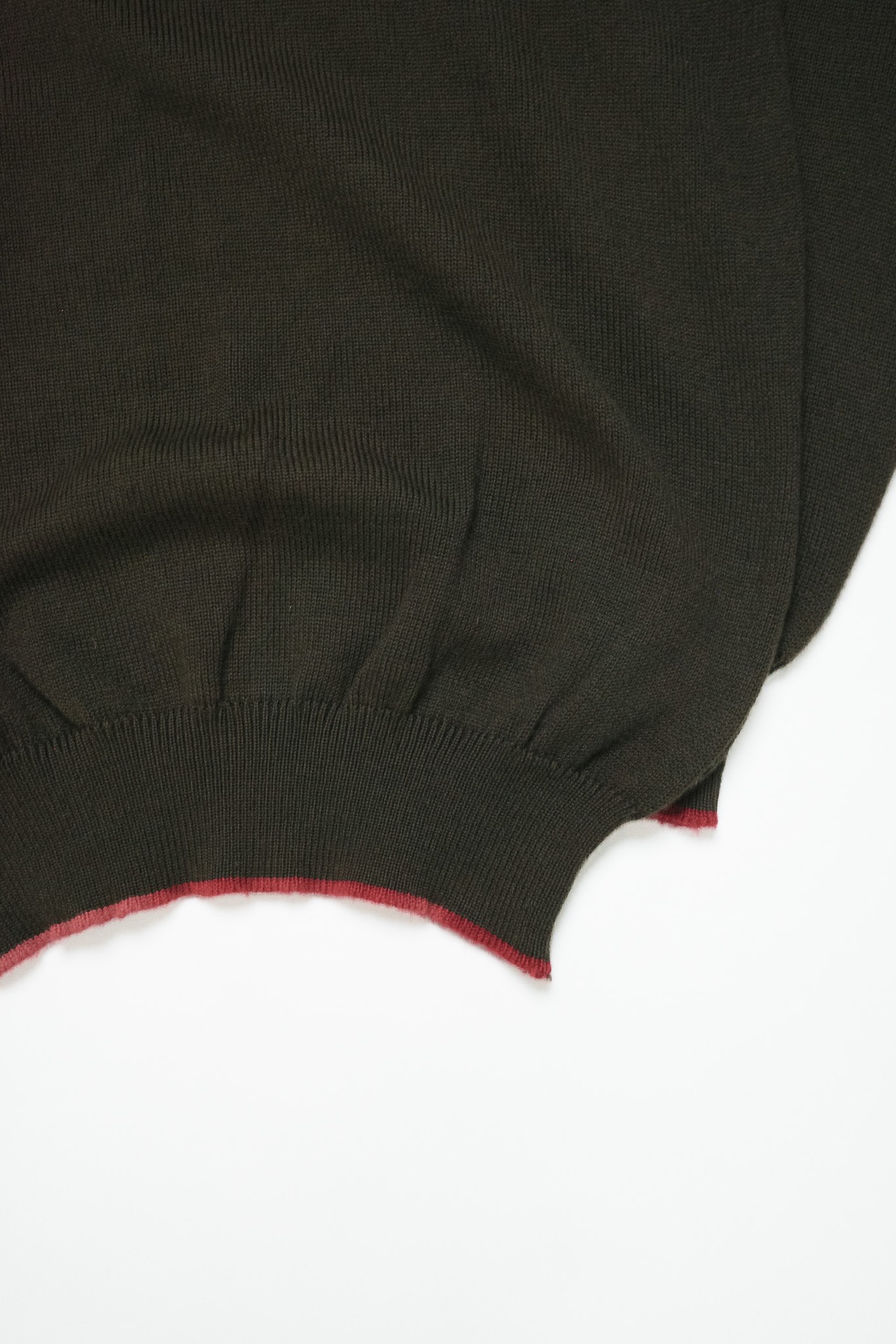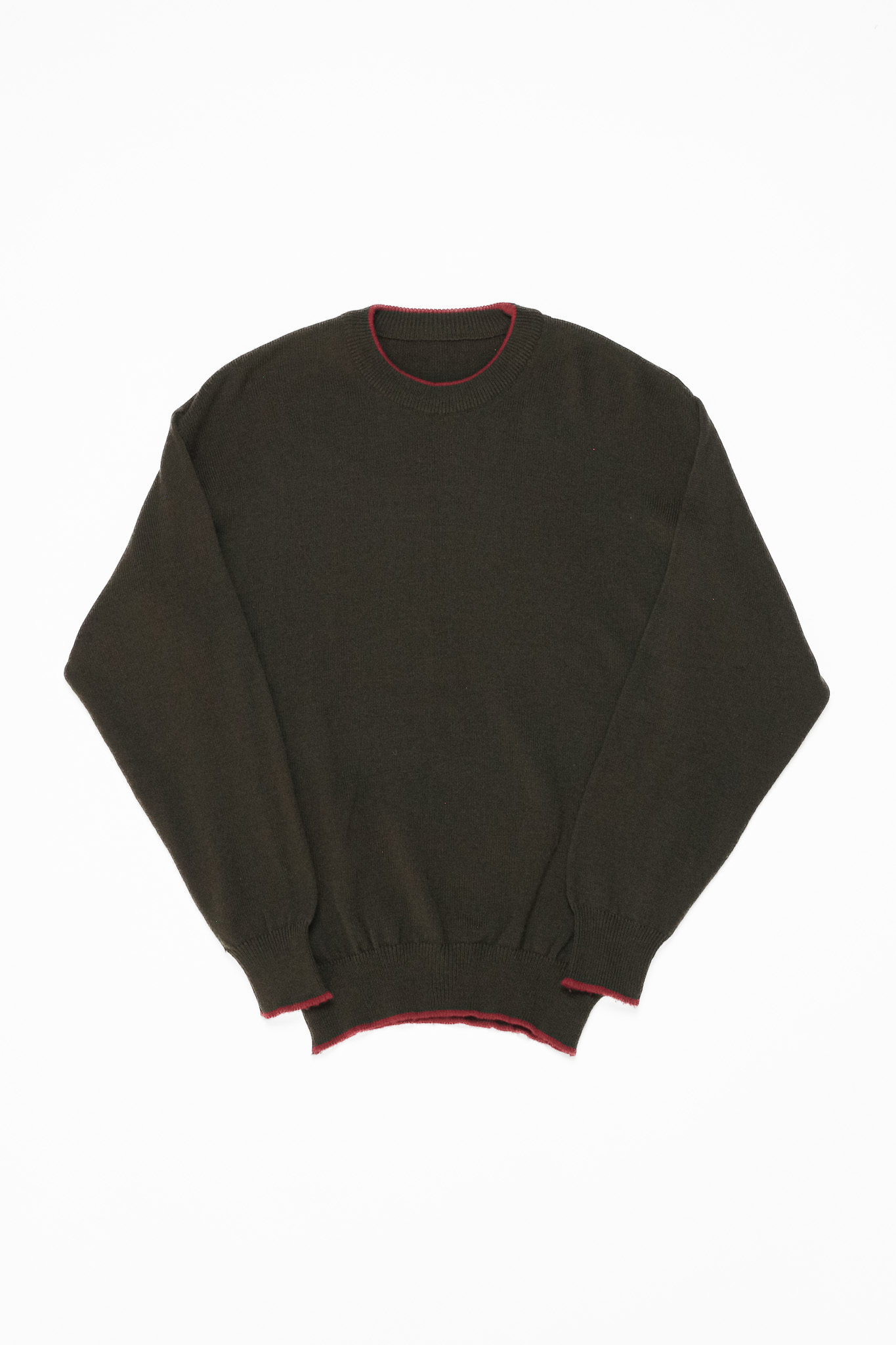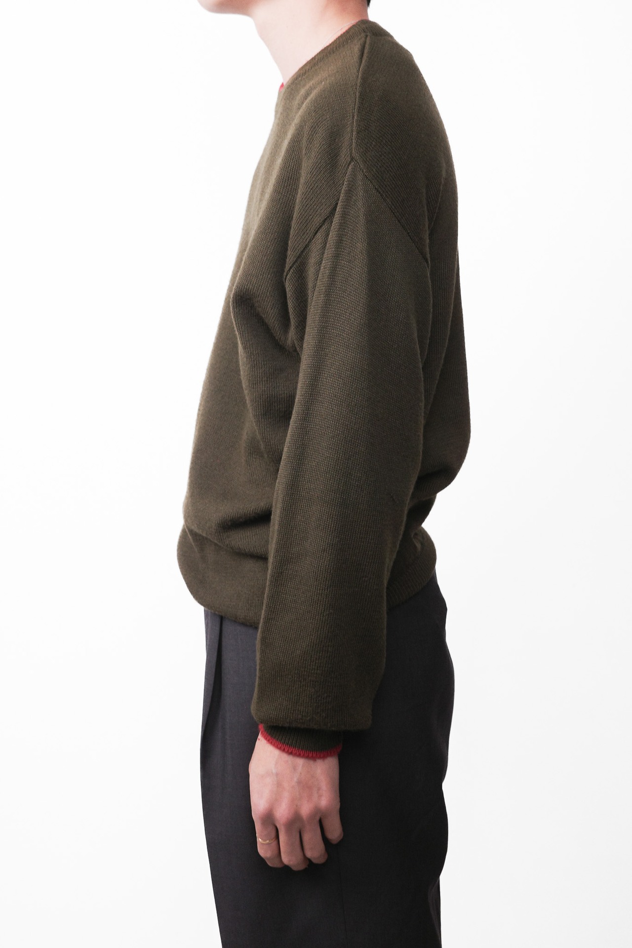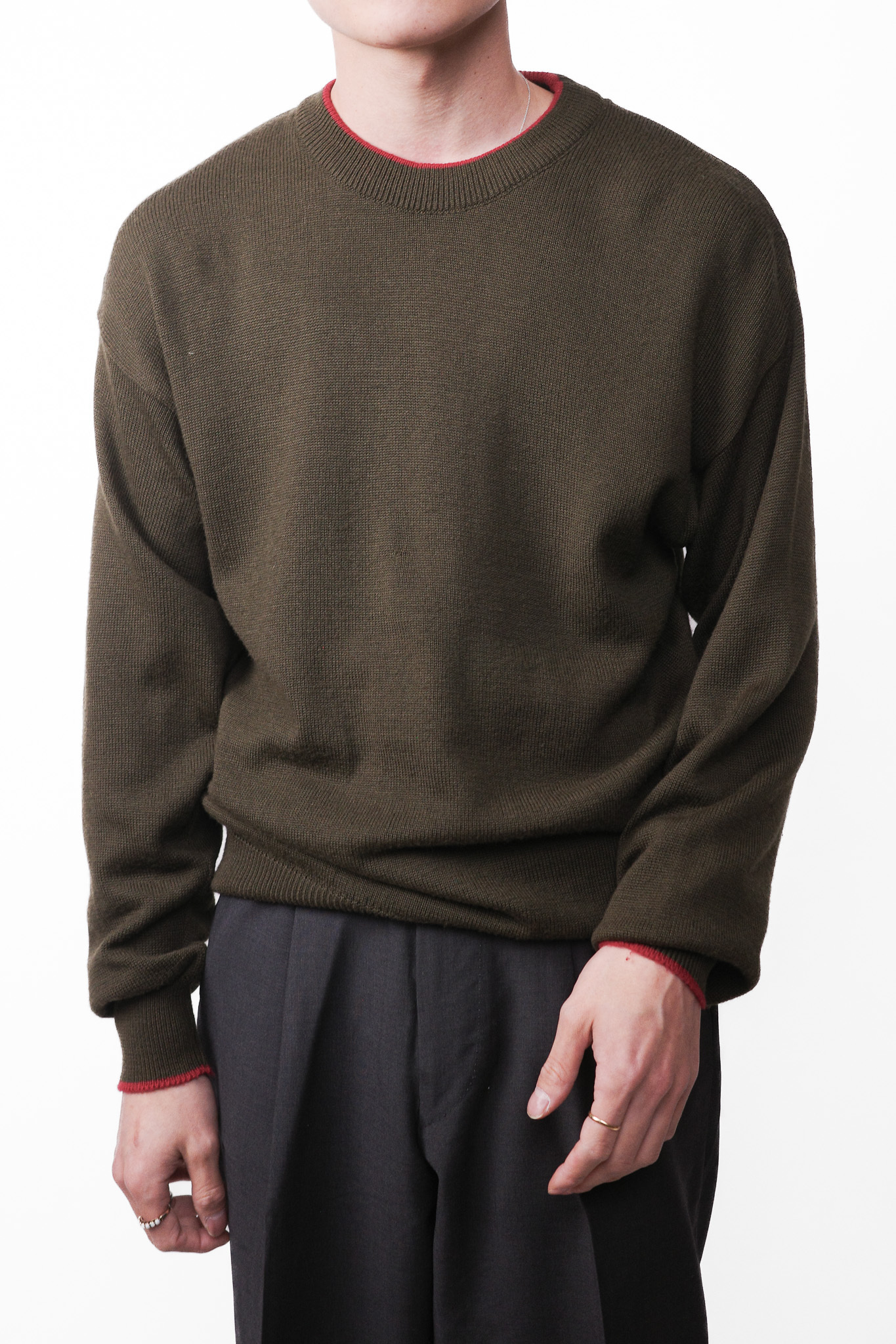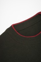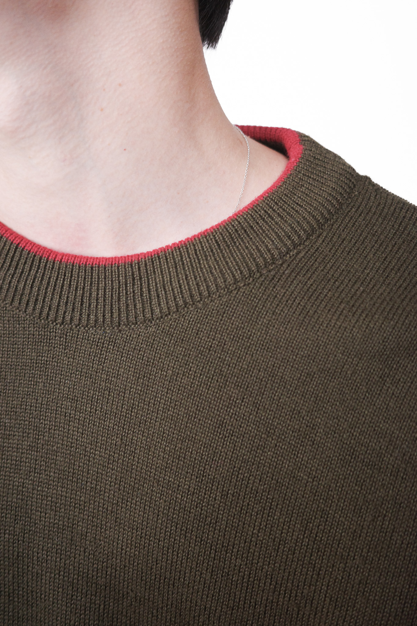 リブの先端にはニットウェアを彩る赤の差し色を組み込み、肩はしっかり落ちる丸みを帯びたシルエット。