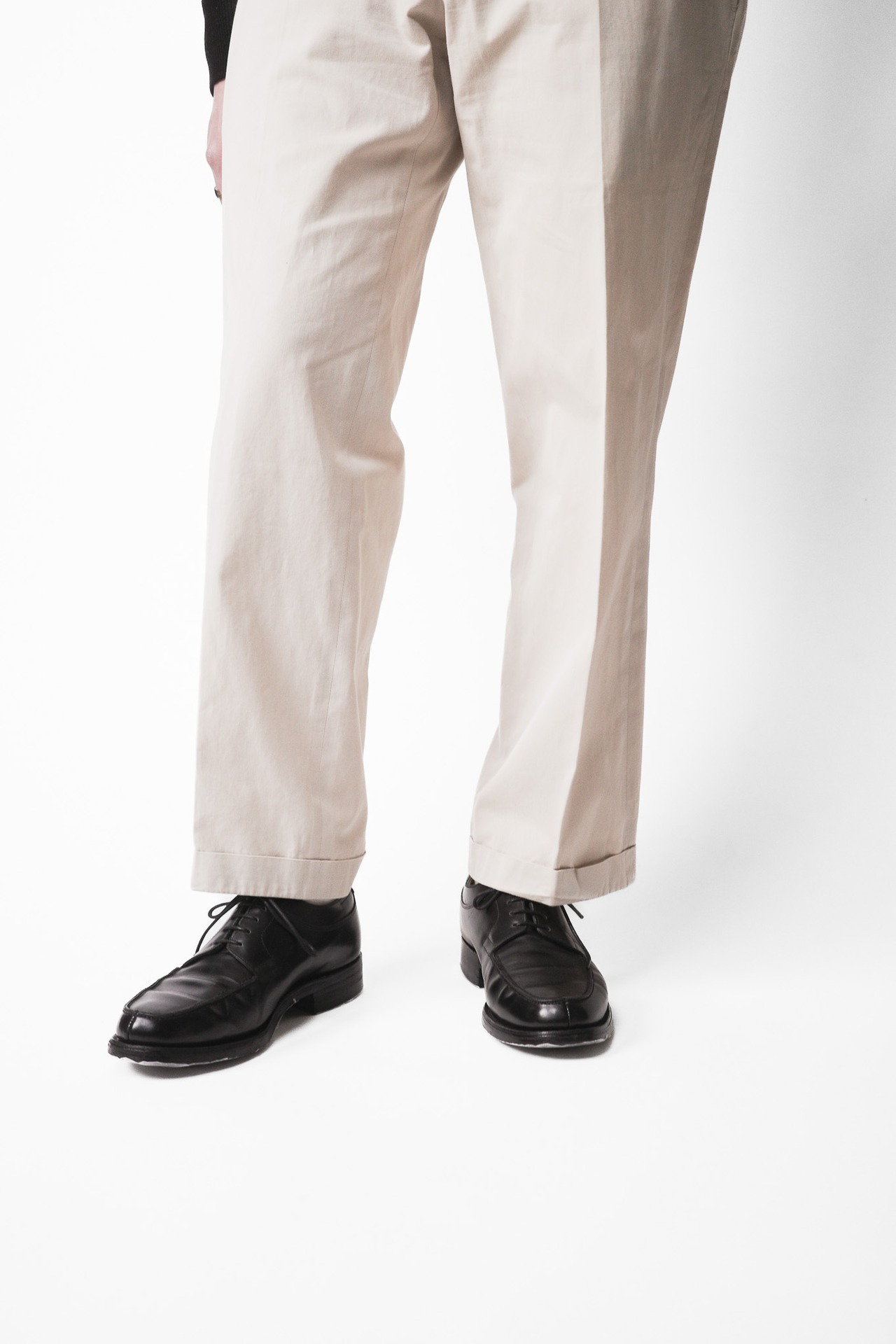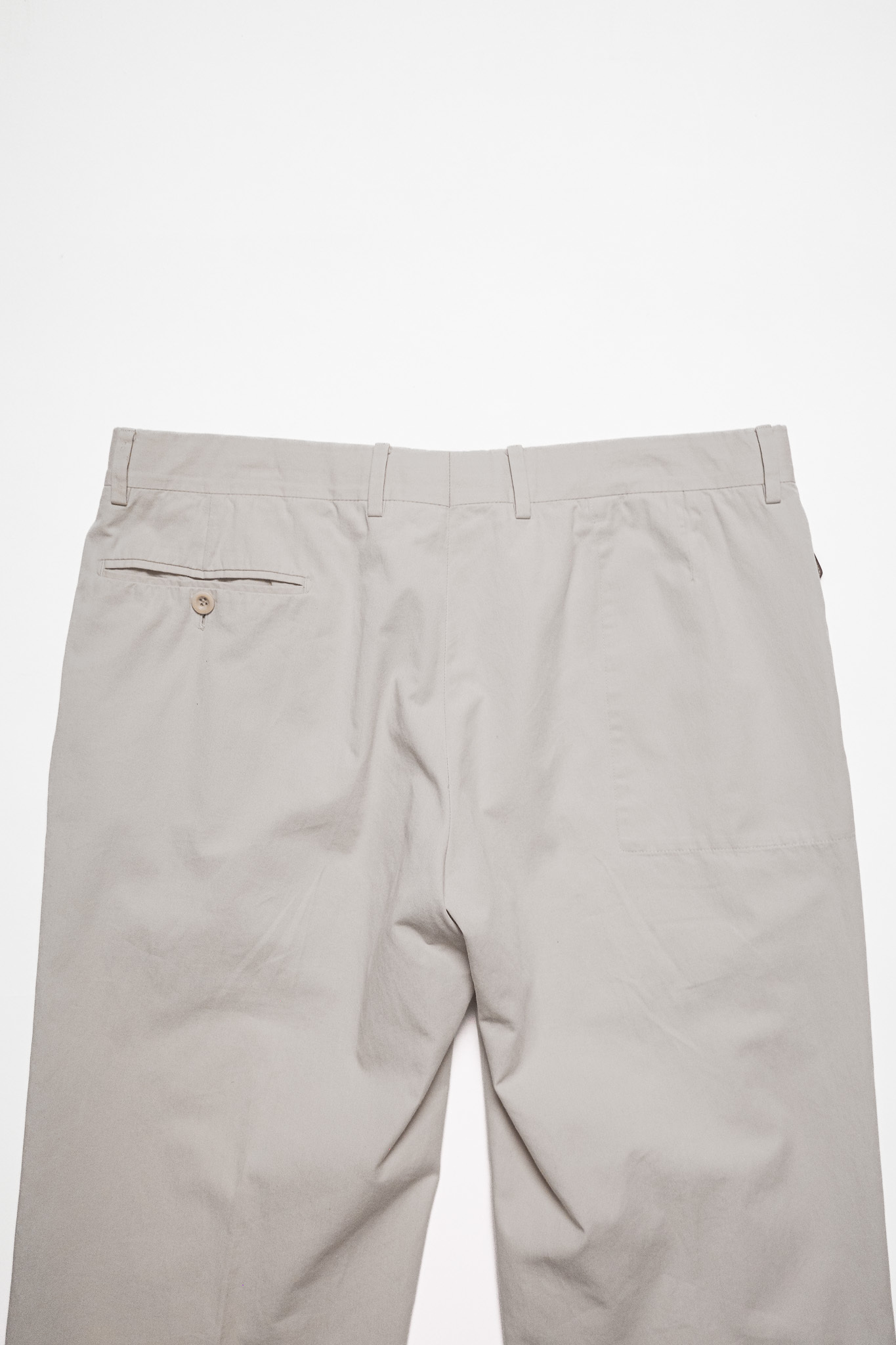 ノータックのストレートシルエット、加えてベージュカラー。
