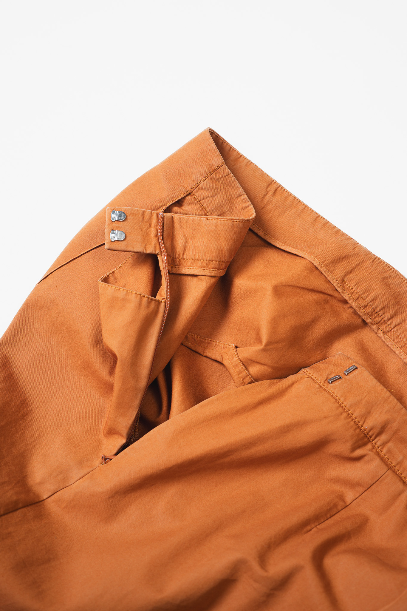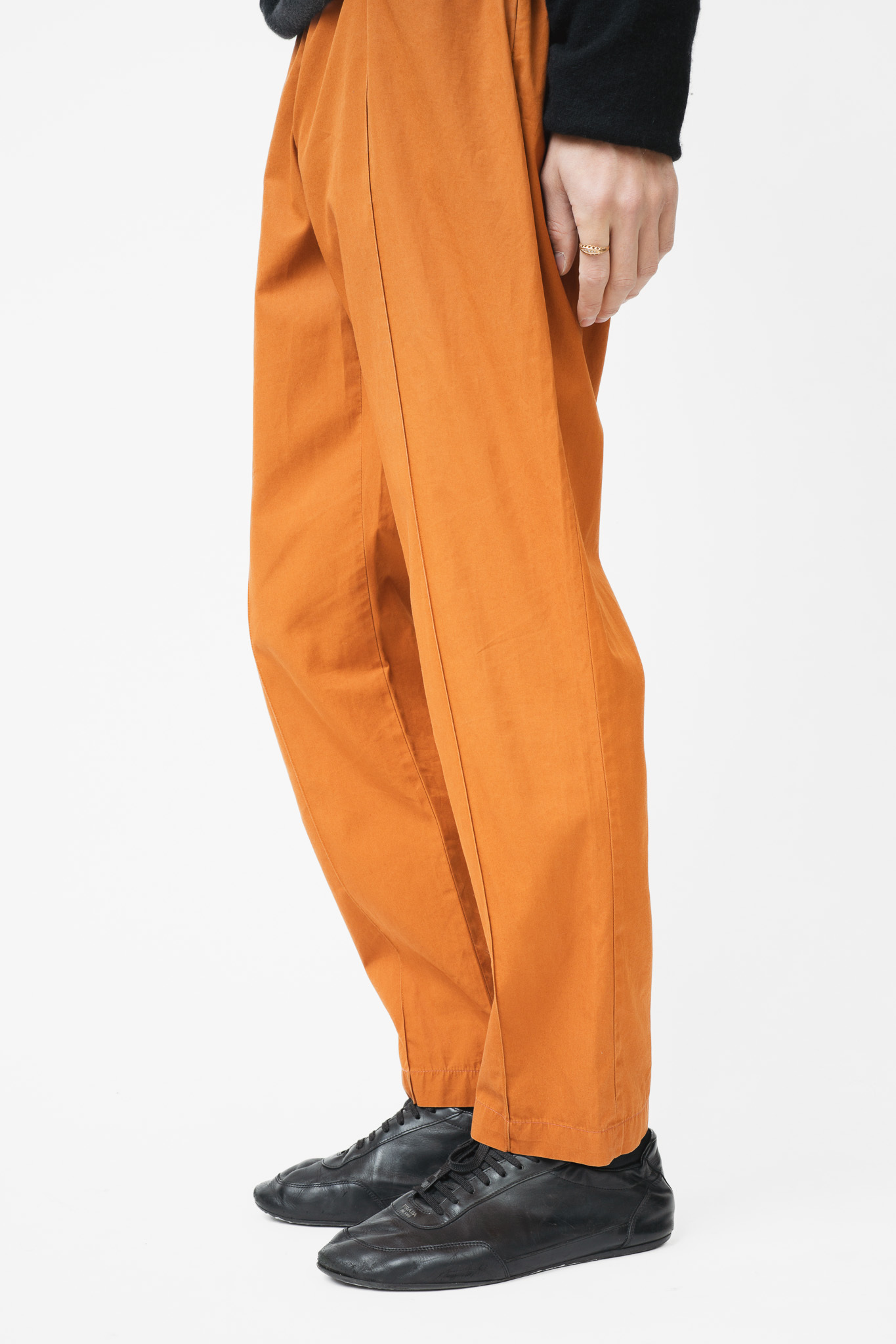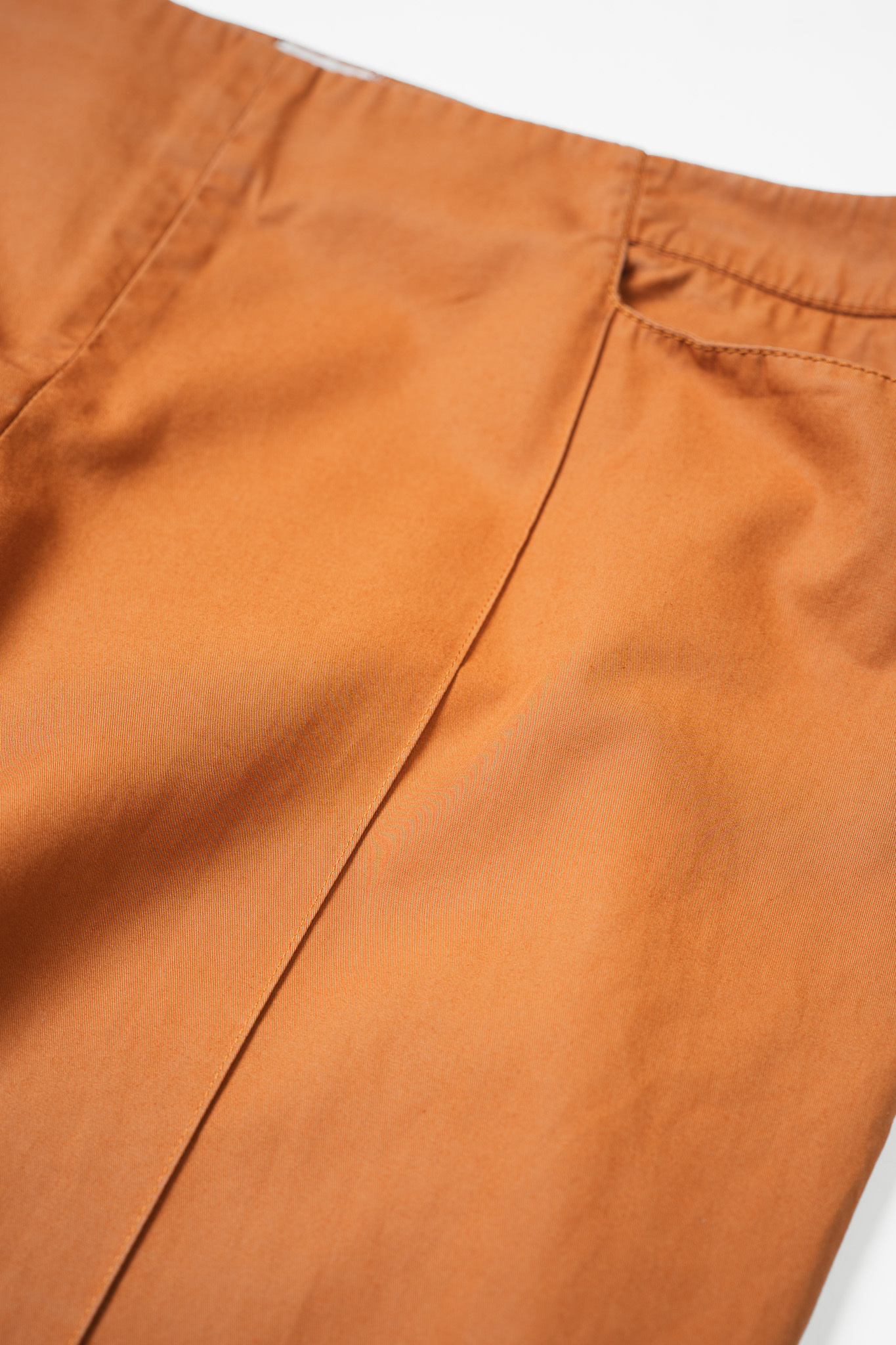 リゾートライクなテラコッタのコットンツイルは目が細かく淑やかな光沢。