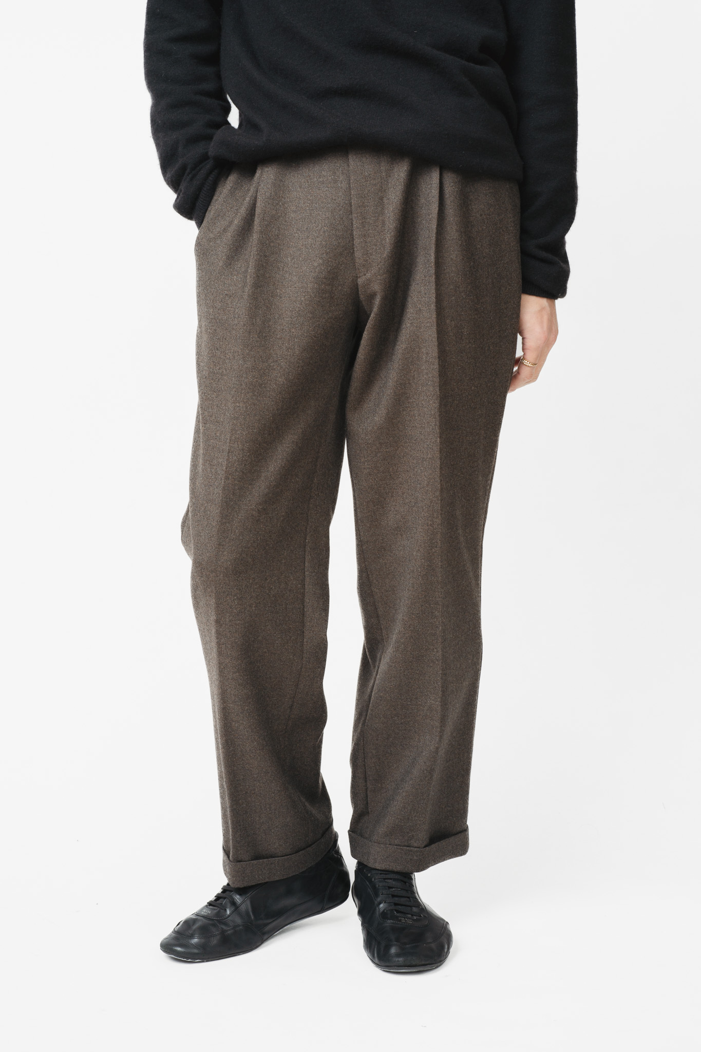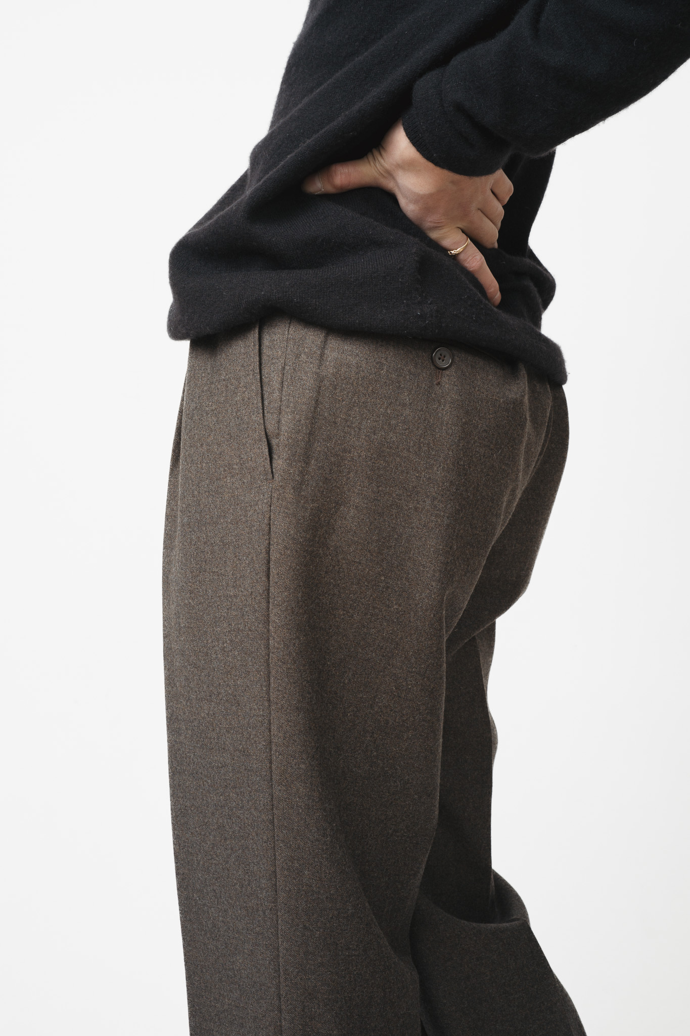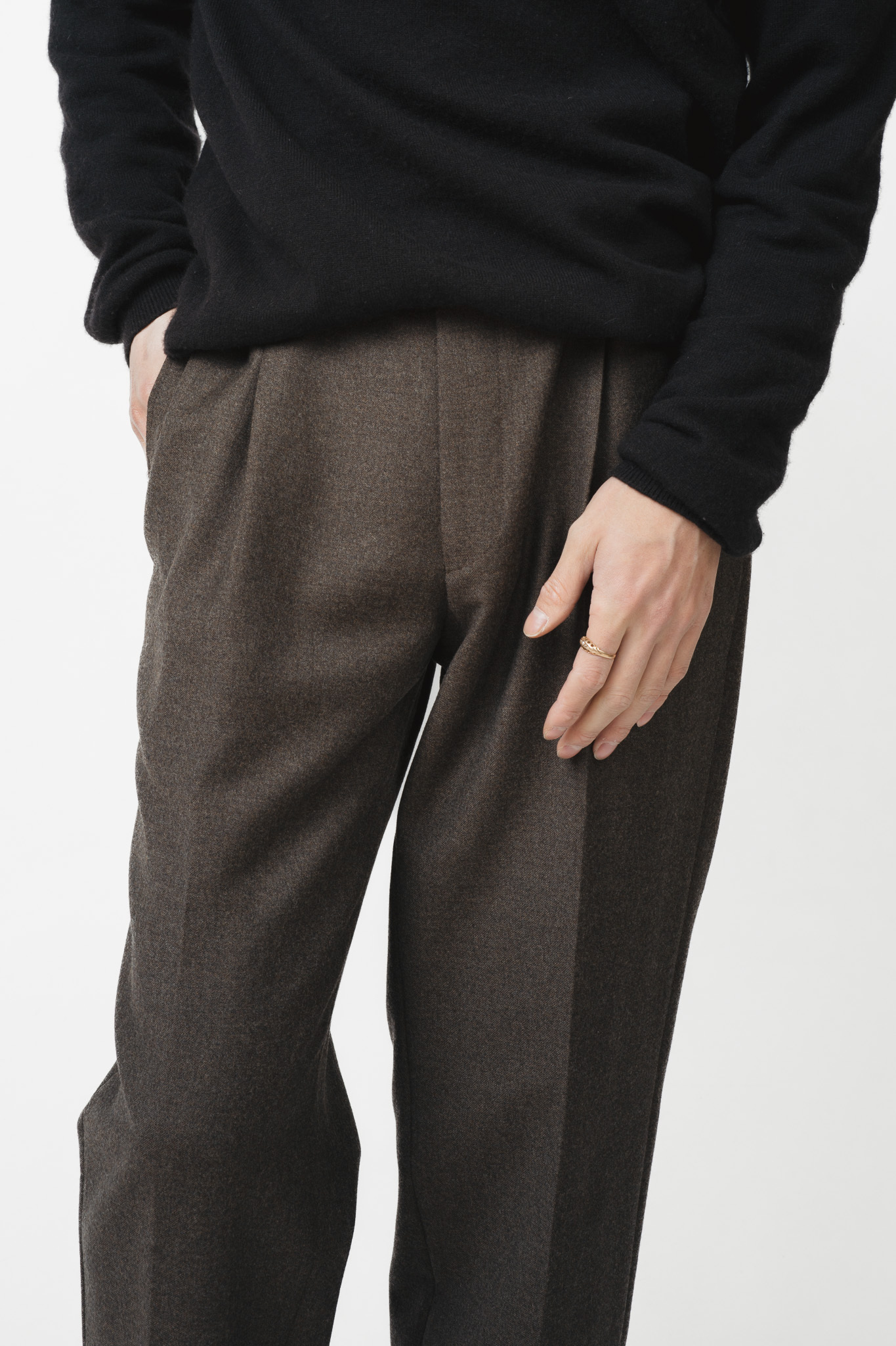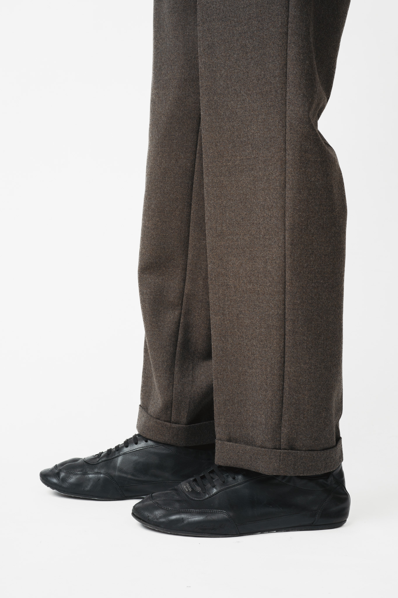 滑らかで艶っぽいきめ細かなウールは紡毛でありながらゴリッとした無骨な空気はなく、また深くグレイッシュなブラウンというのもあり、実にイタリアらしい色気ある表情。