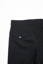こちらのパンツは、マルニらしい上品さと実用性が融合した一本。フロントはすっきりとしたノータック仕様、ヒップ部分は左右で異なるデザインを持ち、片側がフラップ付きポケット、もう一方が片玉縁ポケットというユニークなディテールが魅力です。程よくテーパードしたシルエットは足元をすっきりと見せ、裾にかけての美しいラインが特徴。