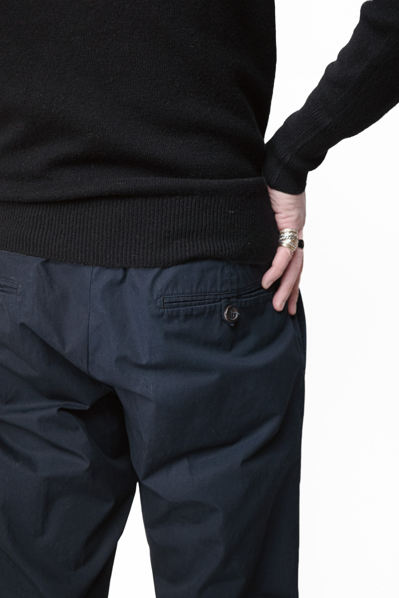 ゆったりとしたウエストから、直線的に伸びるシャープなテーパードシルエットが美しい。