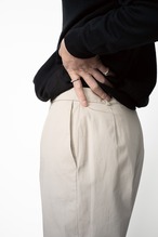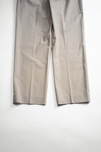チノクロスよりも高密度に織られたギャバジンクロスが採用されておりまして、その密度それ自体も、そして使われている高番手の糸による滑らかさであったり、各シームが訴えかけてくるステッチワークの細かさ美麗さであったり、裾はシングル仕立てであったりなど、至る所に散りばめられたドレスパンツのようなテイスト達により、ドレッシィなカテゴリにまで持ち上げられるほどに品が良く、ベルトループ5つでコットン100のワークパンツらしい感じはしっかりと伝わる、けれどもまるでスラックスのようである、といった矛盾した印象を受けます。
