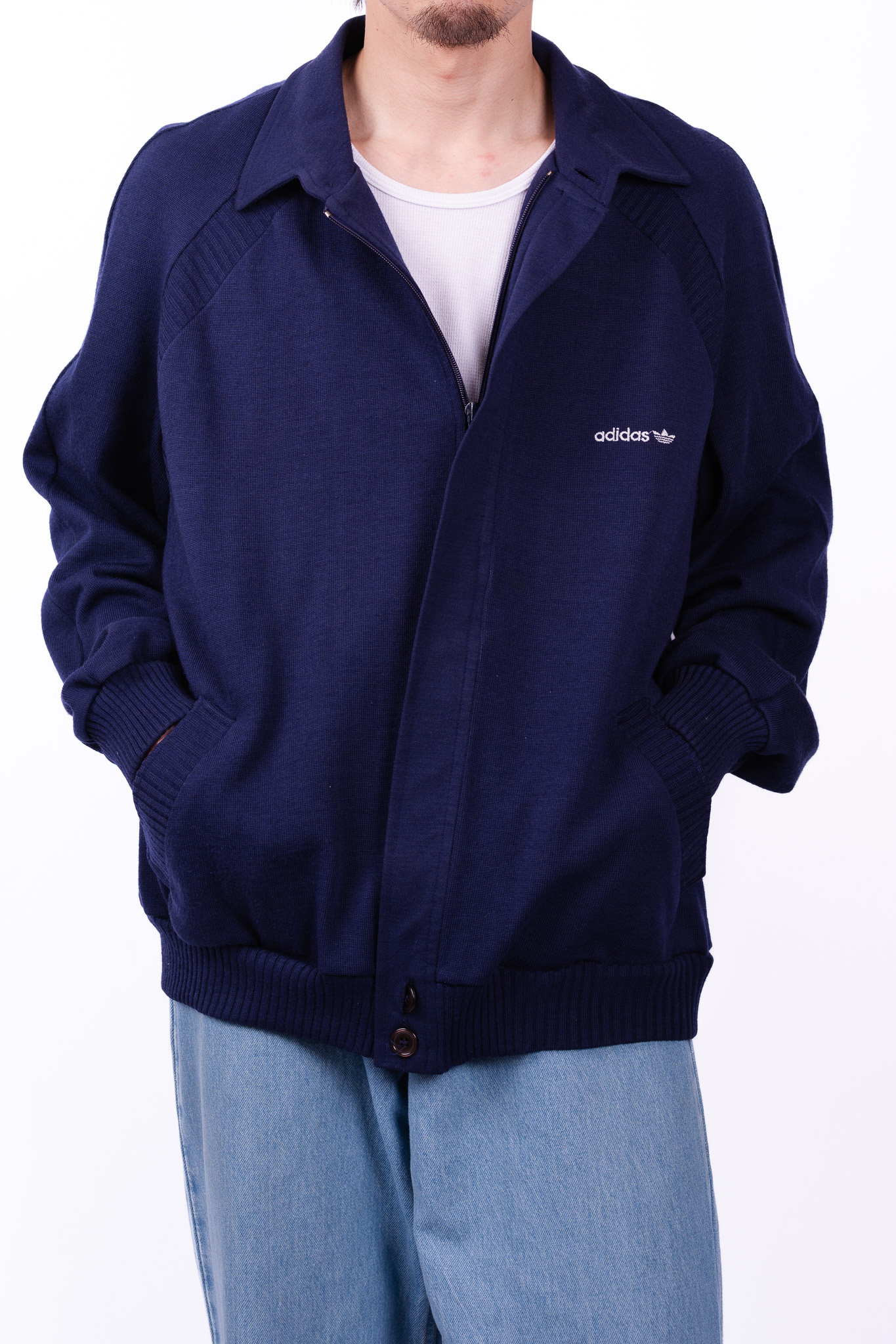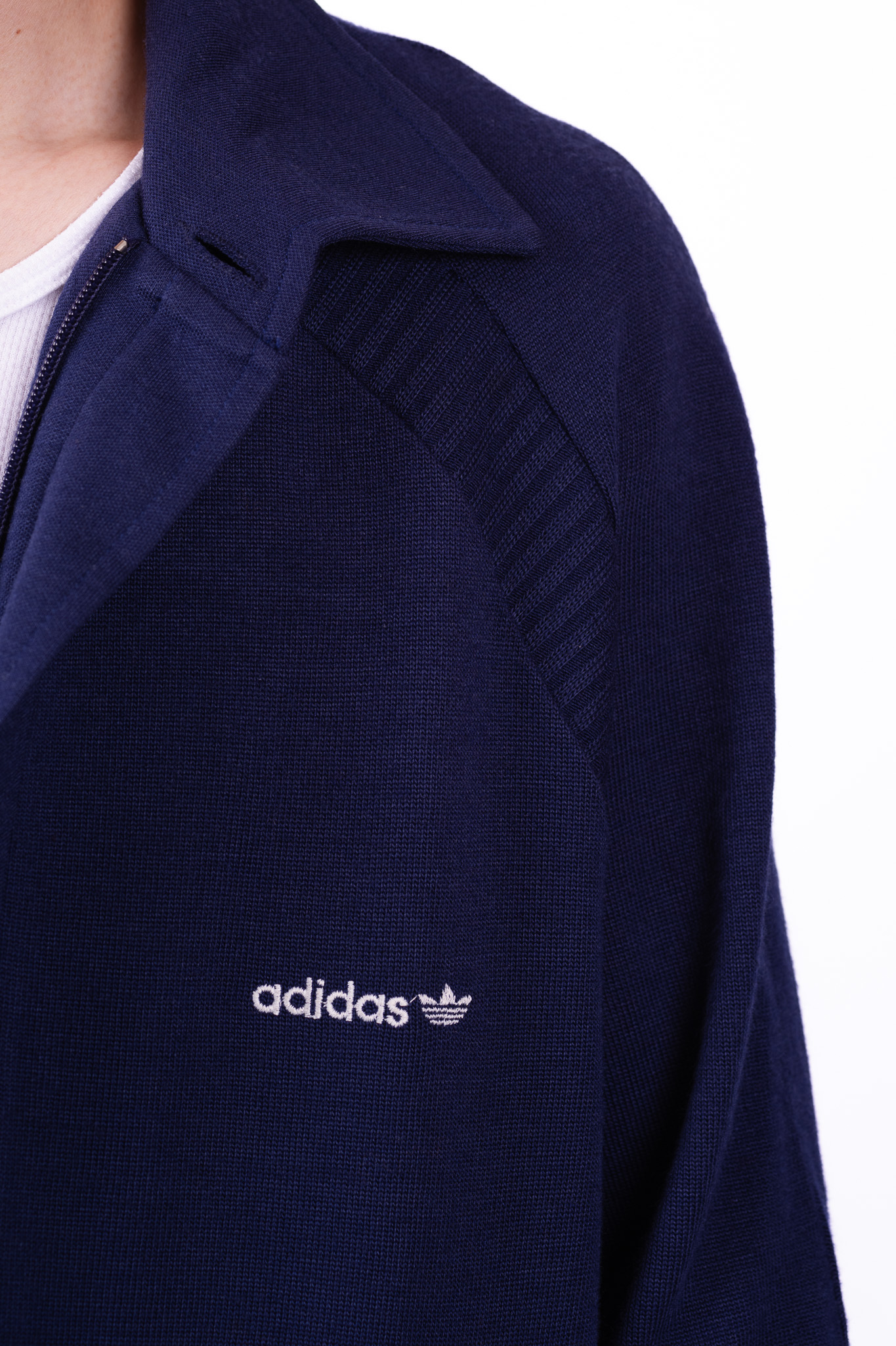 左胸にはトレフォイルロゴとブランドネームの刺繍が控えめに配置されています。