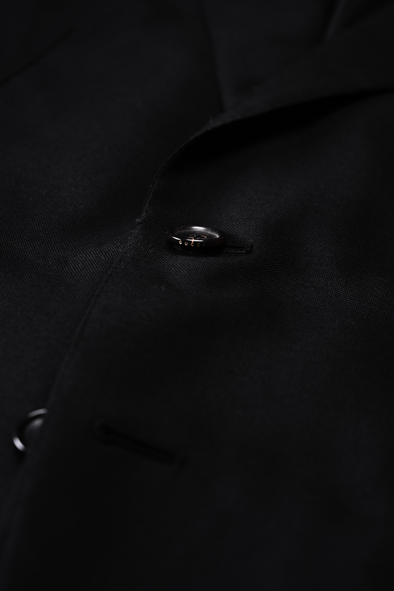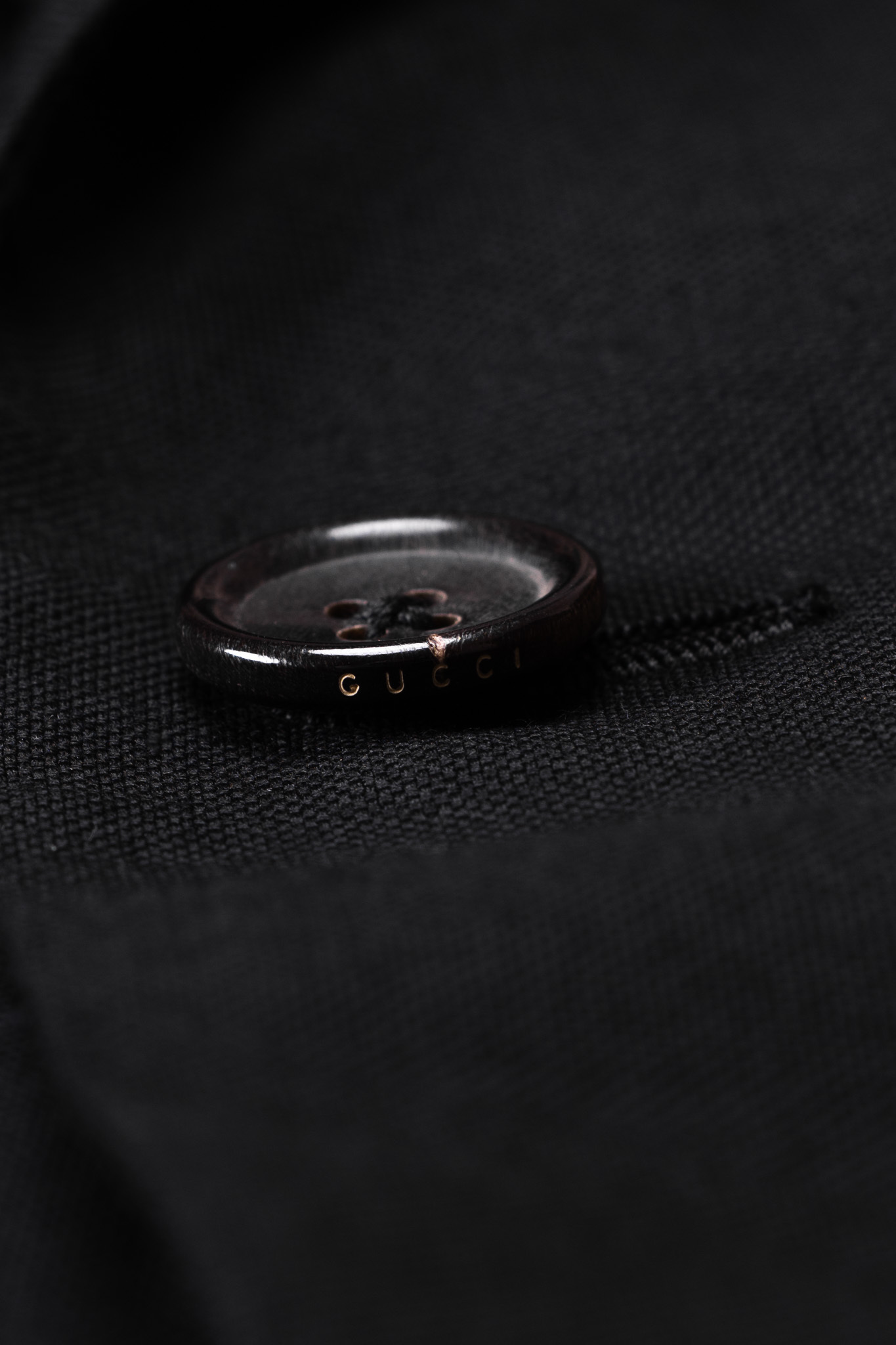 ボタンには「GUCCI」のロゴが刻印されたホーンボタンが使われ、その钝い光沢が全体の高級感を高めています。