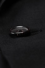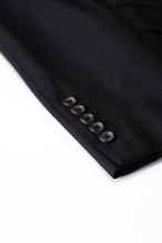 間隔を詰めて連続させたボタンのリズムが、袖先に視覚的な緊張感と縦のラインを生み出し、全体のシルエットをよりシャープに引き締める役割を果たしています。