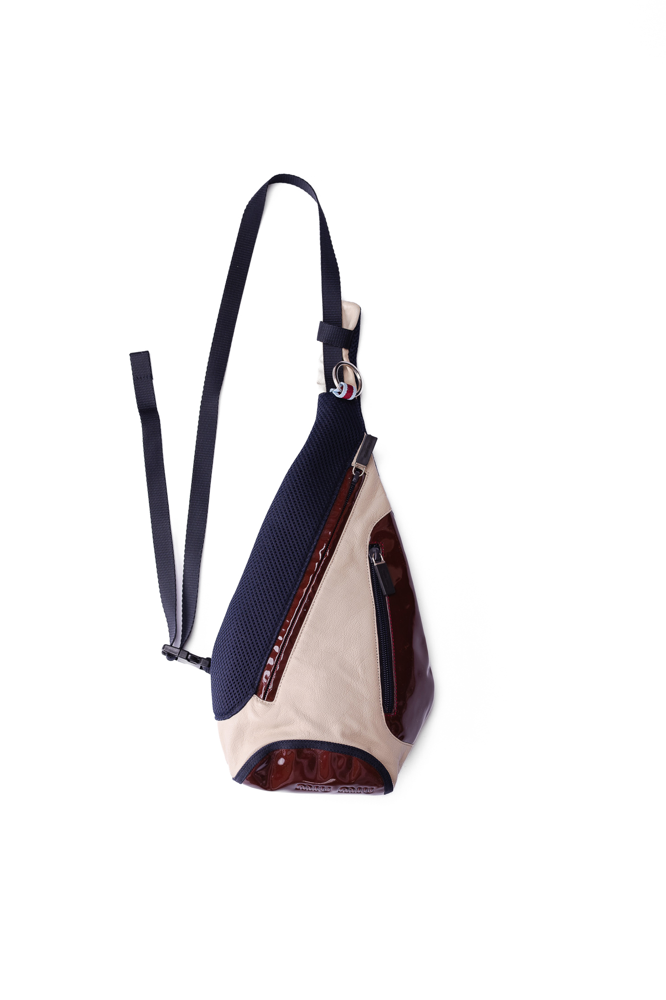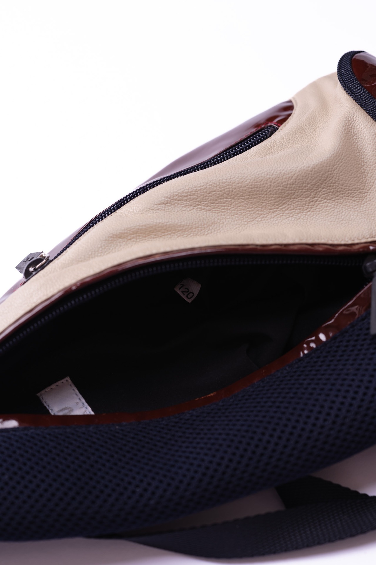 このポケットの存在さえもデザインの一部として溶け込ませるミニマルなアプローチは見事です。そして、このポケットのジッパーには、ブランドの刻印が入った黒い樹脂パーツが引き手として取り付けられており、鈍い光沢を放つエナメル地に対する唯一の視覚的なアクセントとして機能しています。