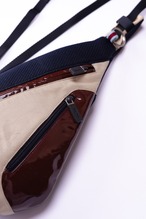 バッグの顔となるフロントパネルには、グレインの美しいレザーと、周囲の光を反射して深い艶を放つエナメル素材を採用しています。レザーのような重厚感と、工業製品のような無機質な表情を併せ持つこのテキスタイルが、バッグ全体にシャープで都会的な緊張感をもたらしています。
