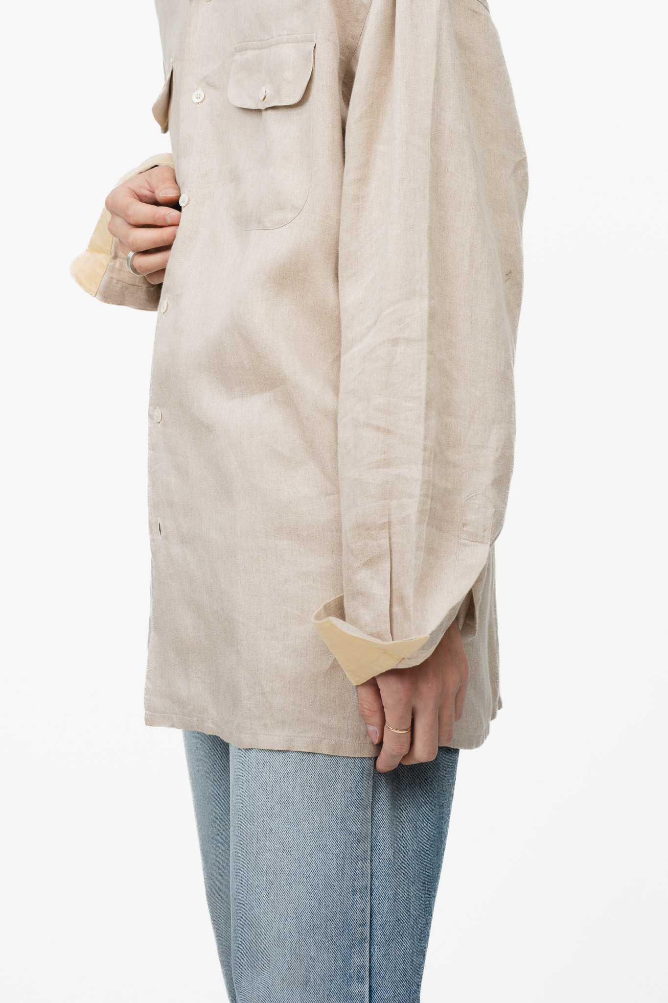 コシの強い生地でキチンと感があり端正な印象、ではございますが重たさはなくリネン特有の軽やかさや砕けた雰囲気を与えてくれるシワ感などは損なわれておりません。