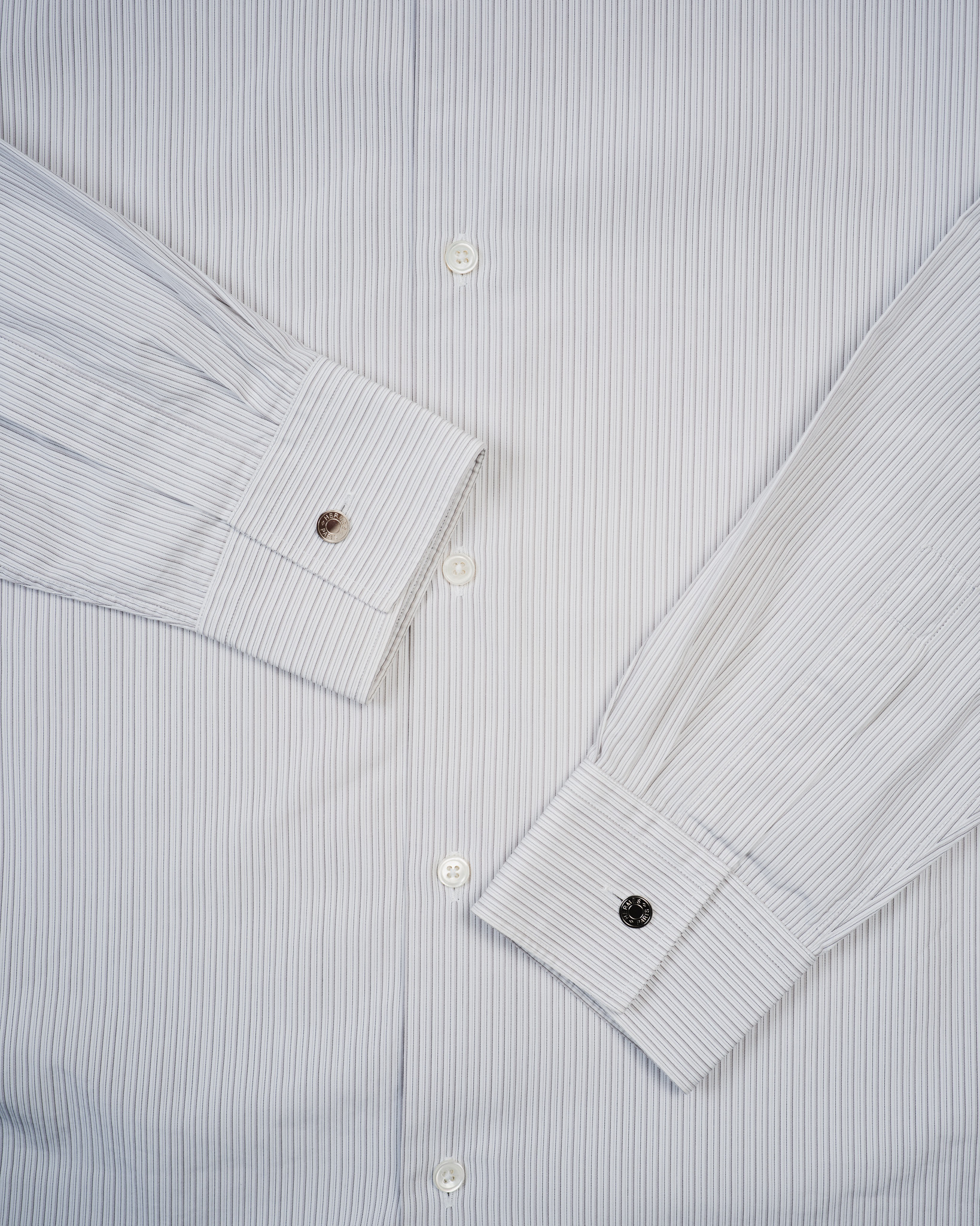 そして袖口に配されたのが、HERMÈSを象徴するセリエボタン。メタル製のこのディテールは、馬具製造にルーツを持つ同メゾンならではの“機能美”の結晶とも言えるもの。カフリンクスのように存在感を示しながら、過剰にならない絶妙なバランスでシャツの格を引き上げています。