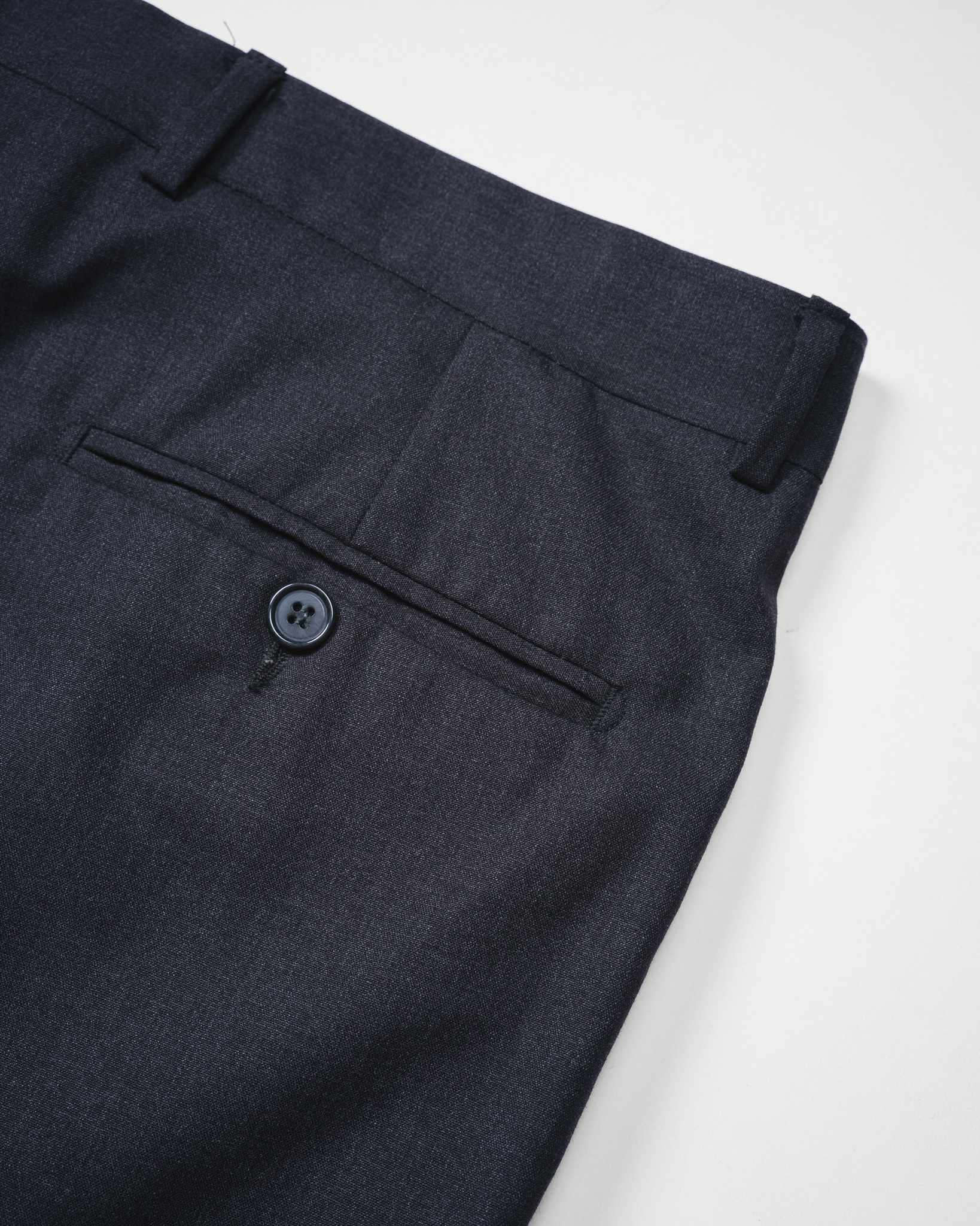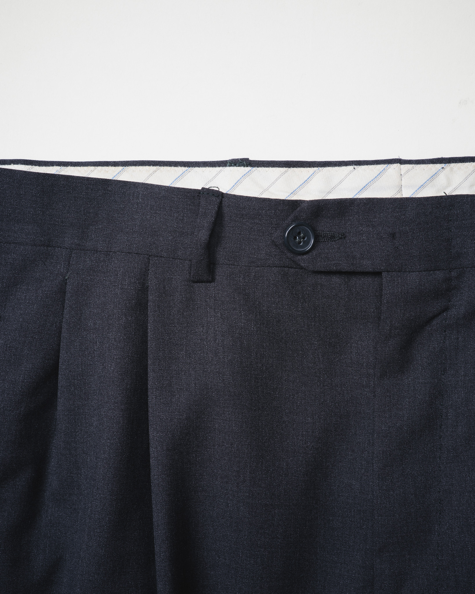今回ご紹介するネイビーのスラックスは、その正統な系譜でありながら、冬の冷気に負けない密度を持たせた「WINTER TASMANIAN」を用いた一着です。