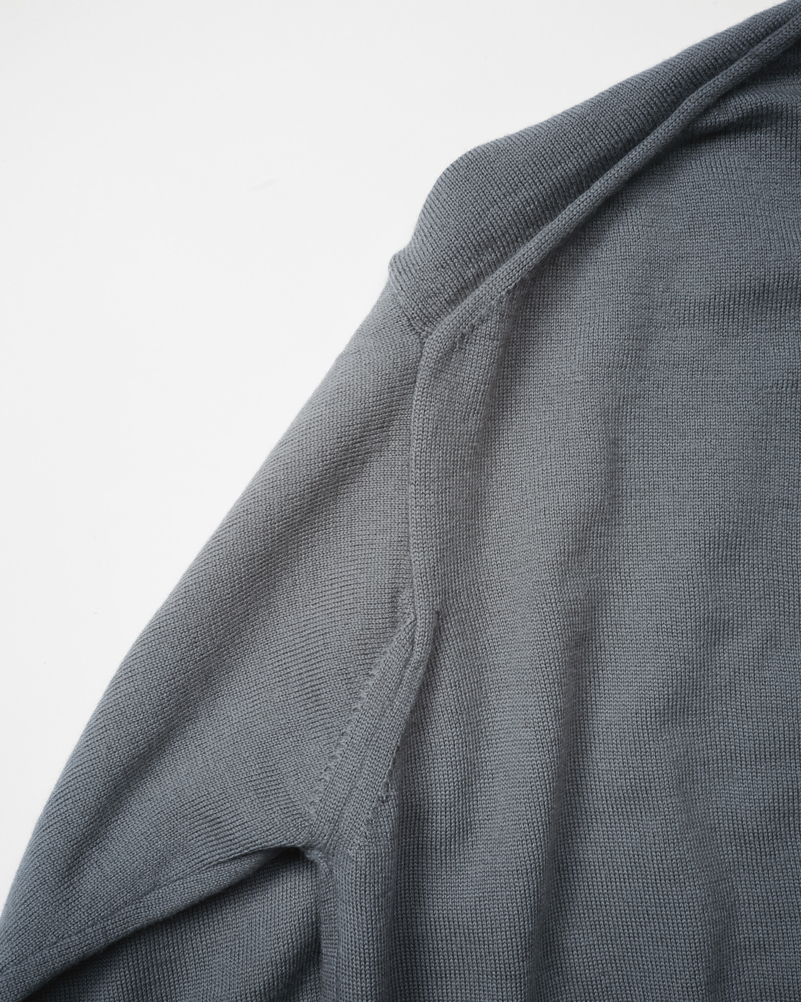 そして肩周りの作りはフルファッションで仕立てられ、ライトなニットウェアながら身体に適度な余白をつくりながら立体的に収まるシルエットを形成しています。
