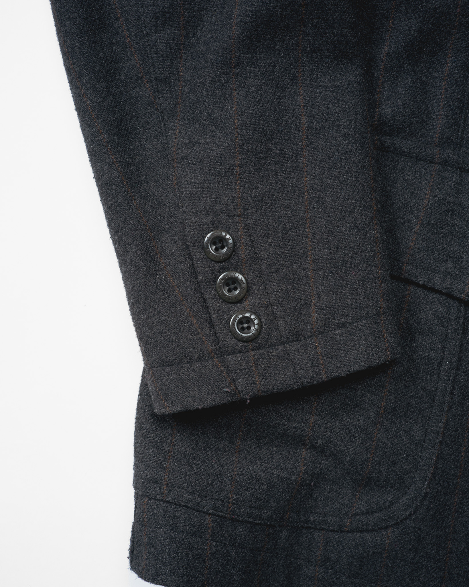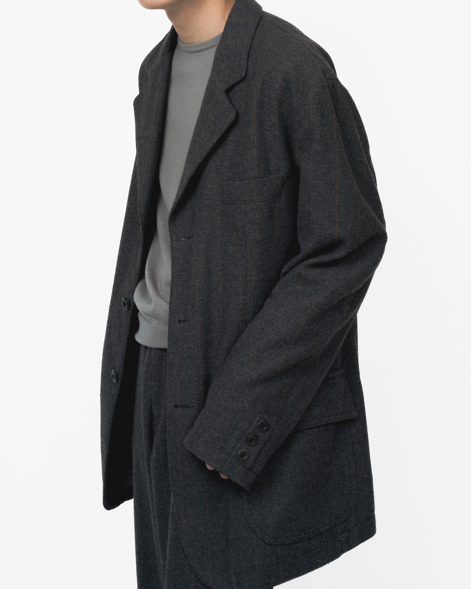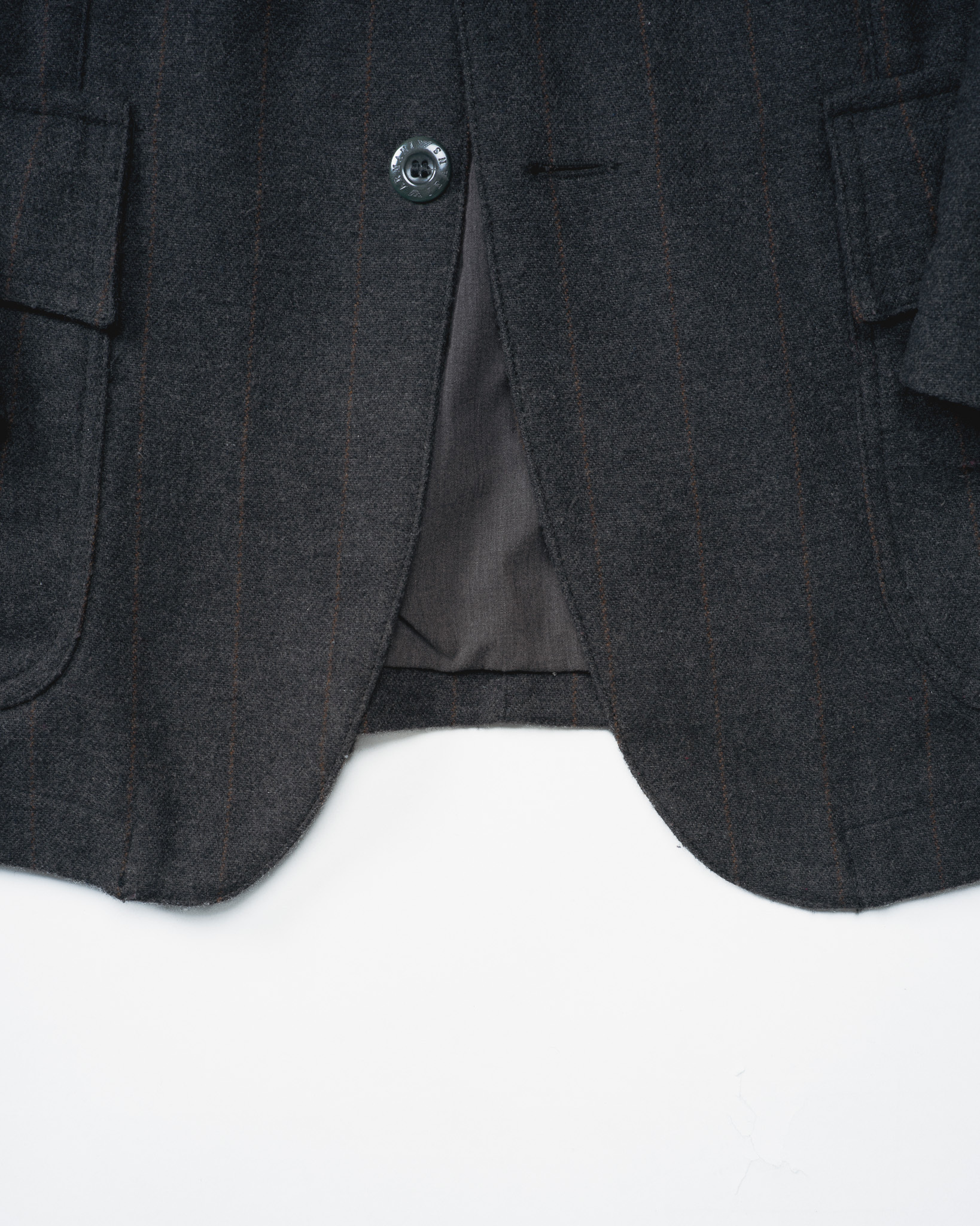 3つボタンのテーラードタイプながら、どこかワークジャケットのカバーオールとしての着用が思い浮かぶ不思議な感覚。