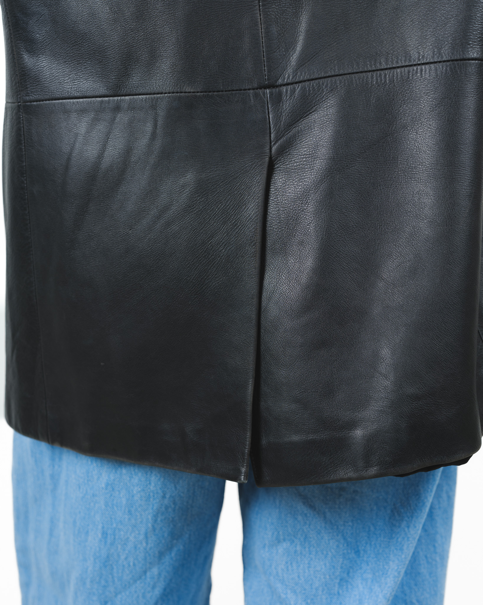 身幅やアームホールに意図的なゆとりを持たせたリラックス感のあるシルエット設計がなされており、タイトフィットが主流のレザーテーラードとは一線を画す、開放的な着心地を実現しています。