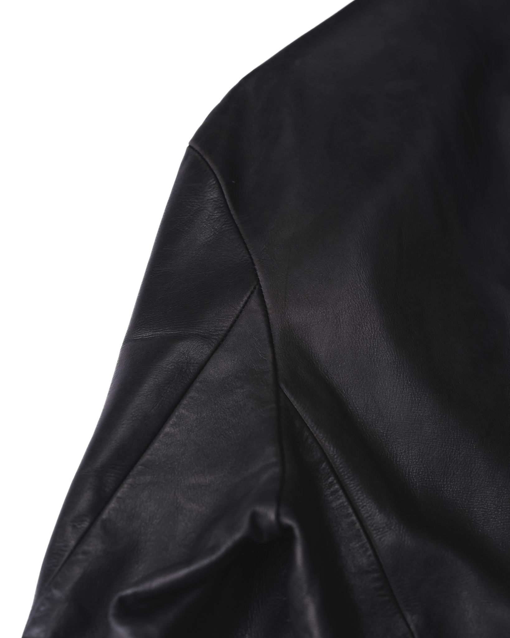 硬いレザーウェアの概念を覆すしなやかさは、着用者の身体の曲線に合わせて素直に落ち、布帛のジャケットに近い自然なドレープを形成。