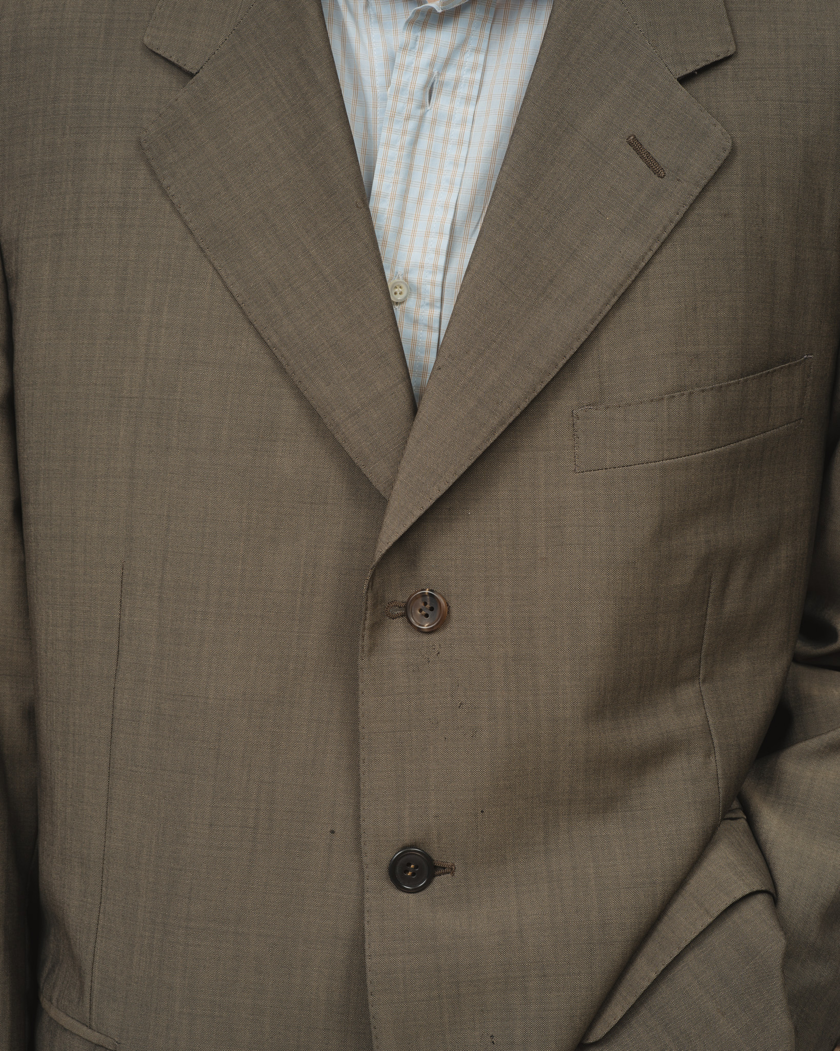 恐らく前所有者様の意向だと思われますが、袖が詰められておりまして、それ以前のボタンホールのステッチ跡がうーっすら見えます。