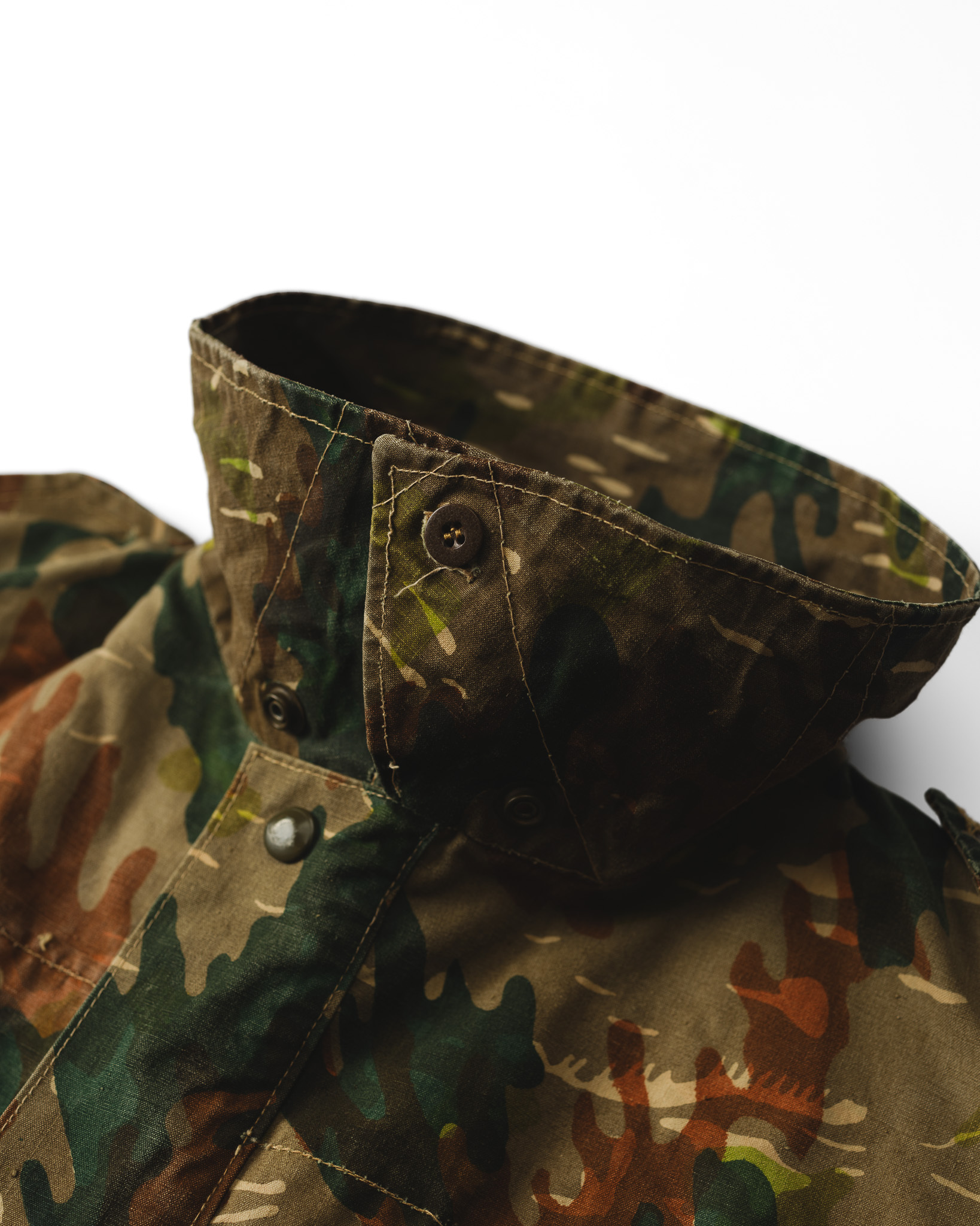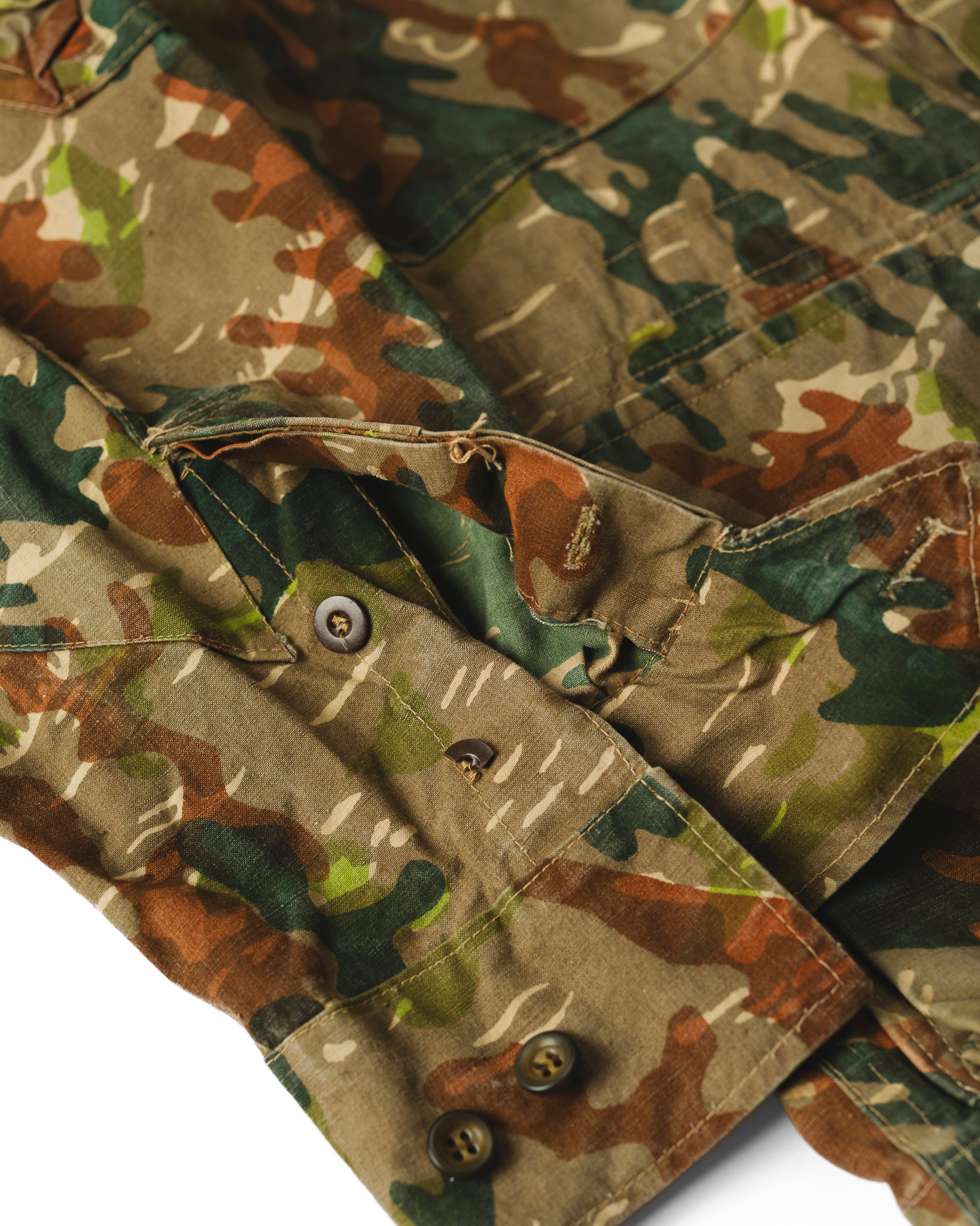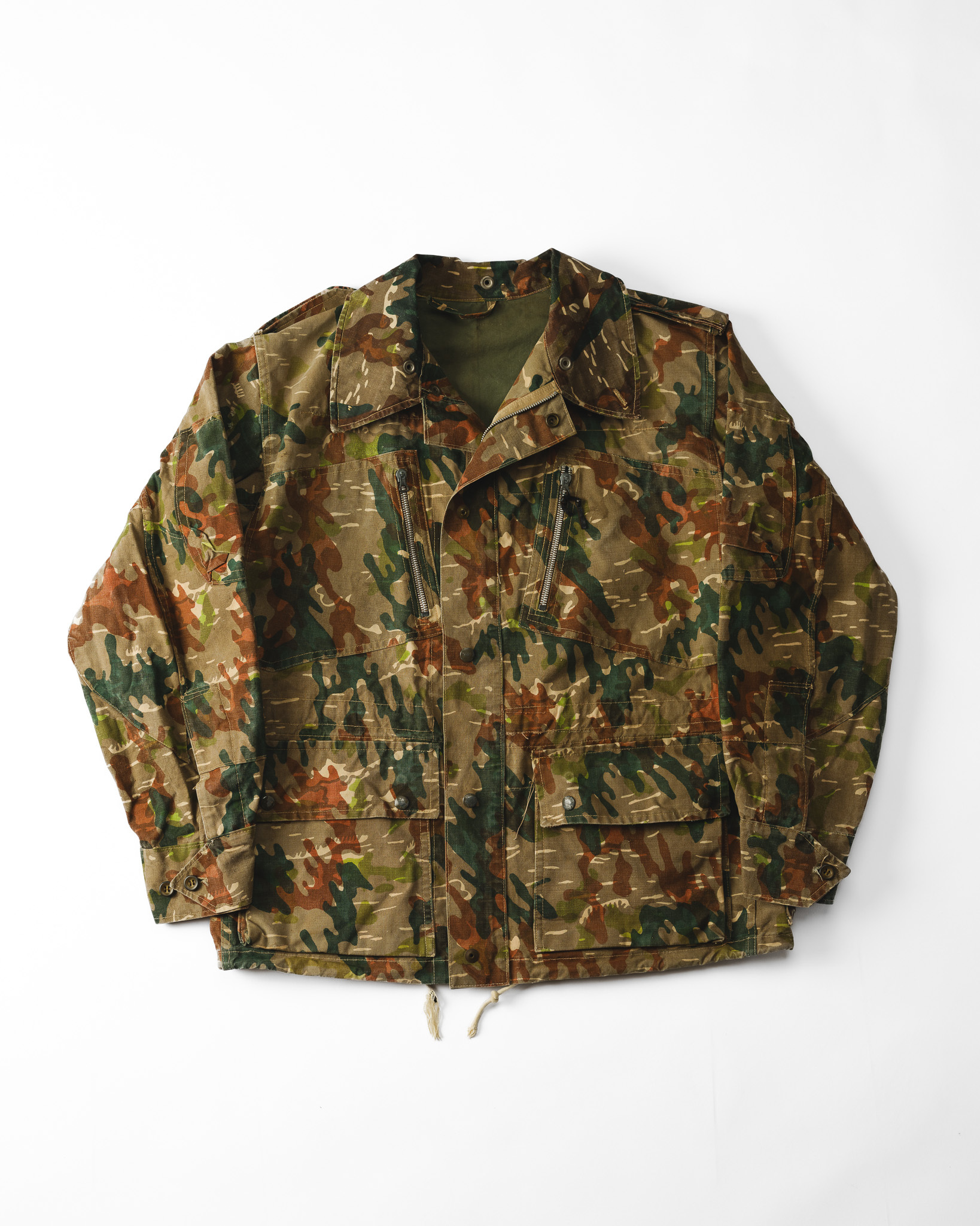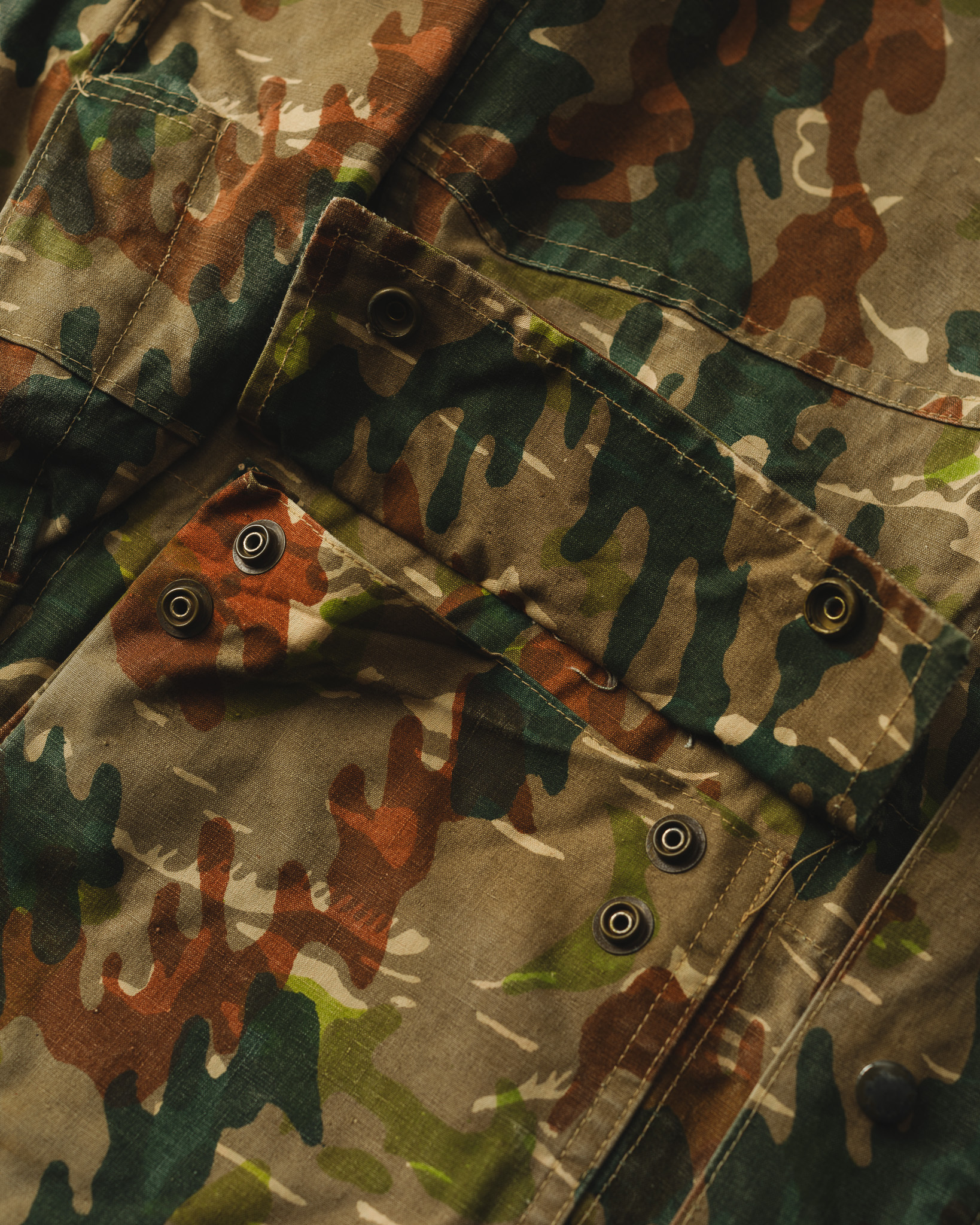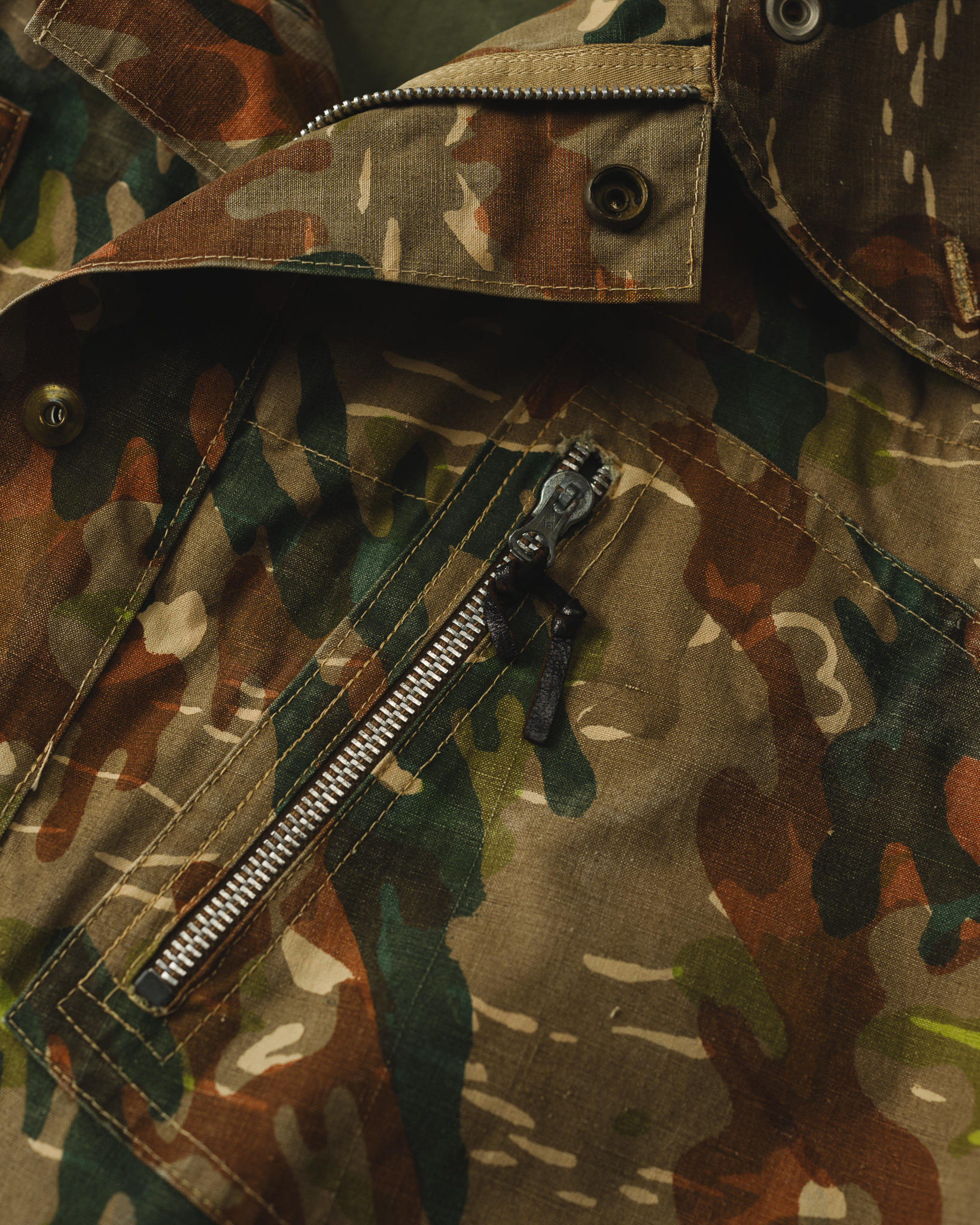 この計算された不規則性と独特の色彩感覚こそが、本作を単なる軍需品の枠から引き上げ、一着の優れたデザインピースとして成立させている最大の要因です。
