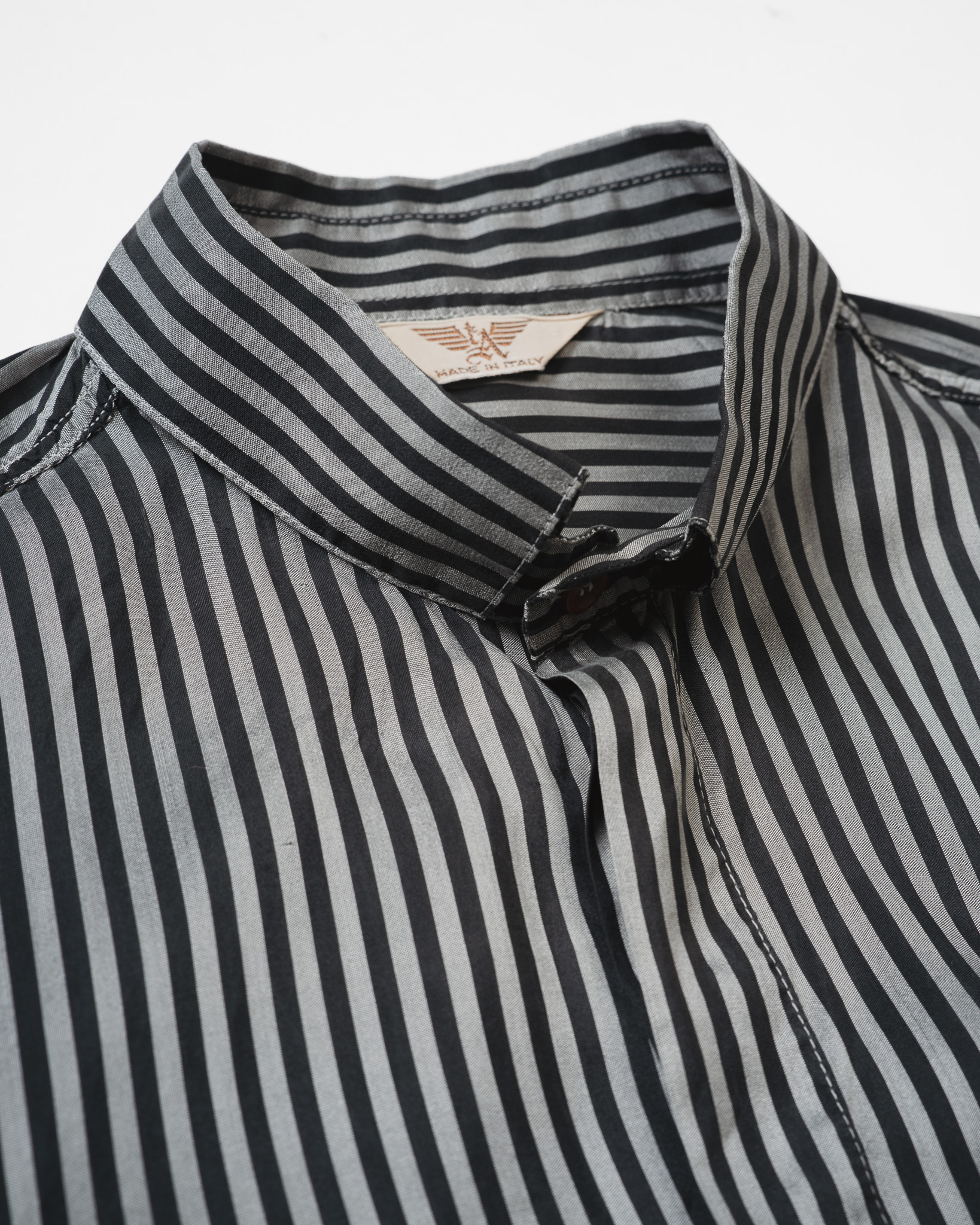 アルマーニと聞いて真っ先に思い浮かぶのは、力強くも流れるようなラインを描くスーツかもしれません。しかし、ブランドの美学はスーツに限らず、シャツの一枚にまで息づいています。本作は、その中でも「日常に寄り添うラグジュアリー」を掲げたセカンドライン、ARMANI COLLEZINONIによる一枚。90年代後半から2000年代初頭にかけて製作されたブラックシャツです。