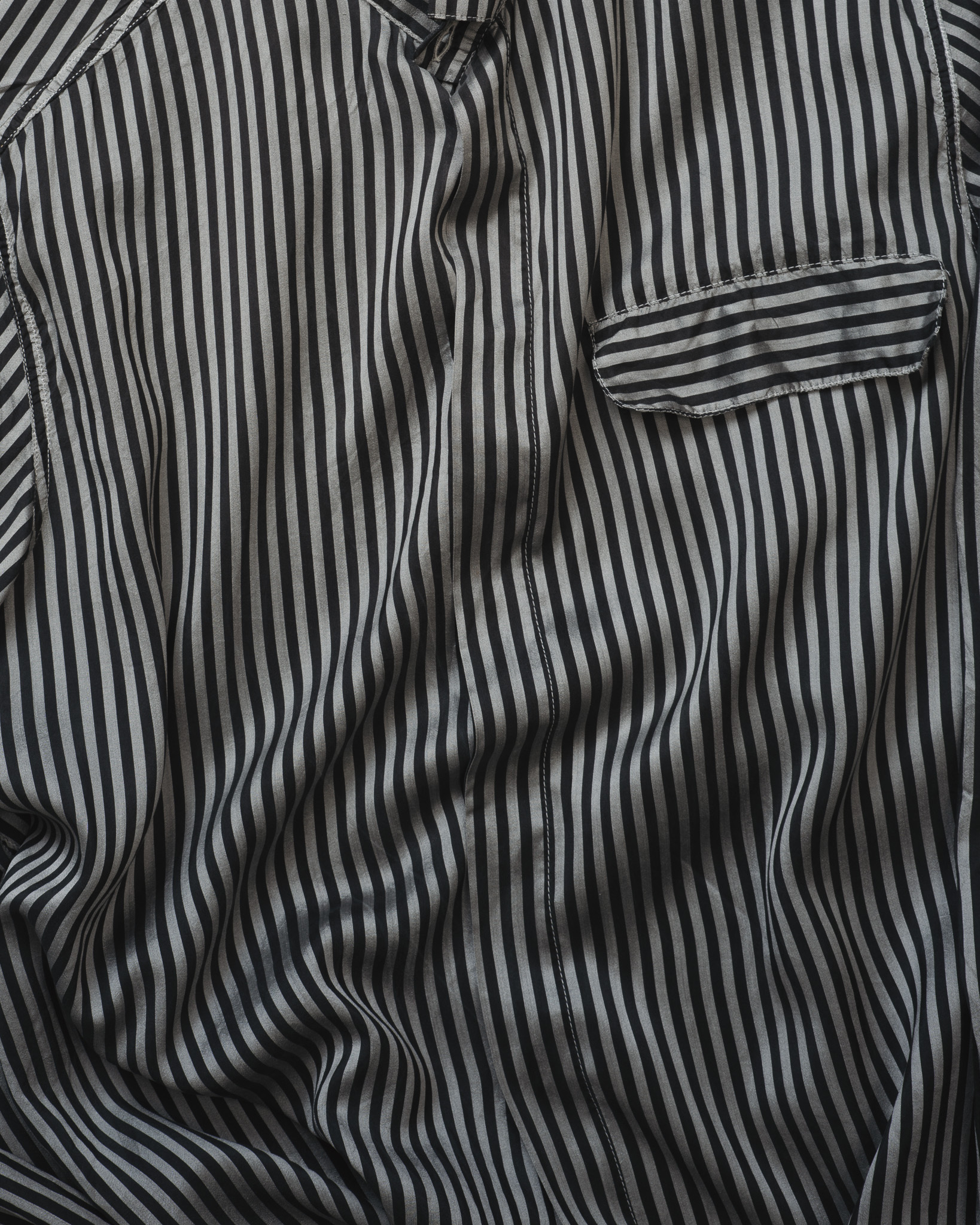 一見シンプルな黒のシャツですが、近づいてみるとすぐにその違いに気づきます。生地には細かな凹凸のあるテクスチャーが施されており、フラットな黒ではなく、光を受ける角度によって豊かな陰影を生み出します。