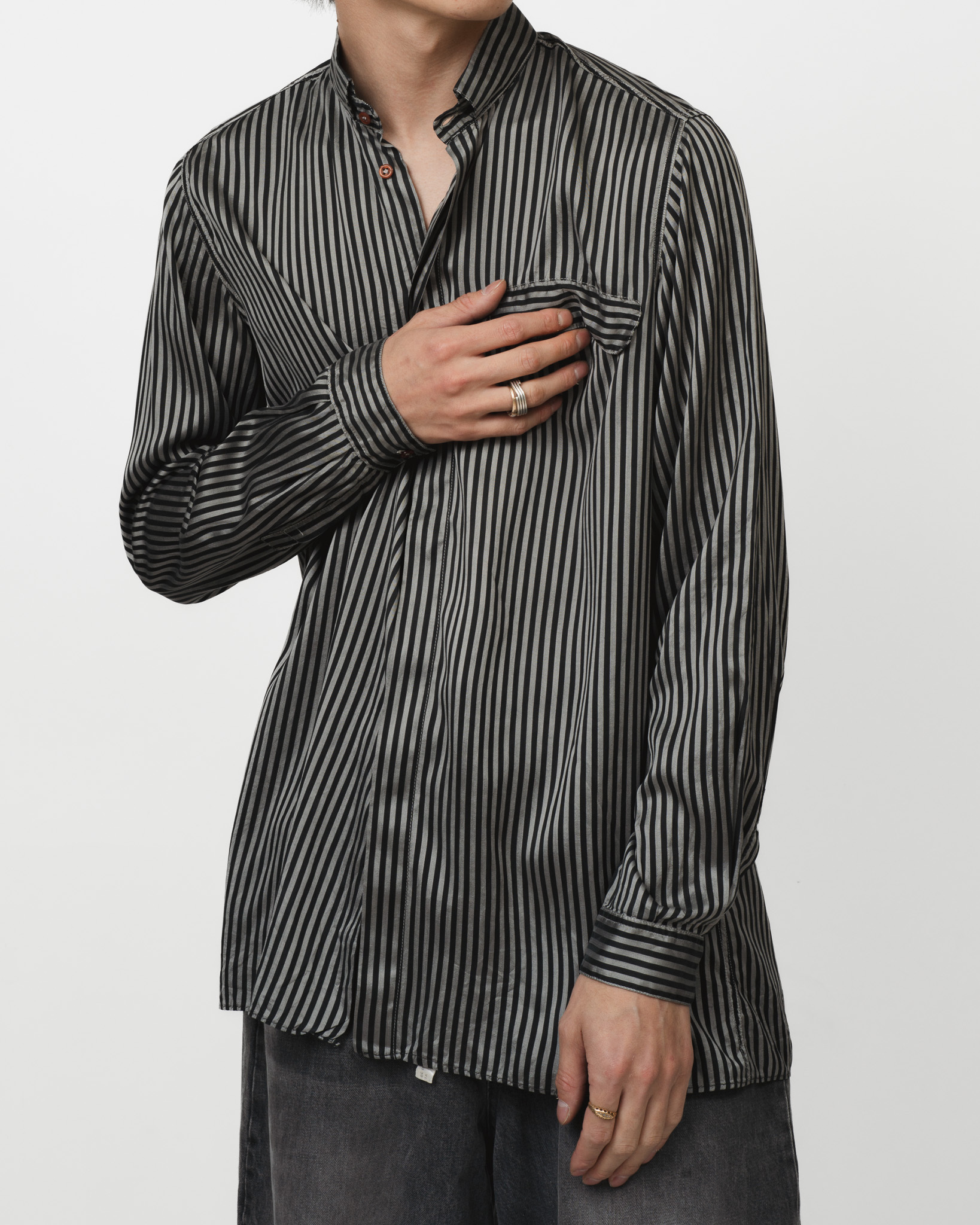 黒のシャツは数あれど、この一枚が特別なのは、単なる“黒”ではなく“陰影の黒”であること。そして、時代を反映したゆとりあるシルエットが、今の空気感とも絶妙に呼応していることです。トレンドを追いかける必要のない、完成されたミニマルデザインの美しさ。その背景には、アルマーニが一貫して追求してきた「日常の中にあるエレガンス」という哲学が確かに息づいています。