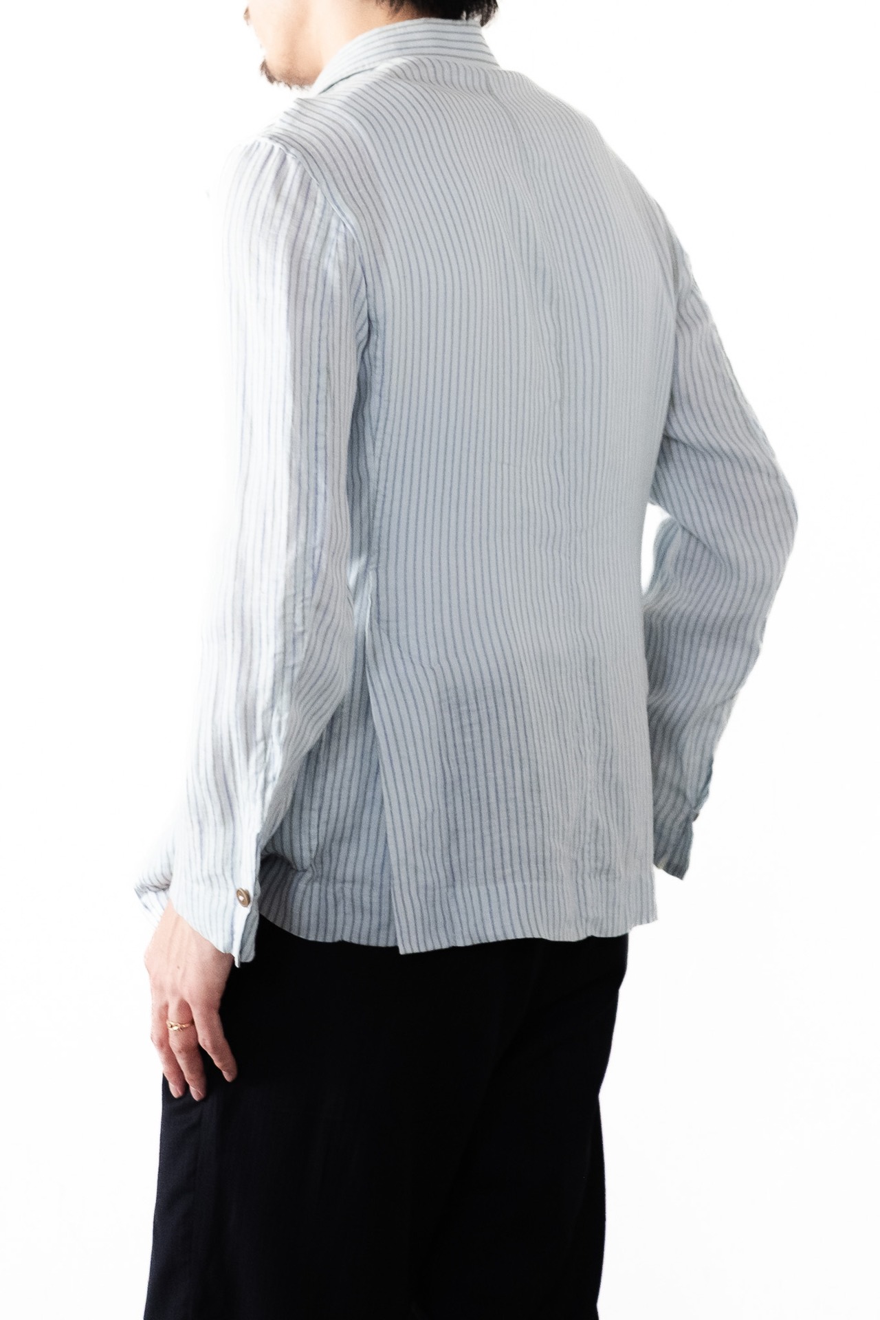 ここでご紹介するのはそんなARNYSの精神を余すことなく映し出す、リネン100%のサマージャケット。ネイビーやグレーといった定番色ではなく、淡いブルーグレーを基調に、ブルーとグリーンの細いストライプを織り込んだ生地は、視覚的に涼やかでありながら、よく見ると奥行きのある表情を見せます。