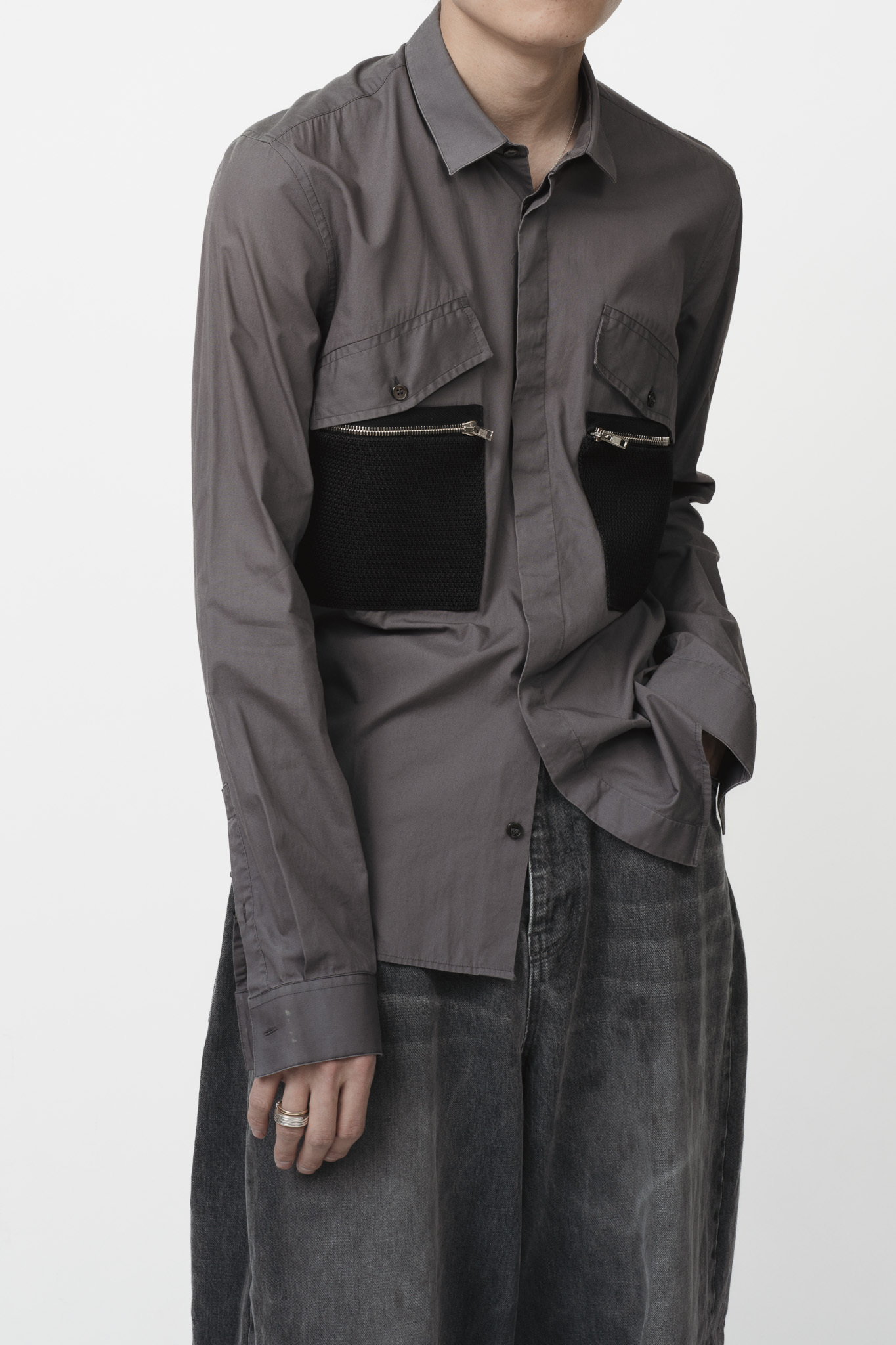 ハリの良いグレーのコットン素材に、胸元に設けられたフラップ付きの大きなポケットと、その下の別素材を使用したファスナーポケットが何とも目を惹きます。