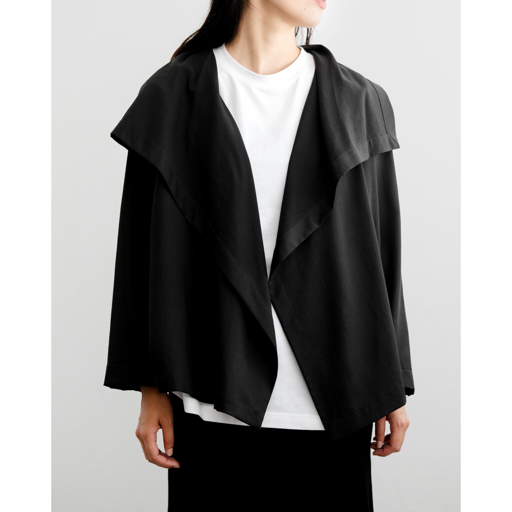 ケープとも、ポンチョとも、はたまたシャツやジャケットとはまた違う独特な作りのこの一枚は、目まぐるしく変わるシルエットが非常に雰囲気を放ちます。