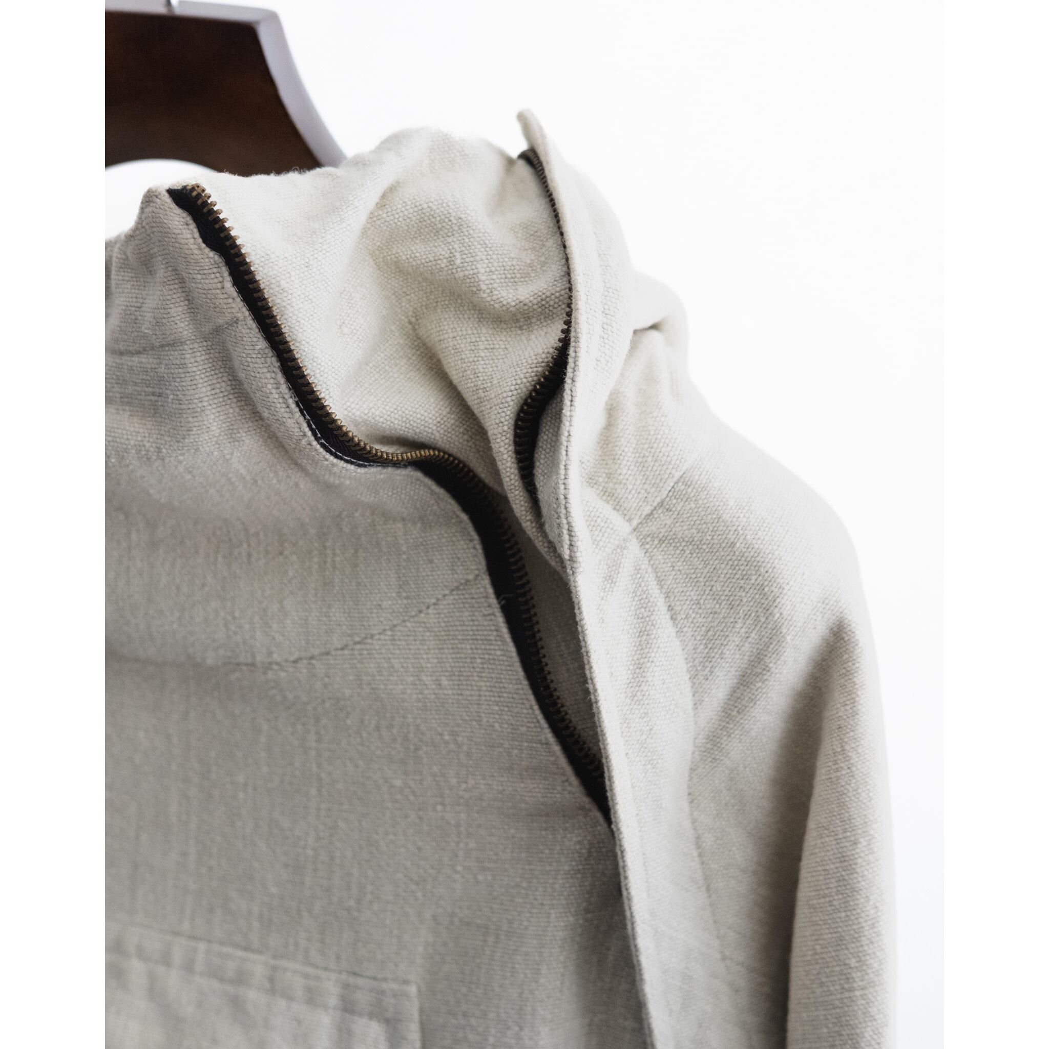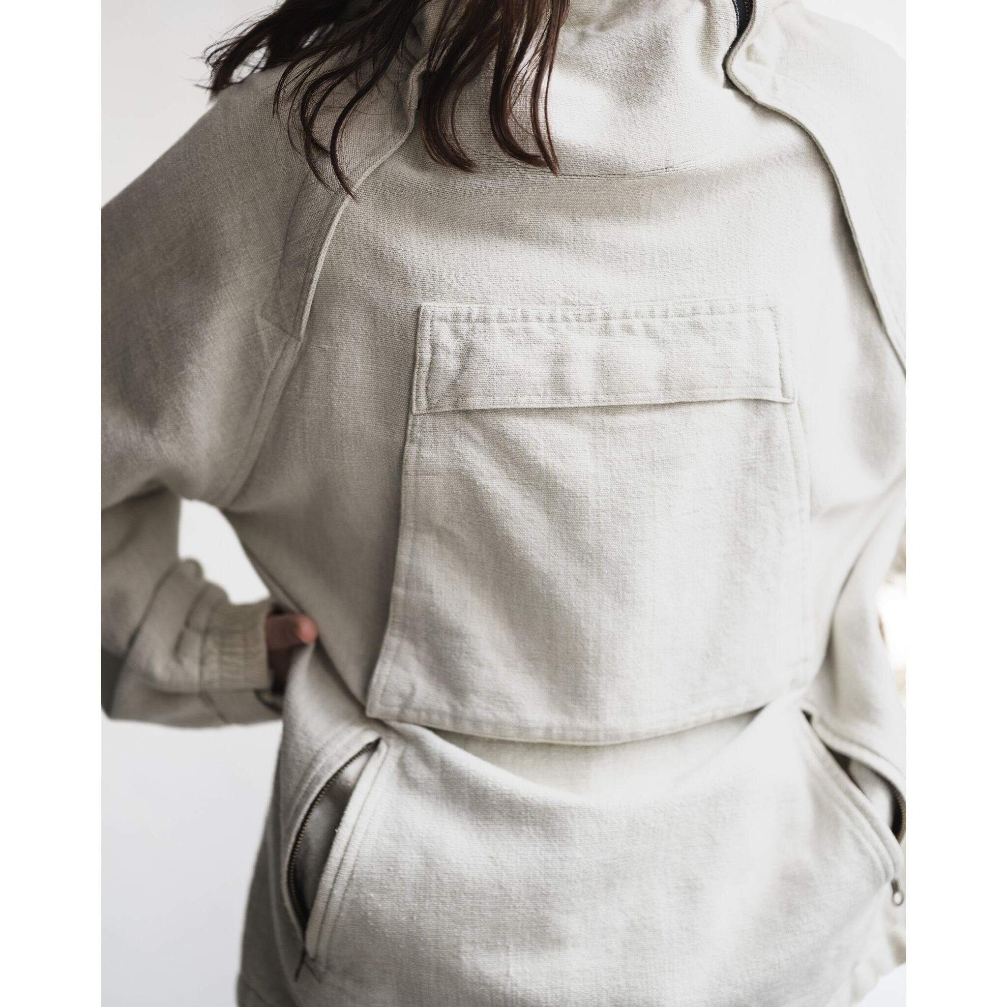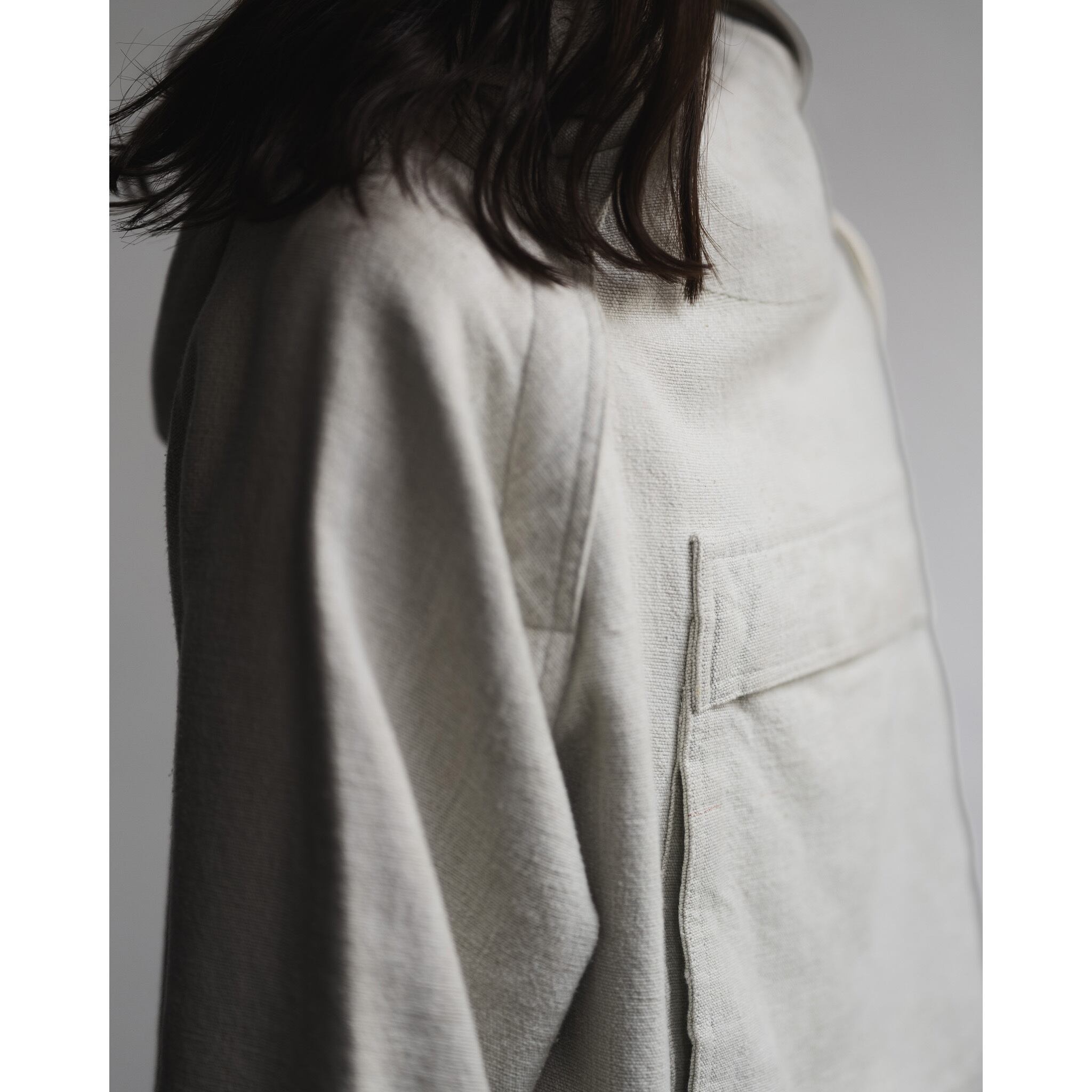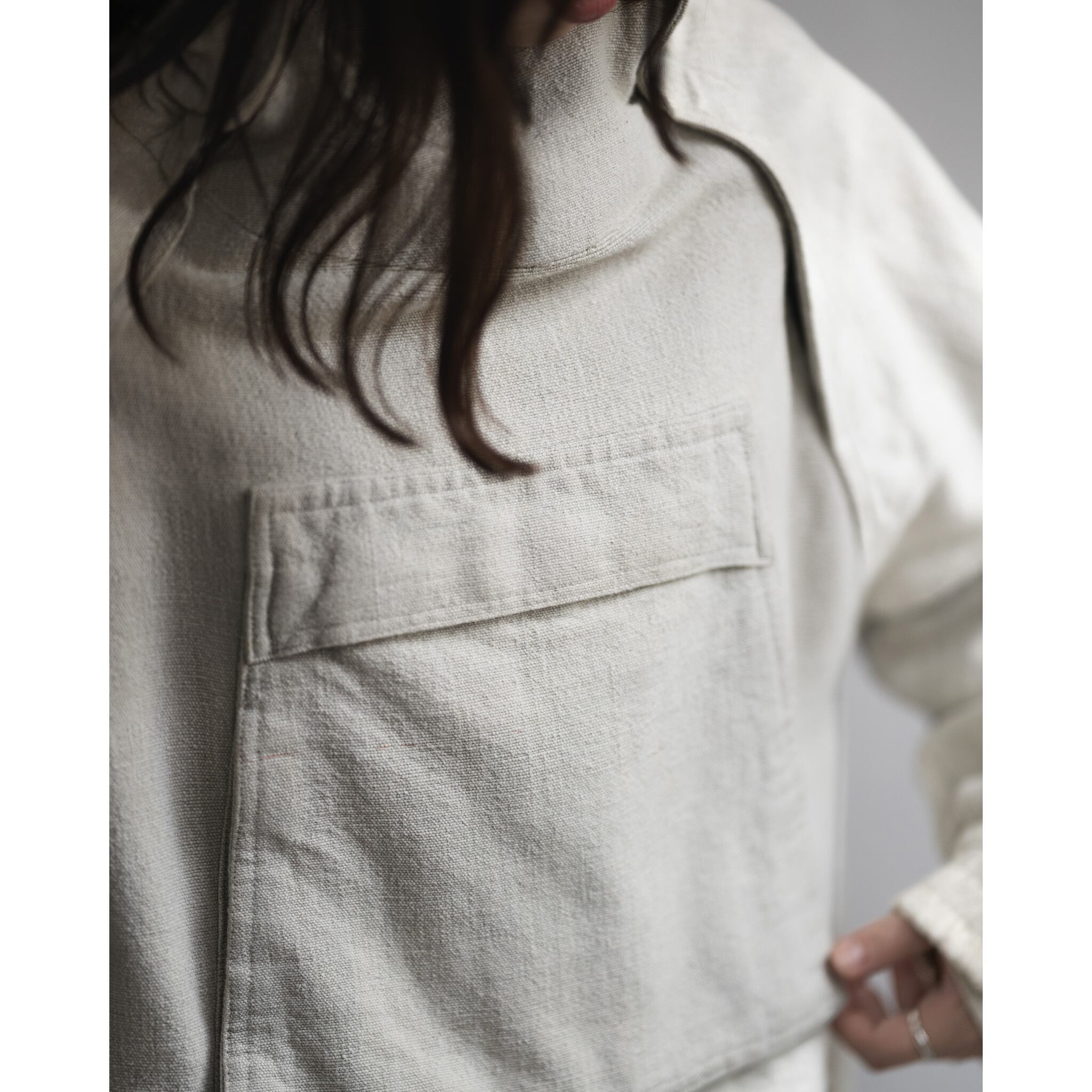 ざっくりと織られた、ネップ感の強いコットンキャンバスの生地に、独特なディテールの組み合わせが非常にユニークです。