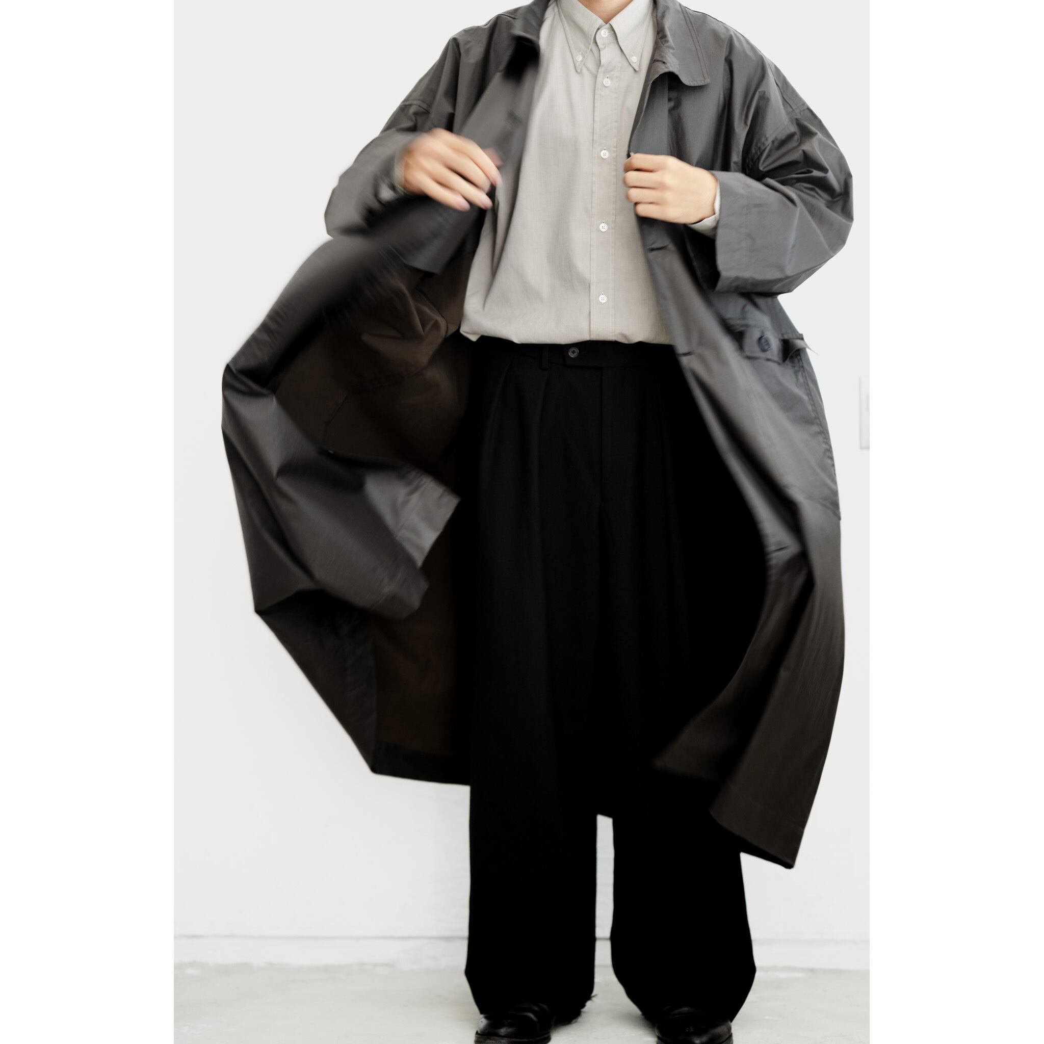 生地感を生かしたドレープと、テクニカルなパターンワークは、光の当たり方や身体の動きによっても勿論、着用者によっても変わる表情。